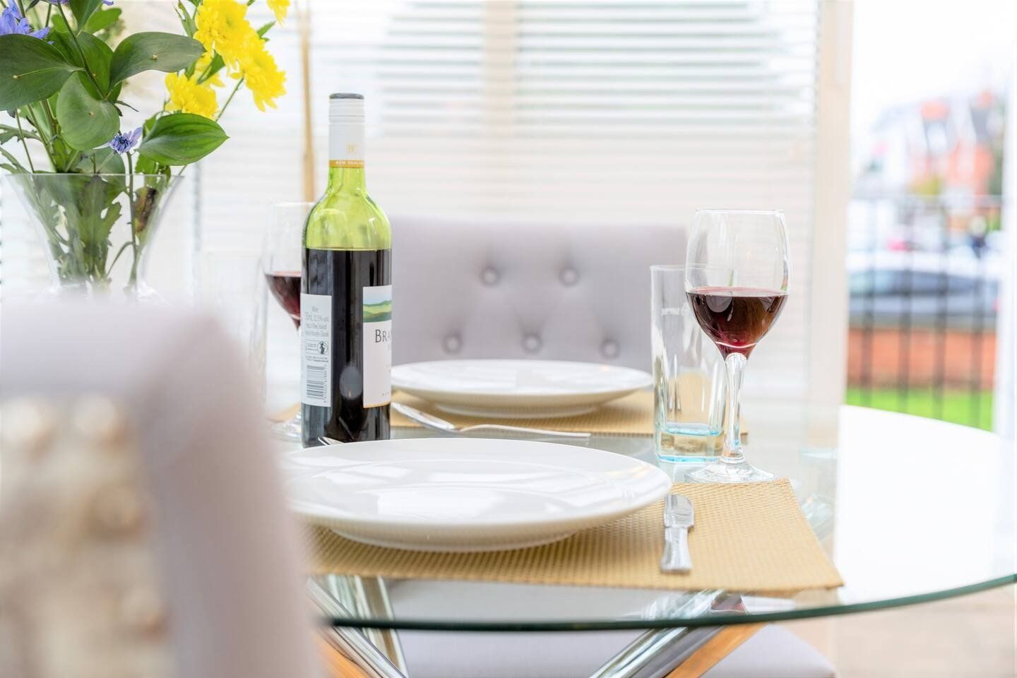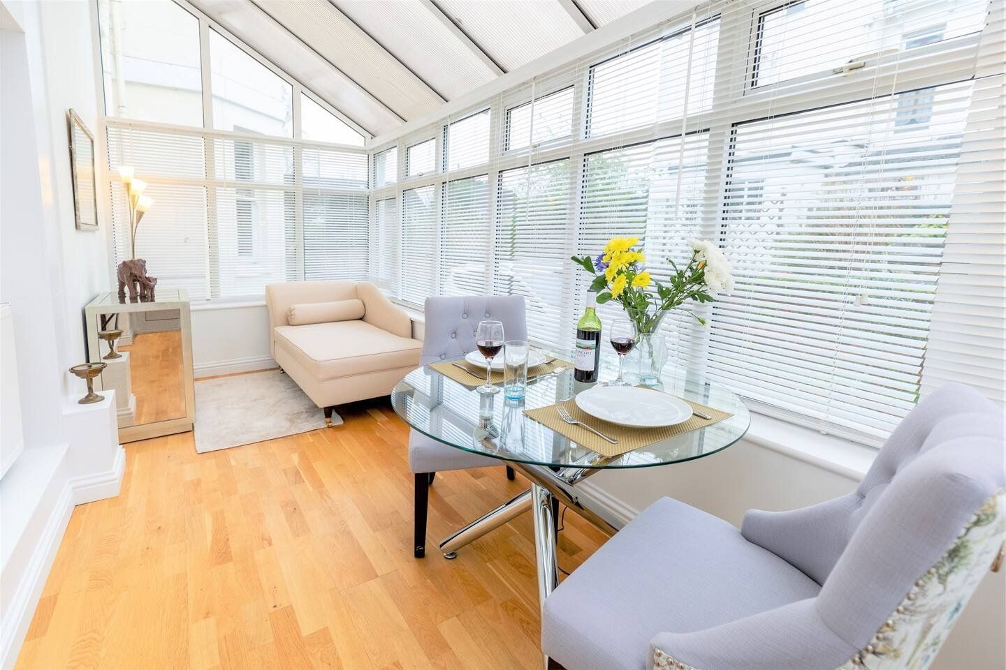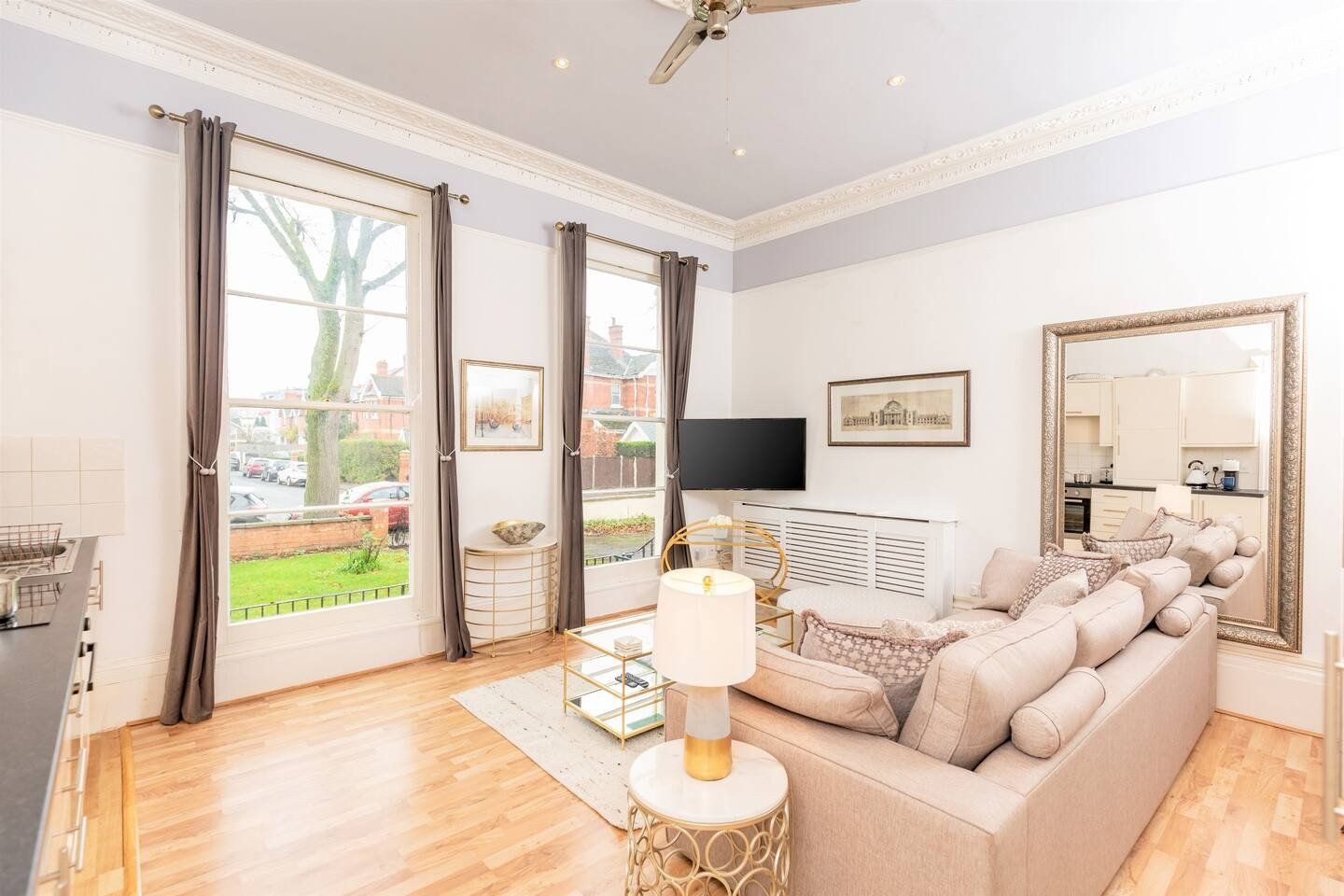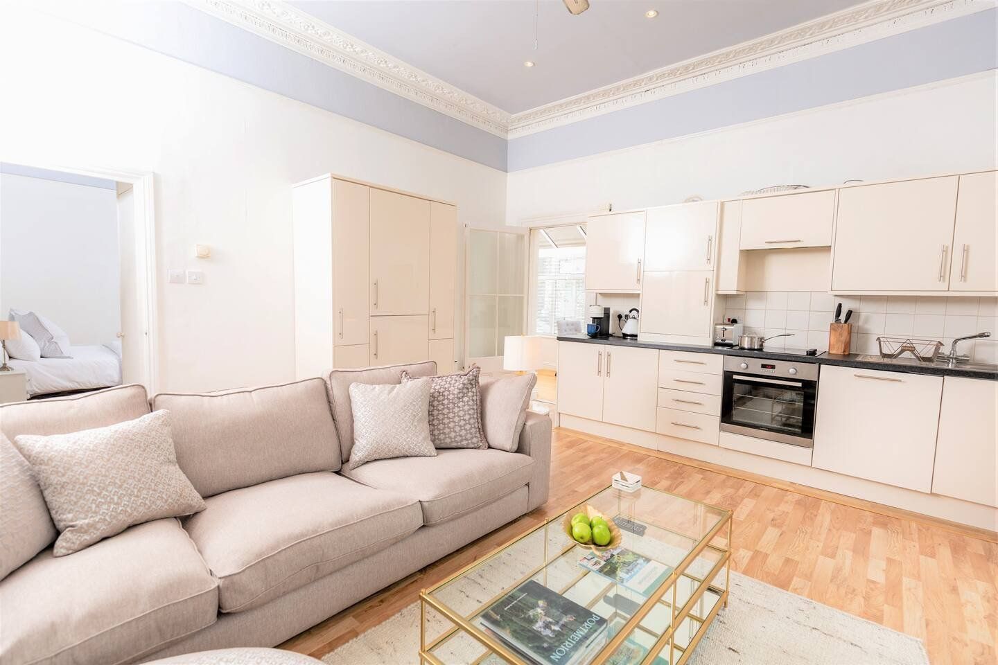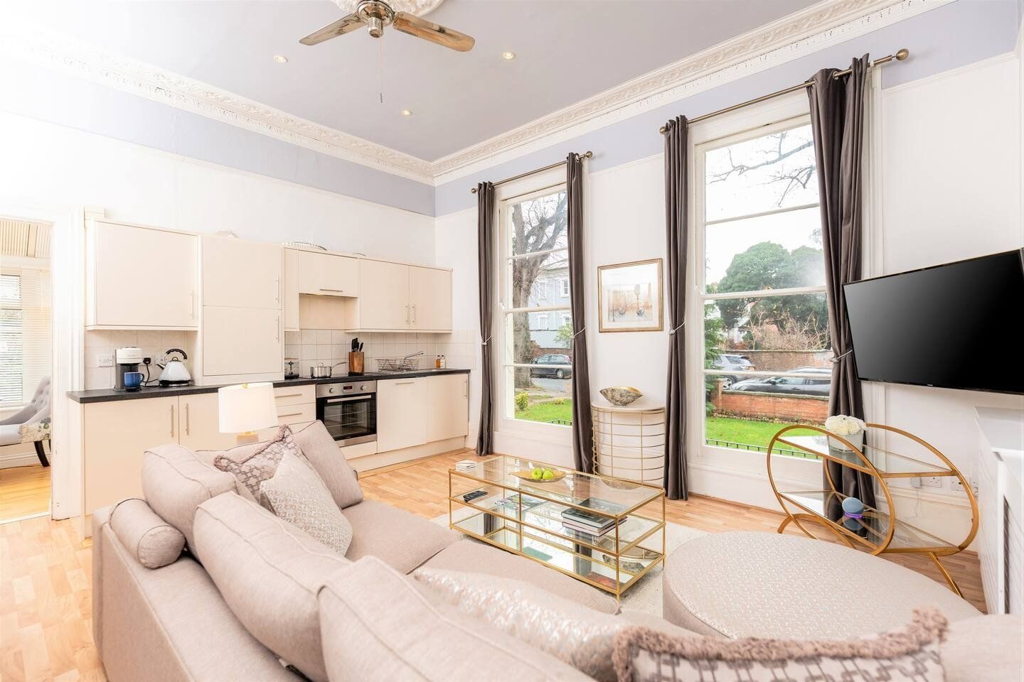 Situated in the heart of Cheltenham, this cute one-bedroom apartment provides the perfect base for those in town for a weekend escape or here on business during the week. Enter via the light and airy conservatory featuring an elegant dining area and a plush chaise longue which also doubles up as a study or spot to work from home if you're bringing a laptop. It's a beautifully soothing space to relax and unwind with a glass of wine in hand. The open plan living area and kitchen is equally as relaxing – decked out in a cream colour palette with warm tones, pale wooden flooring and sumptuous golden accents throughout. Huge floor-to-ceiling length windows invite in plenty of natural daylight and you'll have a grassy view of the lawn out at the front too. Perfectly positioned to explore Cheltenham and a wealth of pleasant eateries, pubs and shops on foot, the University of Gloucestershire is also just 3 kilometres from the apartment, while the Cheltenham Cricket club resdies right behind the property – only two minutes away.