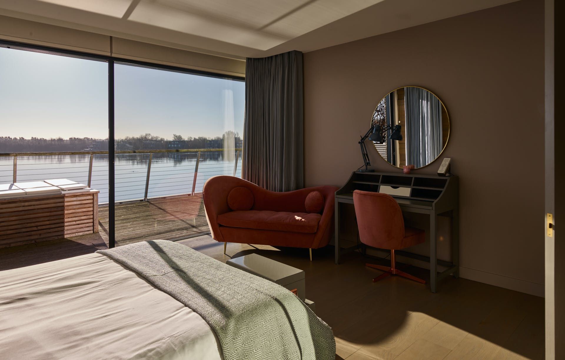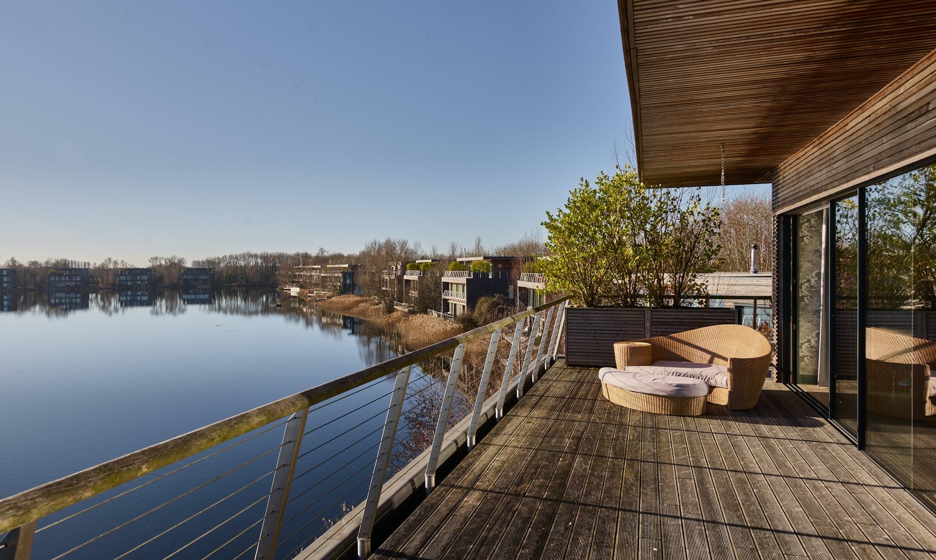 The kitchen is a haven of modernity, with a sub-zero wine fridge to keep whites crisp and cool and chiller cabinets for the barbecue salads. Gather the group at the banquet-sized dining table with its quirky egg chairs for a huge family meal and open up the doors to the lake view. There are plenty of mod cons to keep the group entertained, like the flatscreen TV, but also a collection of books and board games to make the most of the tranquillity of your location. Should you need to work remotely there are desks in the bedrooms and a dedicated office space with floor-to-ceiling windows.