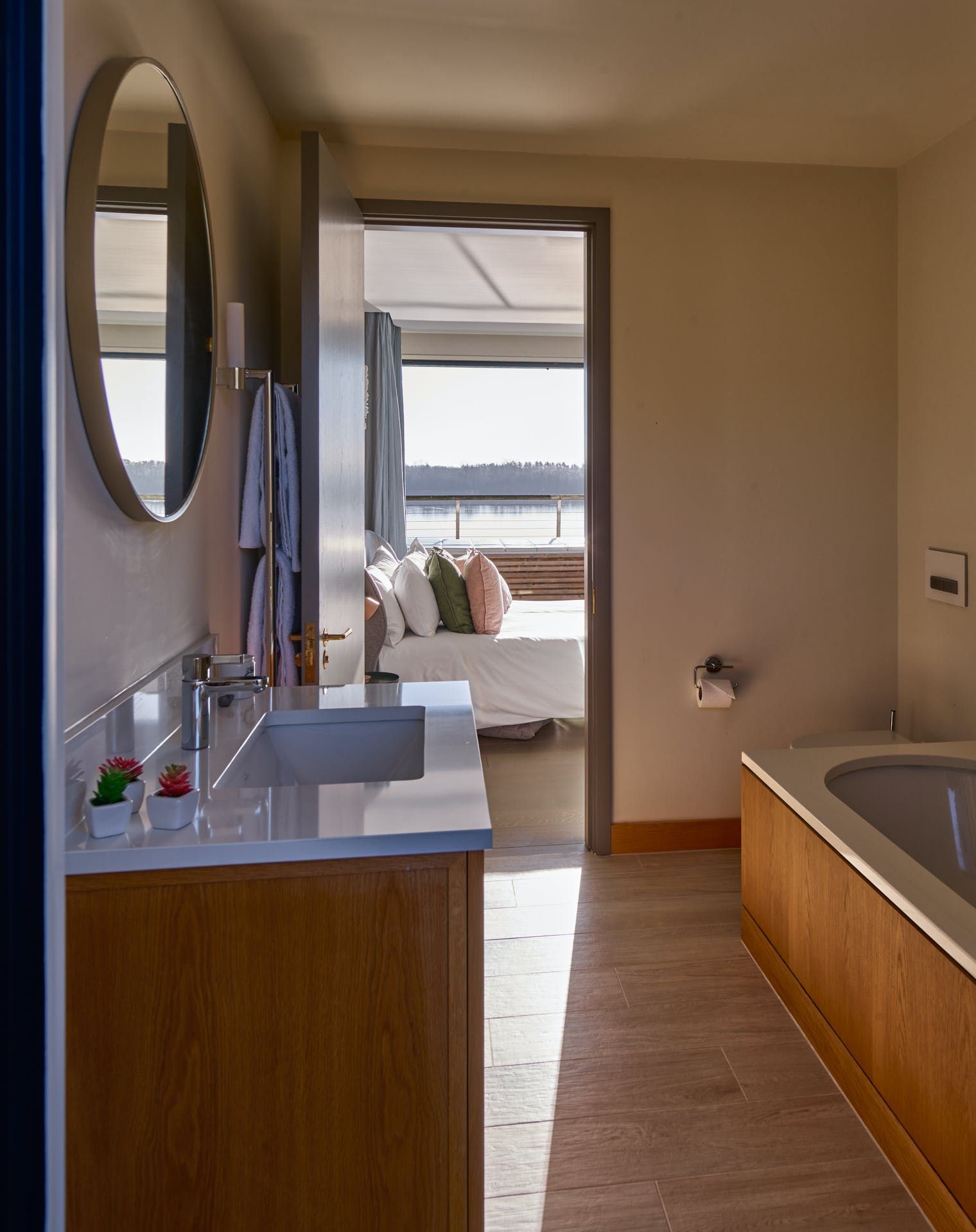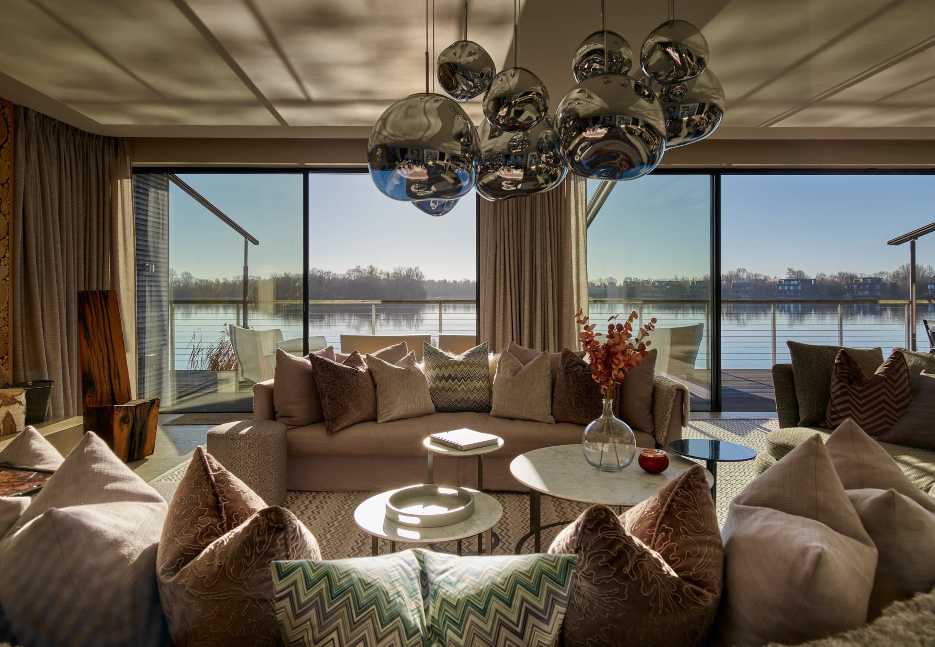 On a private estate in the heart of the Cotswolds, this grand, glass-fronted home sits right on the water at Lake Bowmoor. The wooden deck, furnished with luxury loungers, sofas and a dining table for the whole group, juts out over the calm lake and from here, you can spot ducks, swans and divers as you dine. To the side of the house, you’ve got your own eight-person motorboat for a cruise across the lake, and kayaks and paddleboards too. There’s a covered hot tub should you wish to unwind after. Glass doors to blend indoors with outdoors so you can pick one of the lavish circular sofas inside and still enjoy the sights and sounds of the lake with the doors pulled back.