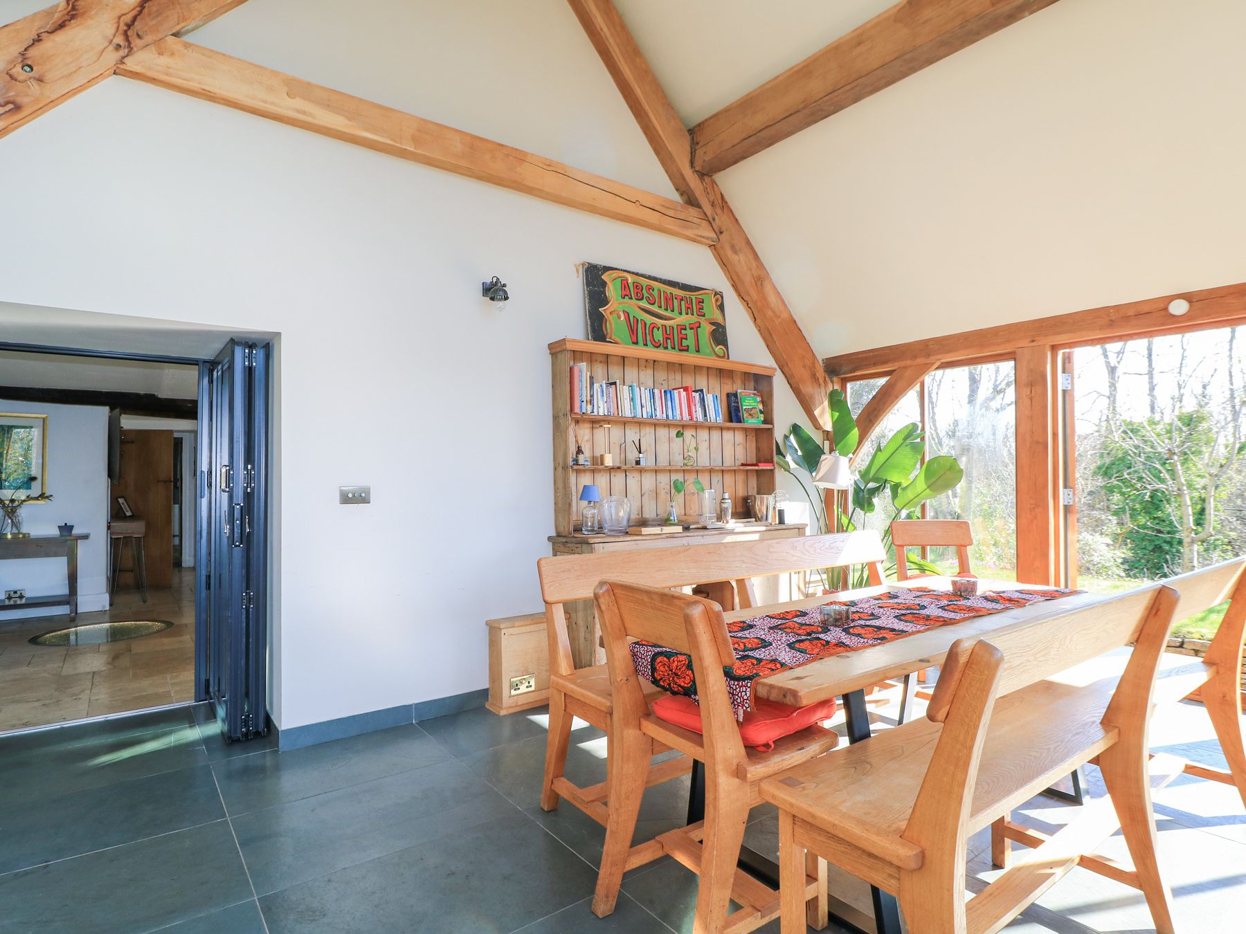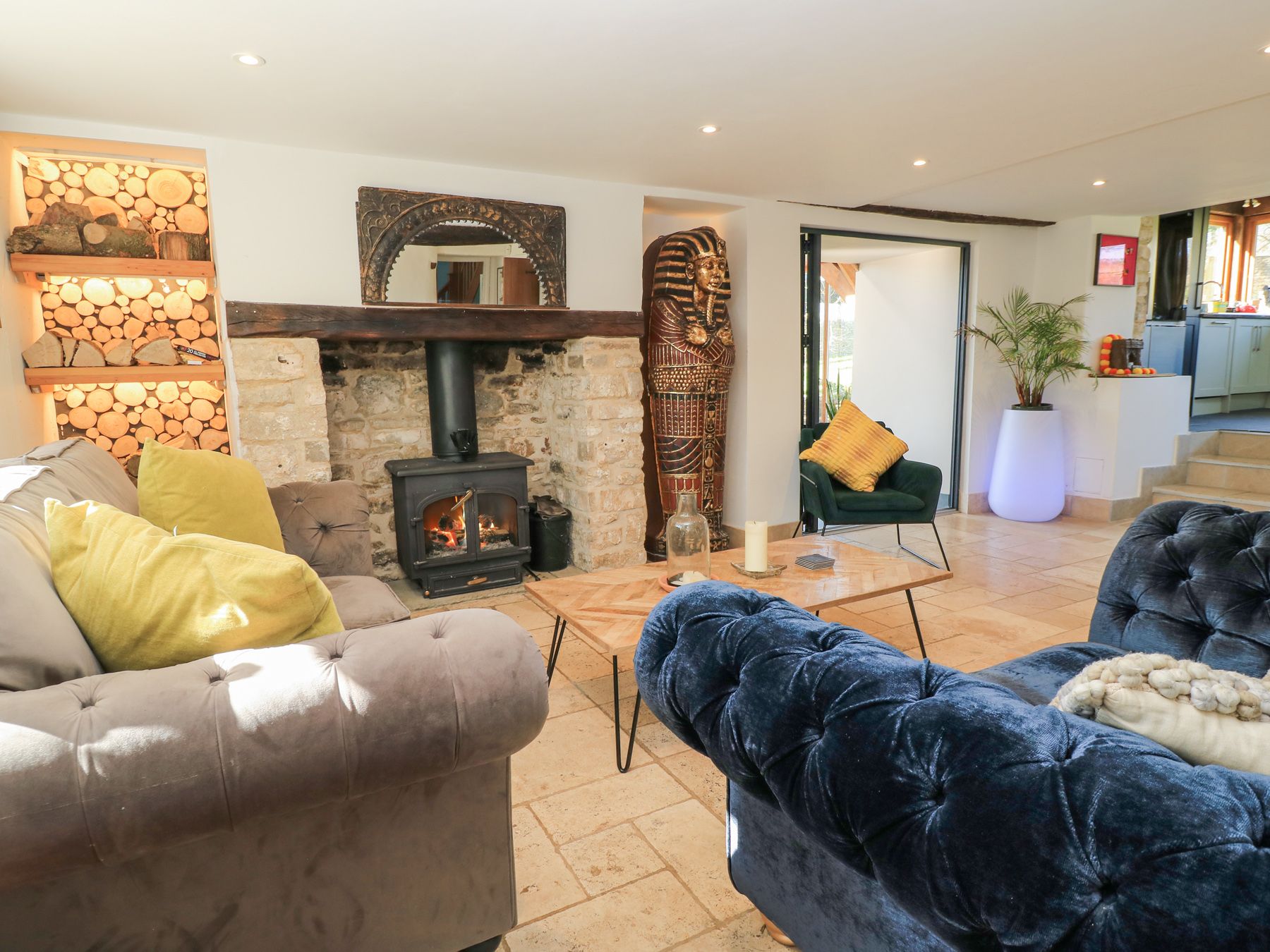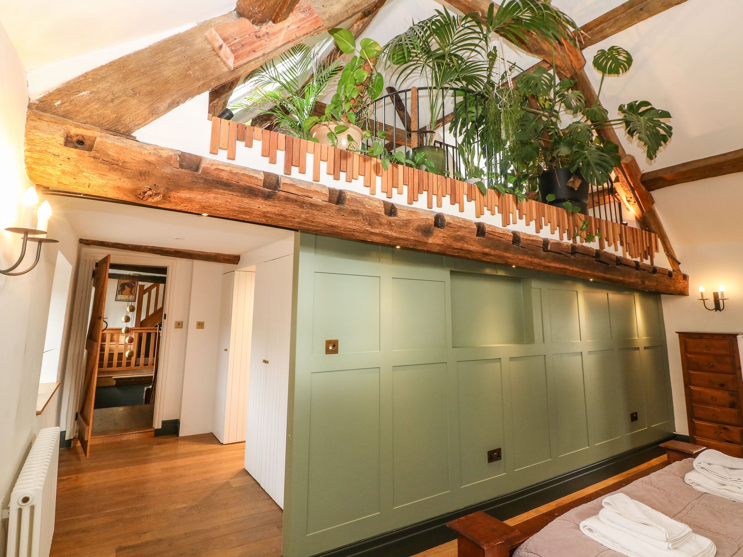 Amenities Oil central heating, 4 woodburning stoves in the main house. Electric oven and hob, fridge/freezer, microwave, toaster, kettle, coffee machine, dishwasher, washing machine, TVs, a selection of books and games and WiFi. Fuel, power and starter pack for woodburners inc. in rent. Bed linen and towels inc. in rent. Cots x 2 and highchairs x 3 available. The mezzanine comes with a Japanese deep bath. Spiral staircase. Covered Pergola, Outdoor Pizza oven, full BBQ and outdoor kitchen space. Underfloor heating. Off-road parking for 5 cars. Front enclosed lawned garden and patio area with furniture and barbecue. One or Two behaved dogs welcome. Sorry, no smoking. Pub 3/4 mile and shop 2 miles. Outside shower and toilet. Wild swimming pool with decked area. (Note: whilst the pond and plunge pool are in a separate, gated part of the garden, children must be monitored at all times when outside). Electric gates. Please Note: there is a charge of £30 per day for the combined use of the sauna and hot tub, this will be paid directly to the owner prior to arrival. If you would like to use the Gym, please note the Owner charges a £40 fee per stay to use this facility. Please note: The top floor features two quirky rooms with low beams and Hobbit-sized doors.