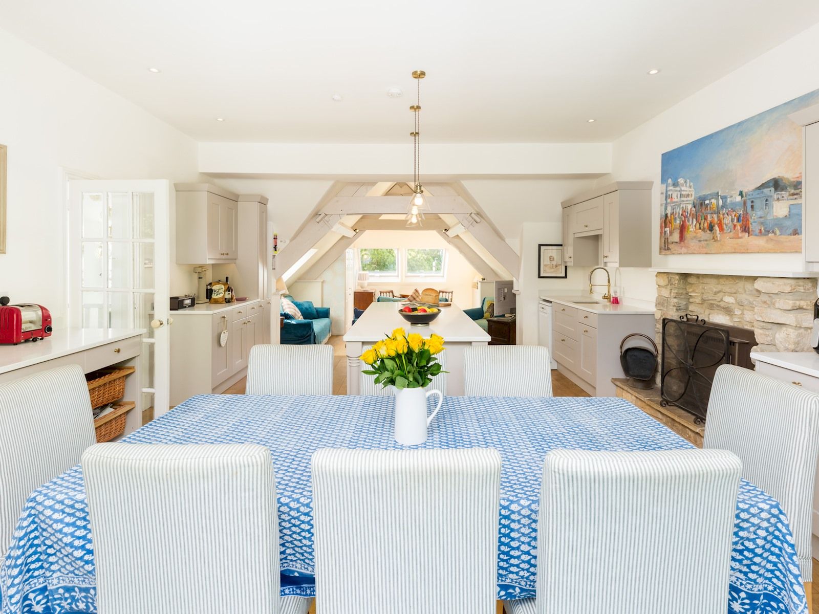 For larger groups looking to explore some of the most striking villages in the Cotswolds, this four bedroom delight in quiet Great Rissington is a real standout. The home is somewhat inverted, with three of these bedrooms on the ground floor and a large open plan living area upstairs. Across these levels you'll also find three bathrooms, a utility room, a study with garden views, and a modern kitchen with doors leading out to a bright and characterful raised terrace. Besides space and comfort, the house is also located just south of two popular Costwolds destinations in Bourton-on-the-Water and Stow-on-the-Wold, with both reachable by car in around ten minutes.