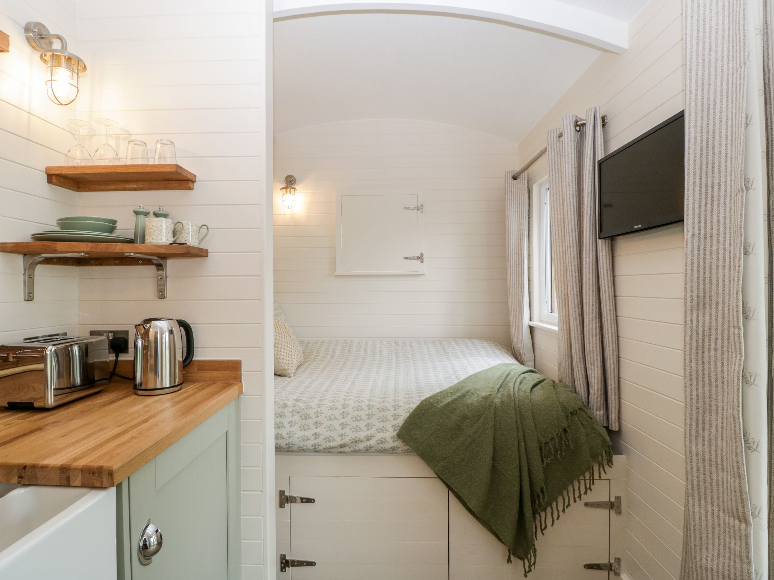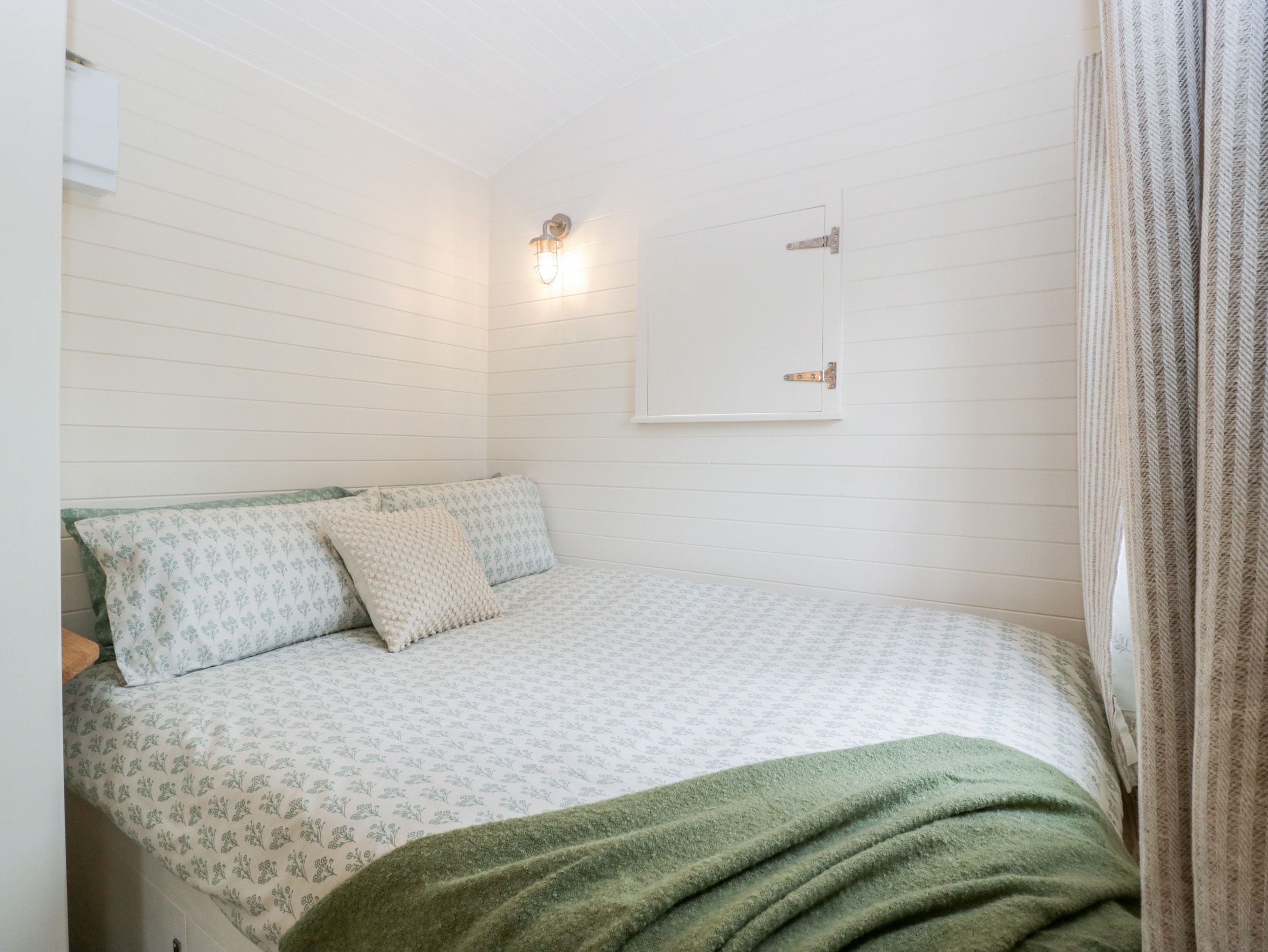 Holiday home Hazel, a studio-style shepherd’s hut, comprises a studio-style layout with a double bed and a kitchenette, serviced by a shower room. Appliances include an electric oven, two-ring induction hob, fridge with ice box, and a Smart TV. Outside, there is off-road parking, with available EV charging. Within 0.2 miles, you will find a shop, train station, and pub. Please note, this is a non-smoking property. WiFi, fuel, power, bed linen, and towels are all included in the rent. Bring your loved one for a romantic escape to Hazel. Note: Steps up to property may be unsuitable for those with limited mobility. Please note: Dogs are not permitted on the furniture.