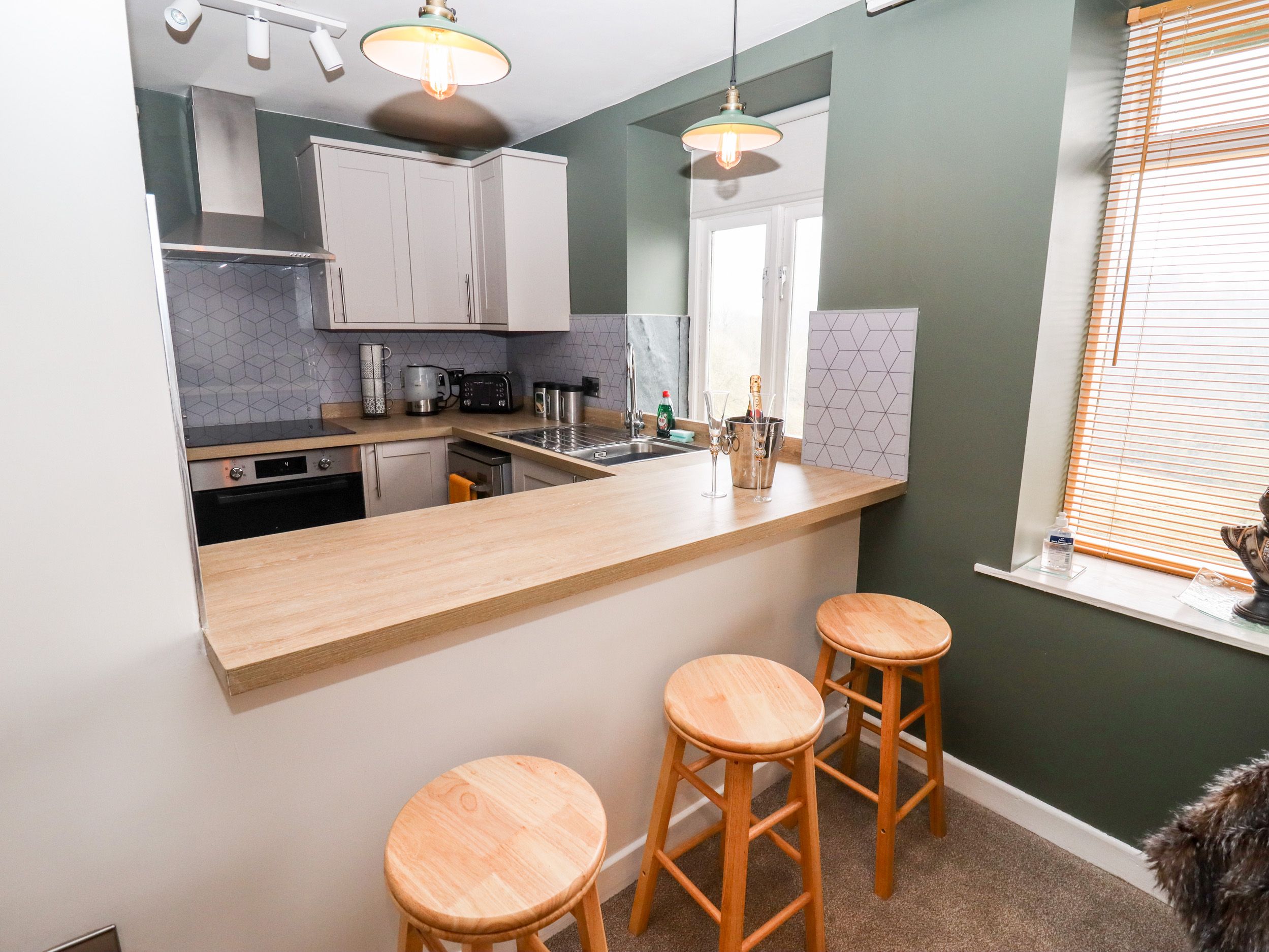 Accomodation Details First-floor apartment. Two bedrooms: 1 x king-size double, 1 x twin. Shower room with walk-in shower, basin and WC. Kitchen. Living/dining room with Electric fire