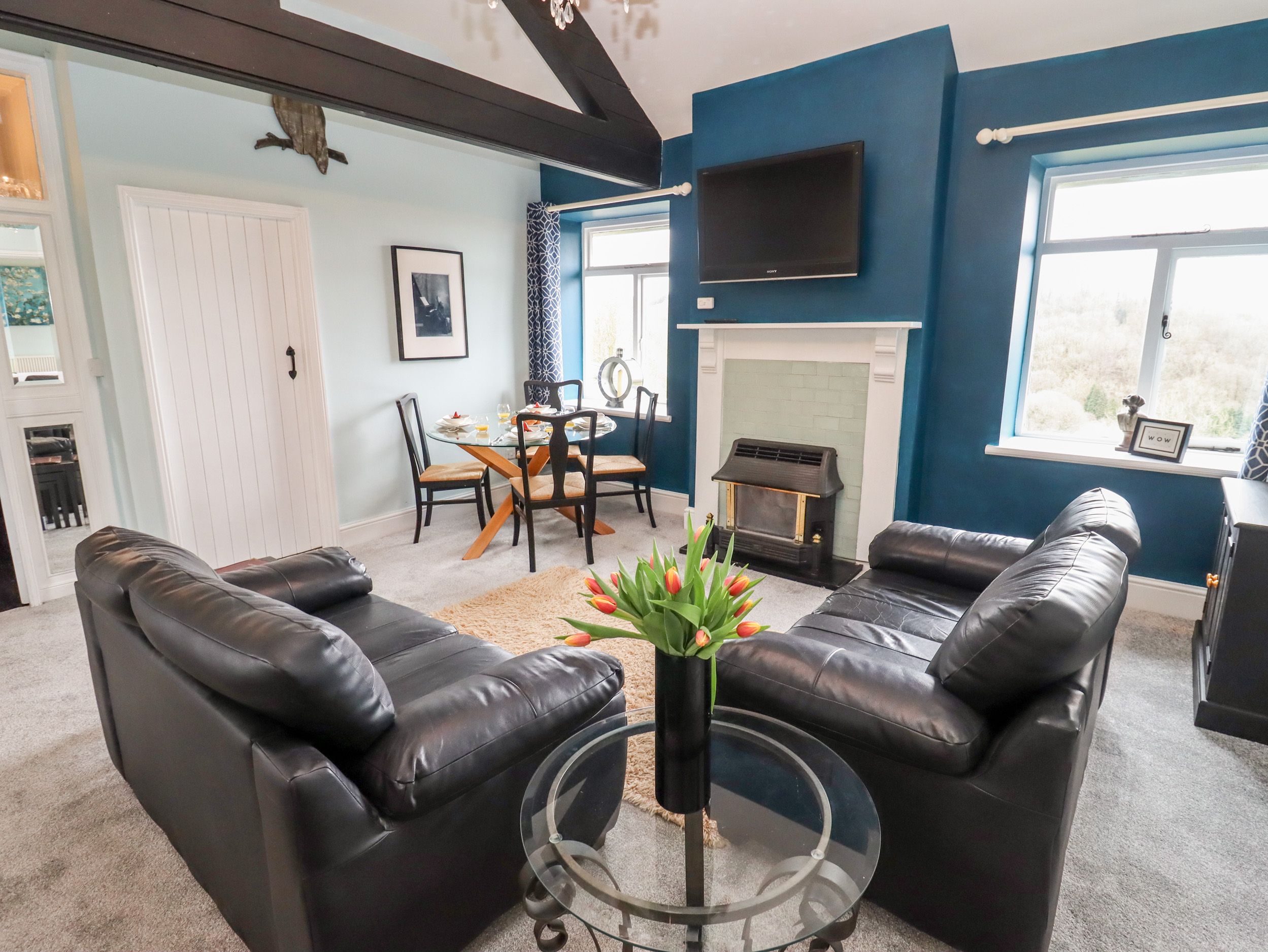 Amenities Electric storage heaters with gas fire. Electric oven and hob, microwave, fridge/freezer, washing machine, dishwasher, TV with Freeview, WiFi. Fuel and power inc. in rent. Bed linen and towels inc. in rent. Off-road parking for one car.unless by prior arrangement. Secure bike storage with electric charging point for bicycle only. Shared gardens with four unfenced ponds, and private seating area with furniture. Two well-behaved dogs welcome. Sorry, no smoking. Shop 0.2 miles, pub 0.4 miles. Note: Property accessed by external stone staircase and may not be suitable for those with limited mobility. Note: Steep bank leads to heathland at back of gardens, and ponds are unfenced so children to be supervised.