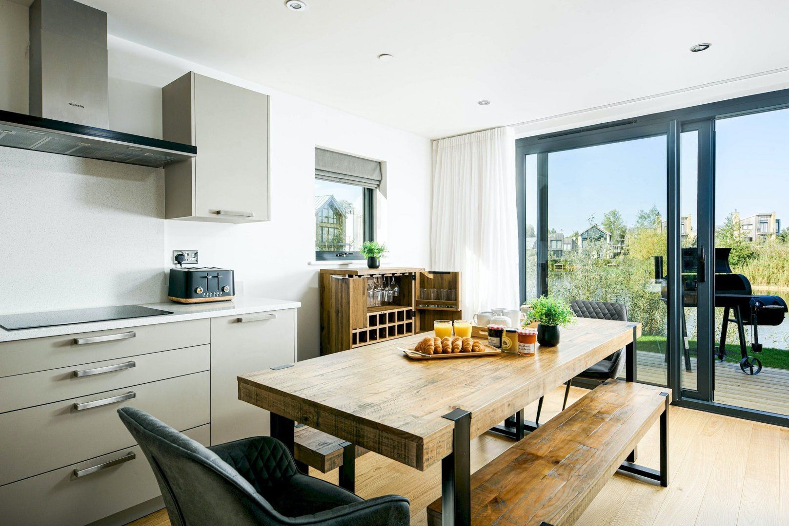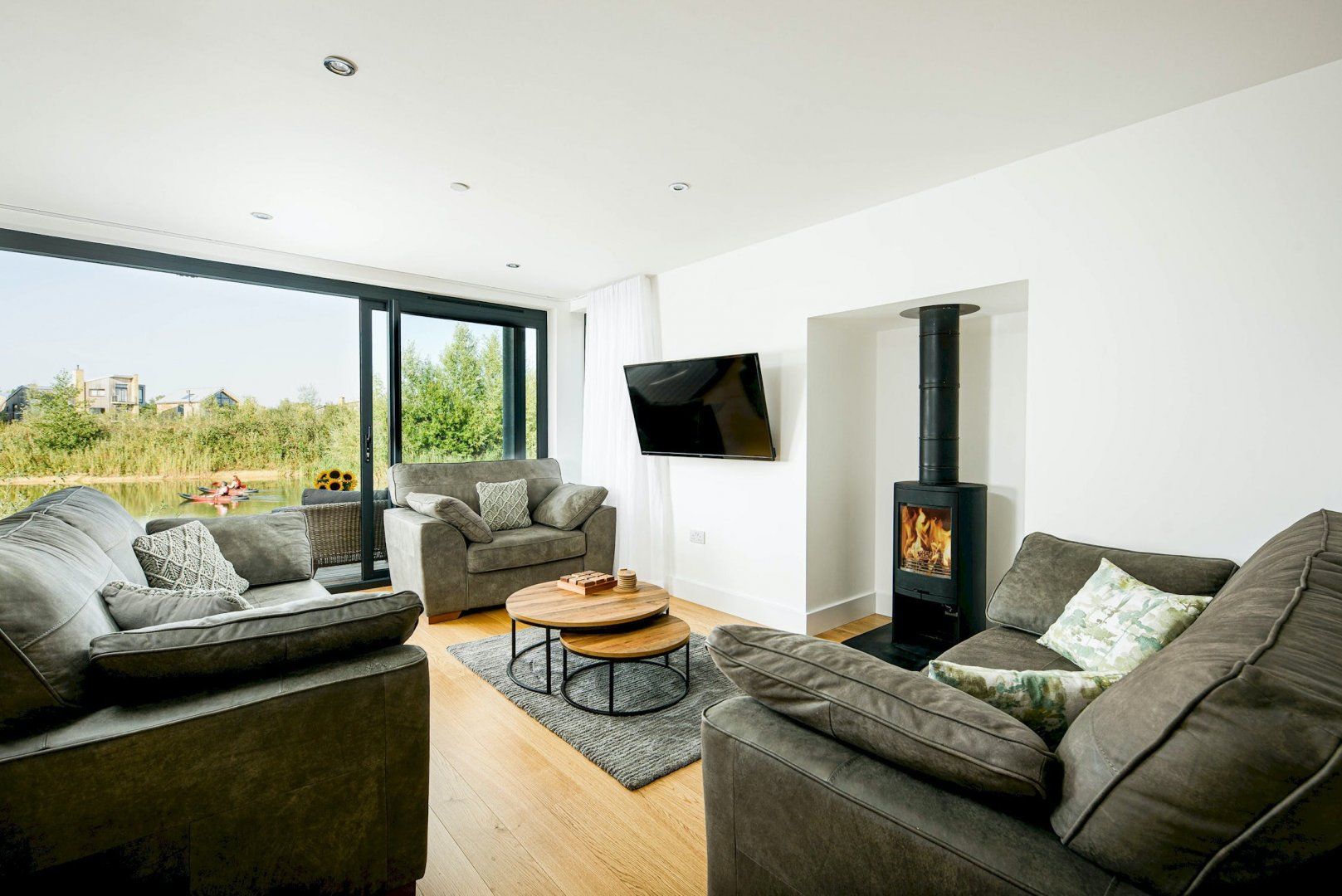 This sky-deck house is located on the water's edge, offering stunning views of Minety Lake and the wildlife that calls it home. The house features a log fire for those colder months and a modern open-plan dining area that opens up to a lovely wooden patio with barbecue facilities. The standout feature here however is its roof terrace complete with hot tub, overlooking the lake and surroundings. As the home is on an estate, it’s worth noting it may slightly impact your privacy, though guests will have access to the estate’s facilities, such as the swimming pools and award-winning spa.