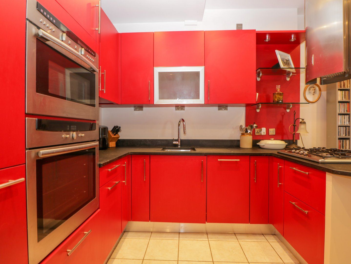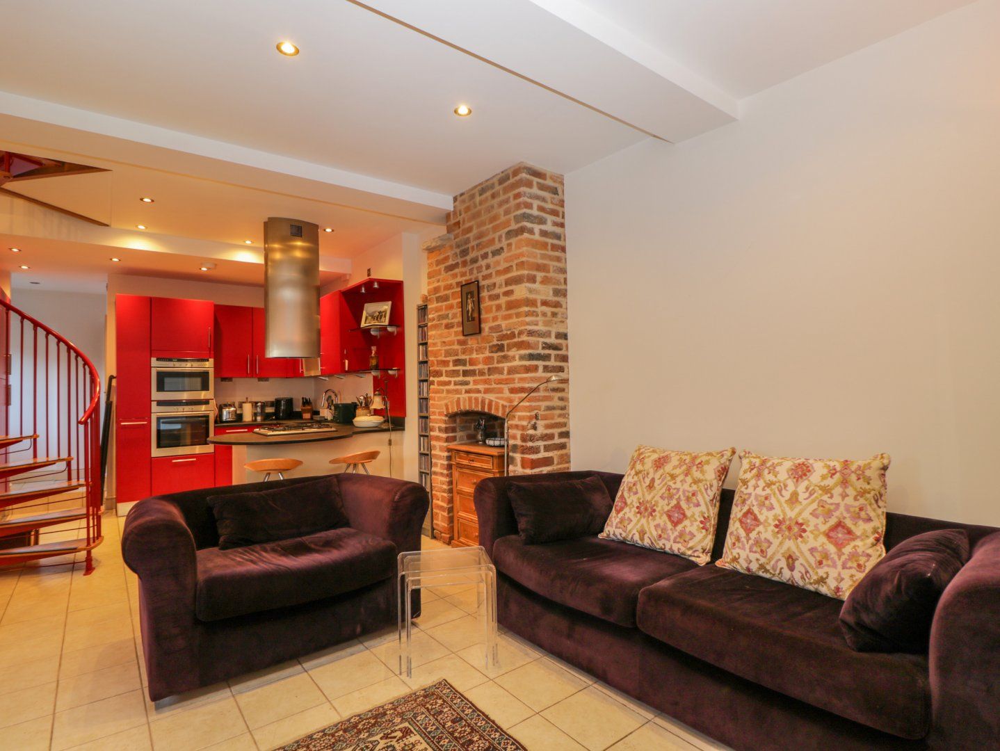 Accomodation Details One bedroom with king-size bed. Bathroom with bath, basin, and WC. Ground-floor shower room with walk-in shower, basin, and WC. Open-plan living space with kitchen, dining area and sitting area