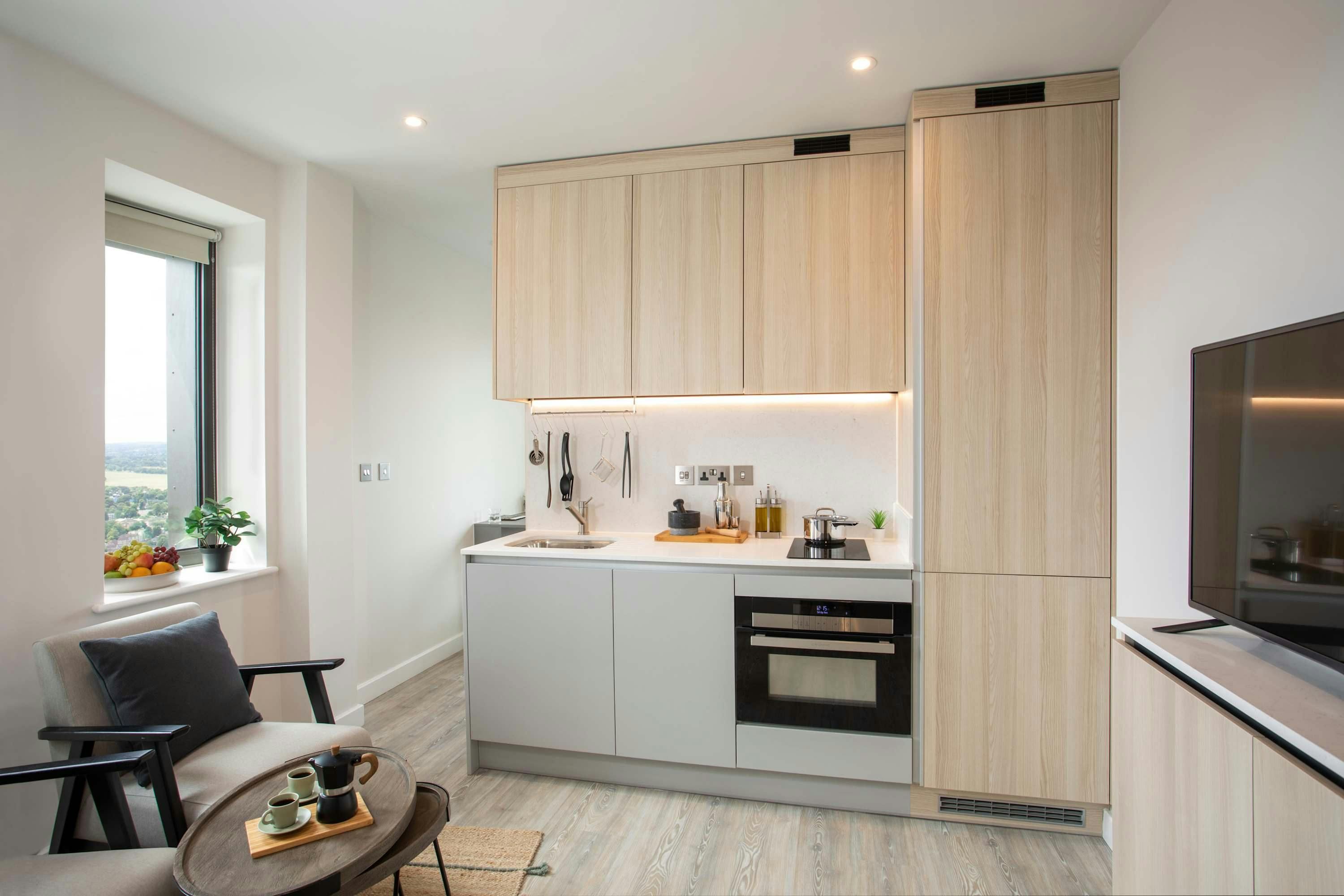 This practical pad is less than twenty minutes by train from Central London, and the same to London Gatwick Airport. So, whether you’re in town for work or play, the location makes it easy to get around. The studio layout won’t suit everyone, but it packs a lot in to a small space, with a handy kitchen and a desk if you need to log on to your laptop. You’ll also love the amenities here, which include everything from a gym, yoga studio, and cinema room to co-working spaces and a podcast studio. Now that’s what we call convenient.