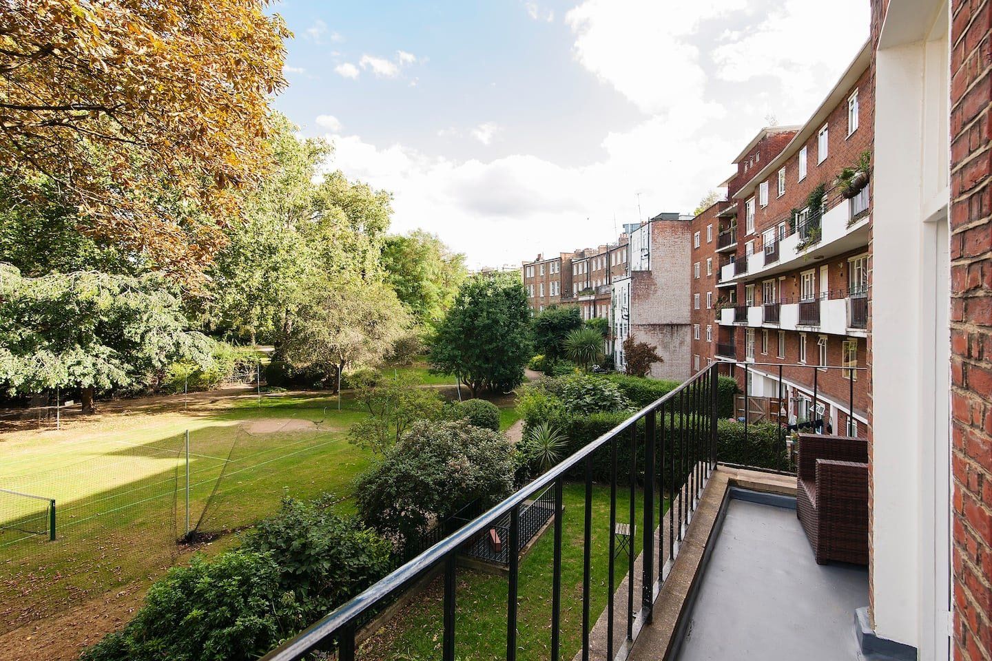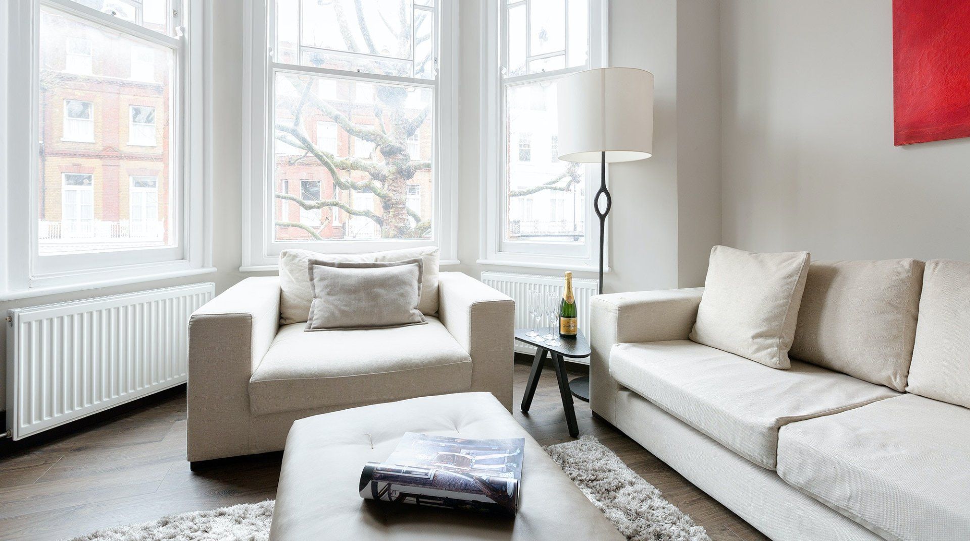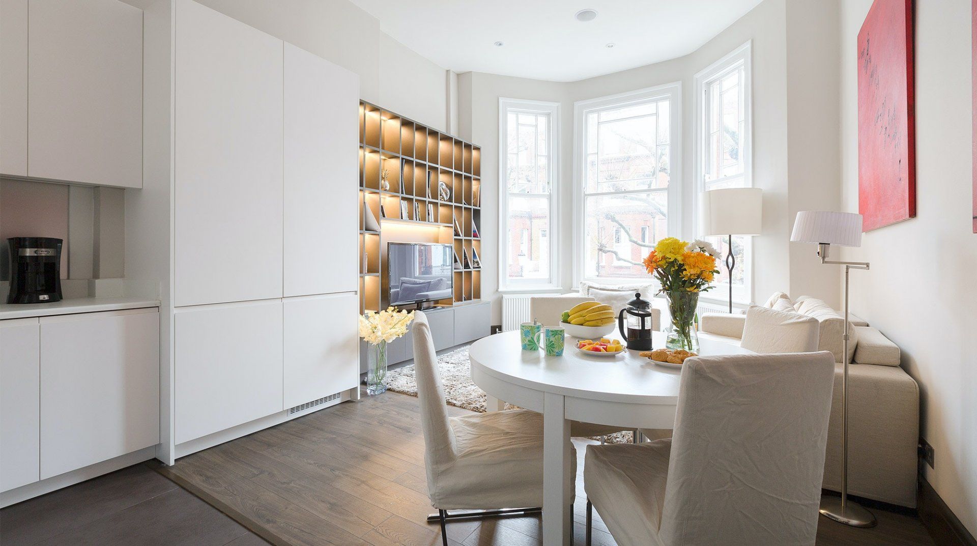 With Earl’s Court station a three-minute walk away, you’re right in the heart of the action at this apartment. It’s also one of London’s most prestigious addresses, in the Royal Borough of Kensington and Chelsea, putting fine dining, luxury shopping and myriad museums and galleries on your doorstep. The home itself is a classic London pad with big bay windows and wooden floors. The living room was built for entertainment with shelves and shelves of object d’art and DVDs surrounding the TV. A minimalist kitchen hides all the appliances you need behind pristine white cabinets and there’s a skinny balcony overlooking parkland and tennis courts, ideal for a pre-dinner drink in the evening sun. Come bedtime, sprawling queen-size beds ensure a sound sleep, and both bedrooms have a TV if you want some downtime.