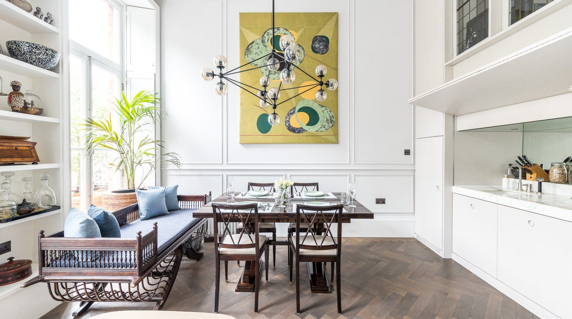 The Queen Anne terrace with its high ceilings, sleek mirrored kitchen and three double height French windows opening up onto a small balcony makes for dramatic viewing. Perfect for two couples or an older family searching for a well designed apartment. From here, it's within easy reach of Kensington, Holland Park and Chelsea while the high street is only 5 minutes away for grocery shopping. Although you'll only get Apple TV, there are many books and inspiring art to make up for it. The master bedroom is situated in the mezzanine floor which looks over the living area.