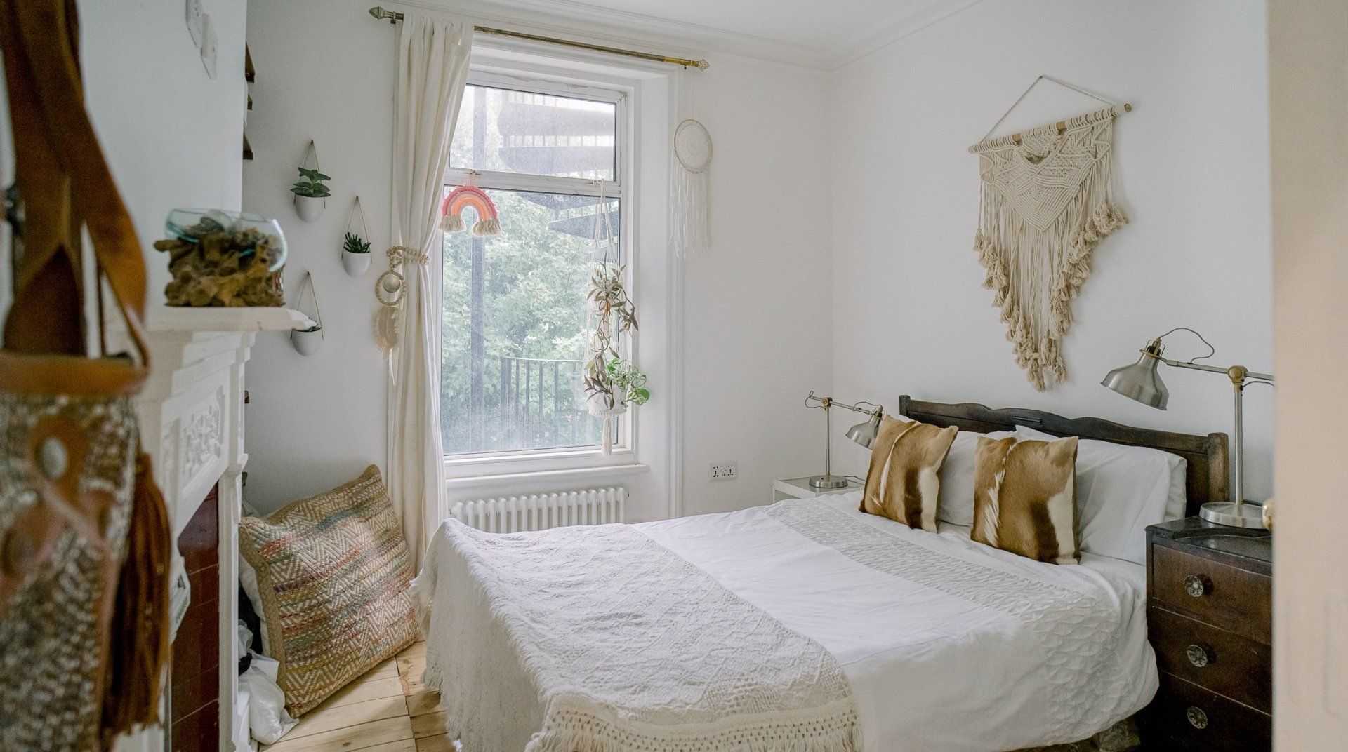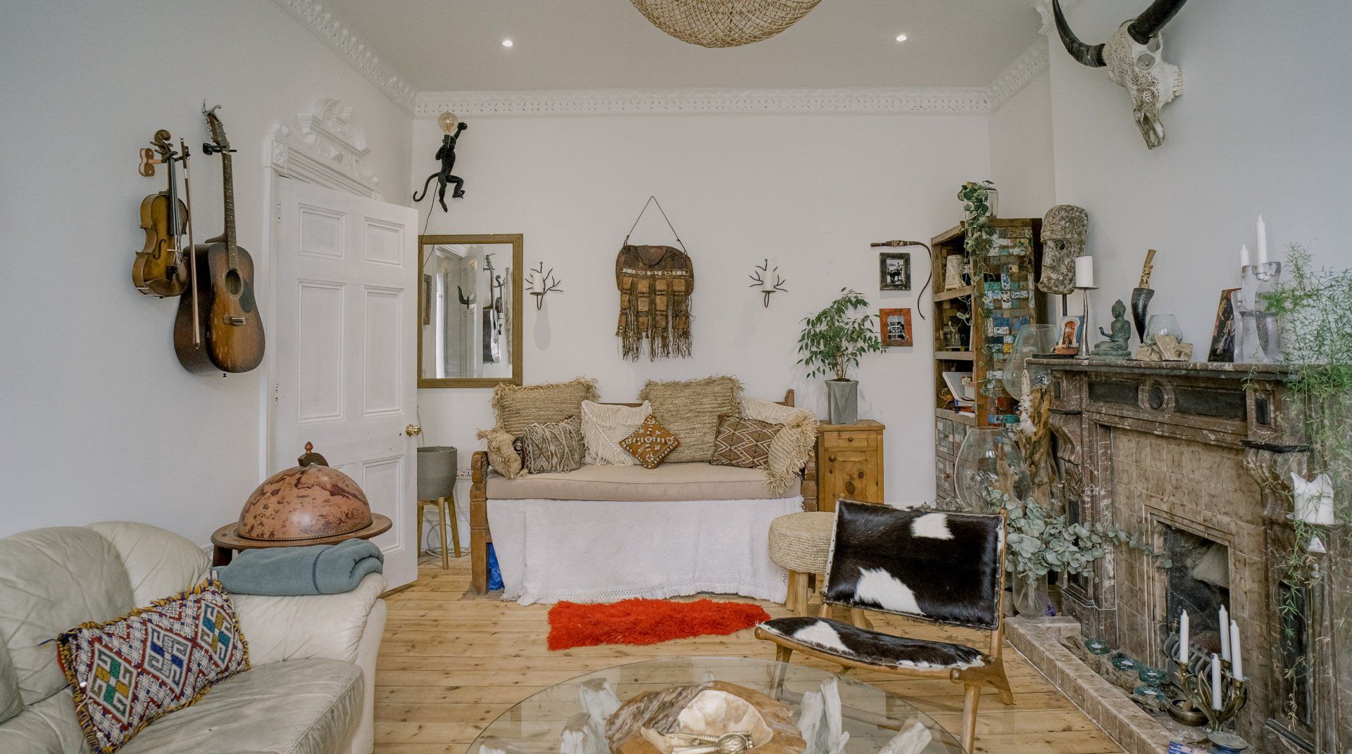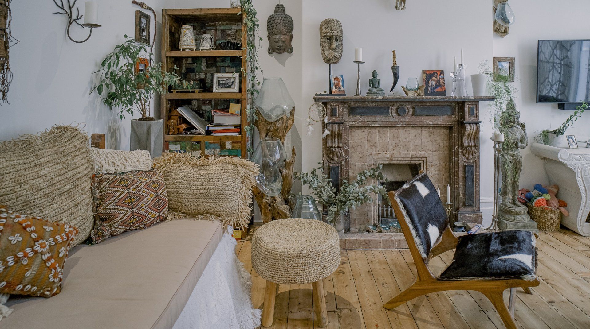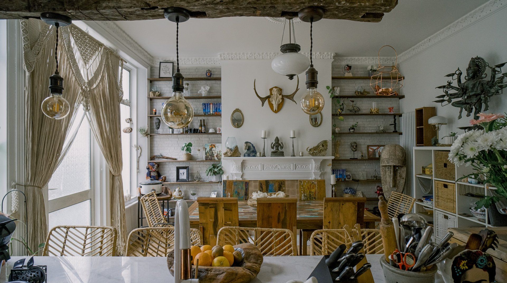 If you’re a minimalist at heart, look away now. This eclectic – some might say eccentric – home is an eye-catching cacophony of wooden artefacts, creamy-coloured macrame and potted plants. It’s packed to the rafters with objets d’art from around the world and things that have been reclaimed and repurposed. And it all sings together quite nicely thanks to the neutral tones. It’s clearly a home that has absorbed a lot of love, from the rough-hewn petrified wood sinks to the intricately carved beds. There’s plenty to marvel at. We love the quirky kitchen with a table which was once a floor, copper sinks and lights suspended from a huge wooden beam. It’s a generous, Victorian home with a large back garden on a quiet street but close to London’s sights. Lewisham DLR and train station is a ten-minute walk away. St. John's train station is a five-minute walk away and from there it’s just six minutes into London Bridge. Nearby there are plenty of pubs, cafes and shops within walking distance.