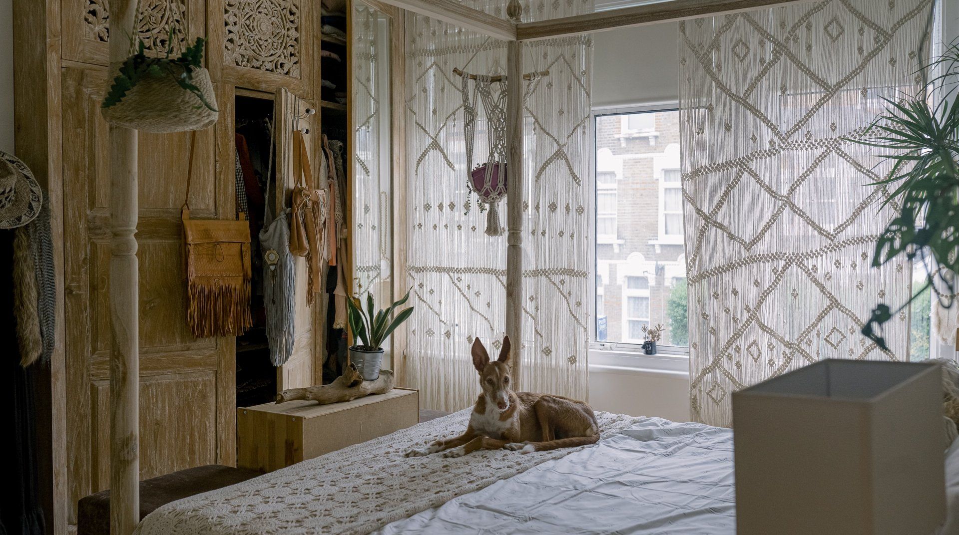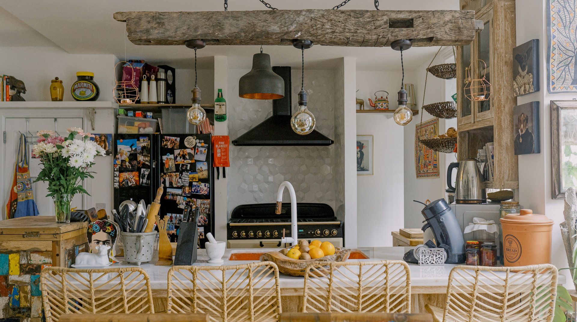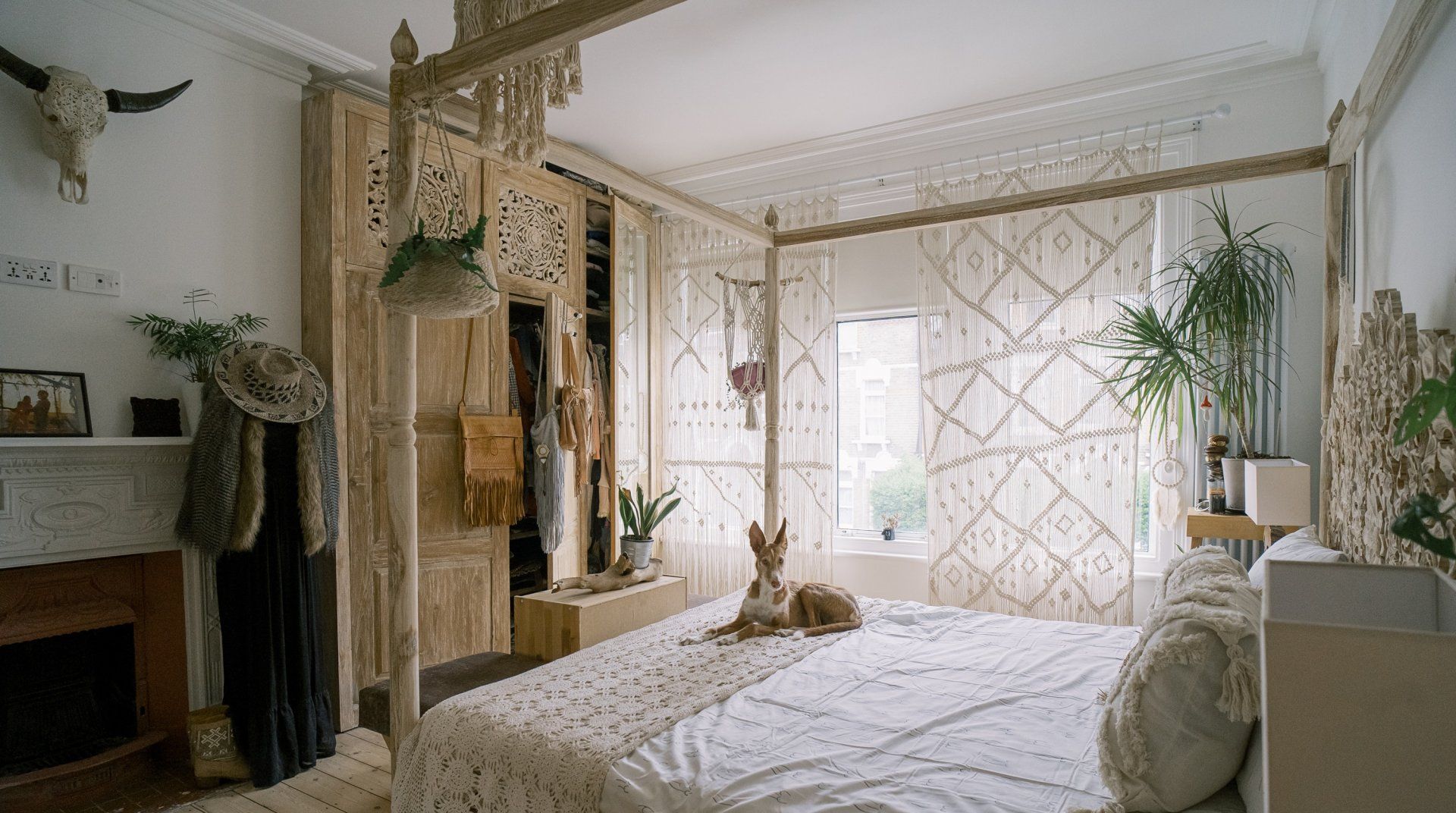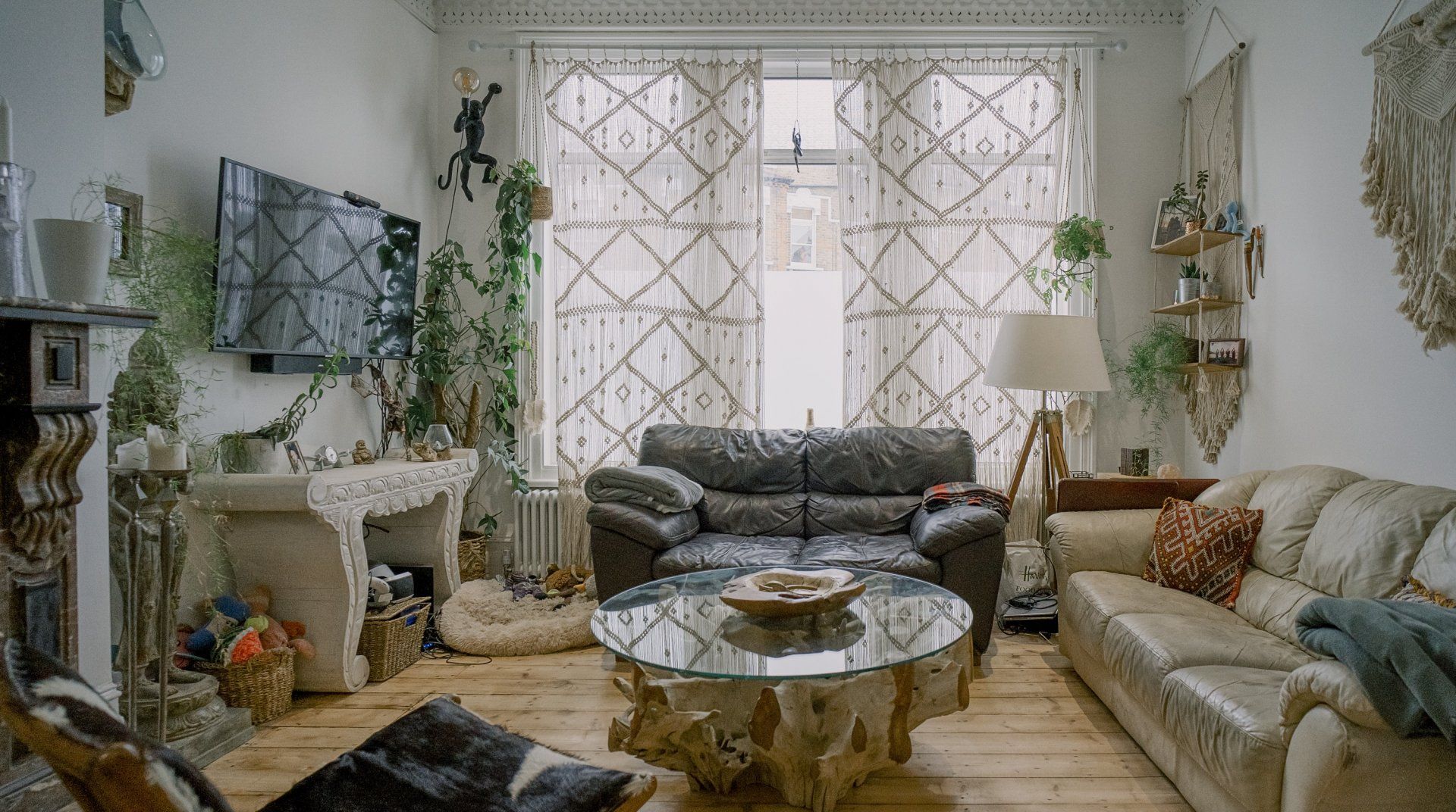 If you’re a minimalist at heart, look away now. This eclectic – some might say eccentric – home is an eye-catching cacophony of wooden artefacts, creamy-coloured macrame and potted plants. It’s packed to the rafters with objets d’art from around the world and things that have been reclaimed and repurposed. And it all sings together quite nicely thanks to the neutral tones. It’s clearly a home that has absorbed a lot of love, from the rough-hewn petrified wood sinks to the intricately carved beds. There’s plenty to marvel at. We love the quirky kitchen with a table which was once a floor, copper sinks and lights suspended from a huge wooden beam. It’s a generous, Victorian home with a large back garden on a quiet street but close to London’s sights. Lewisham DLR and train station is a ten-minute walk away. St. John's train station is a five-minute walk away and from there it’s just six minutes into London Bridge. Nearby there are plenty of pubs, cafes and shops within walking distance.