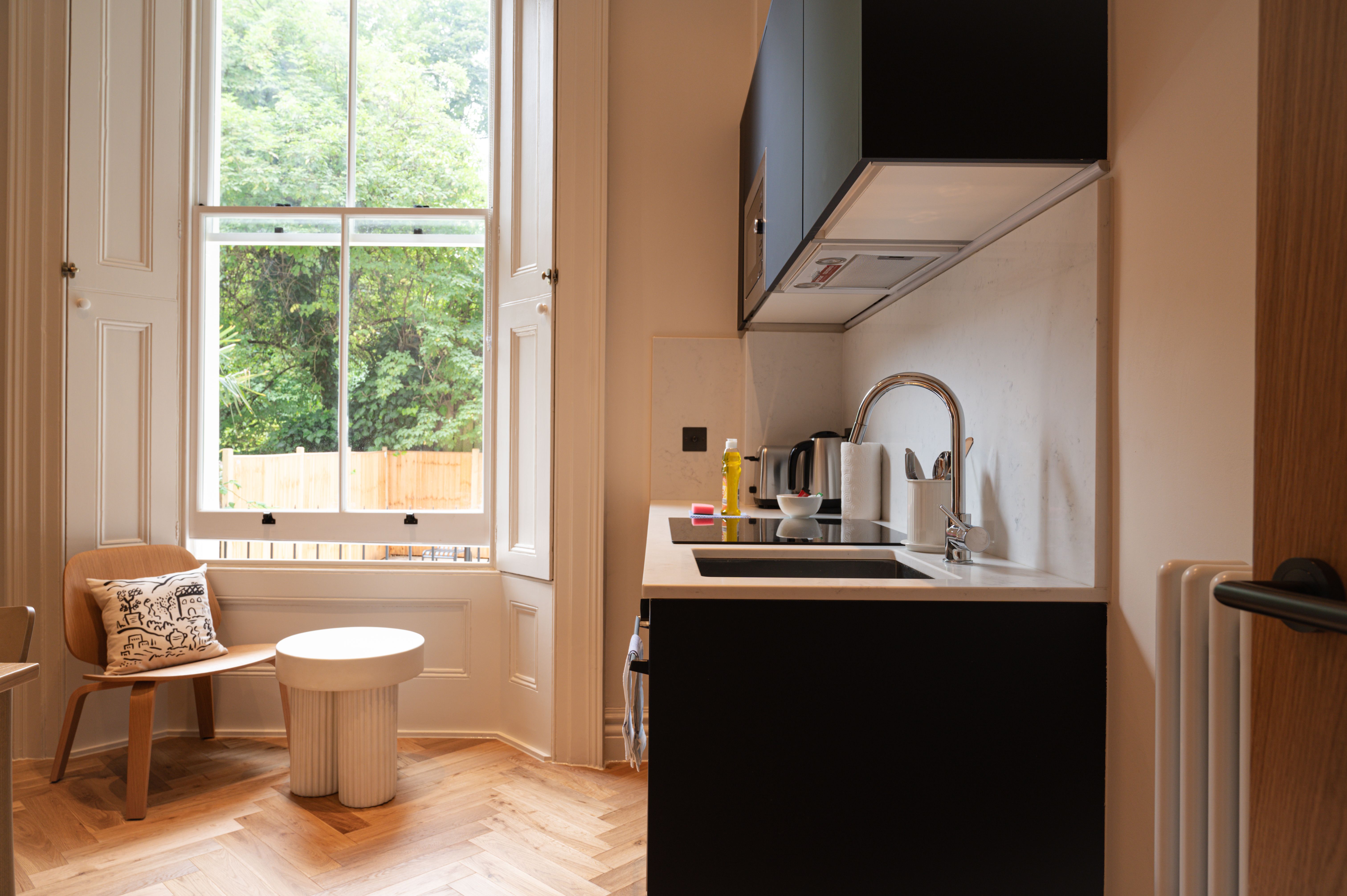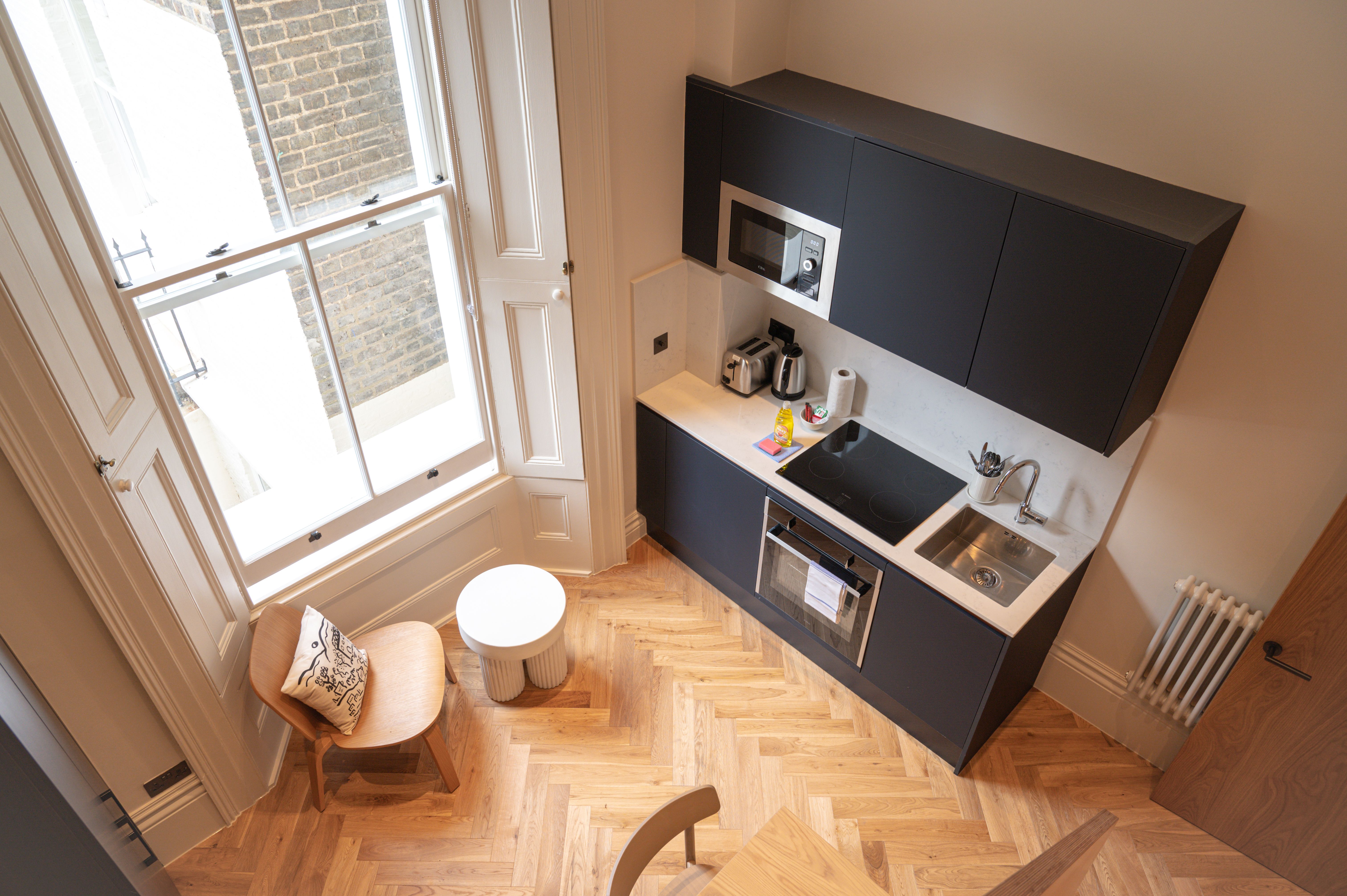 This cosy studio is one of nineteen newly converted apartments in a terraced house in Notting Hill. It’s small but perfectly formed, with a fully equipped kitchen and a charming sleeping space at mezzanine level – it’s an ideal hideaway for those simply looking for a place to rest their head during a busy stay in London. You’ll be perfectly placed to explore London, with Notting Hill’s restaurants, bars, and boutiques on your doorstep and Royal Oak tube station a short walk away.