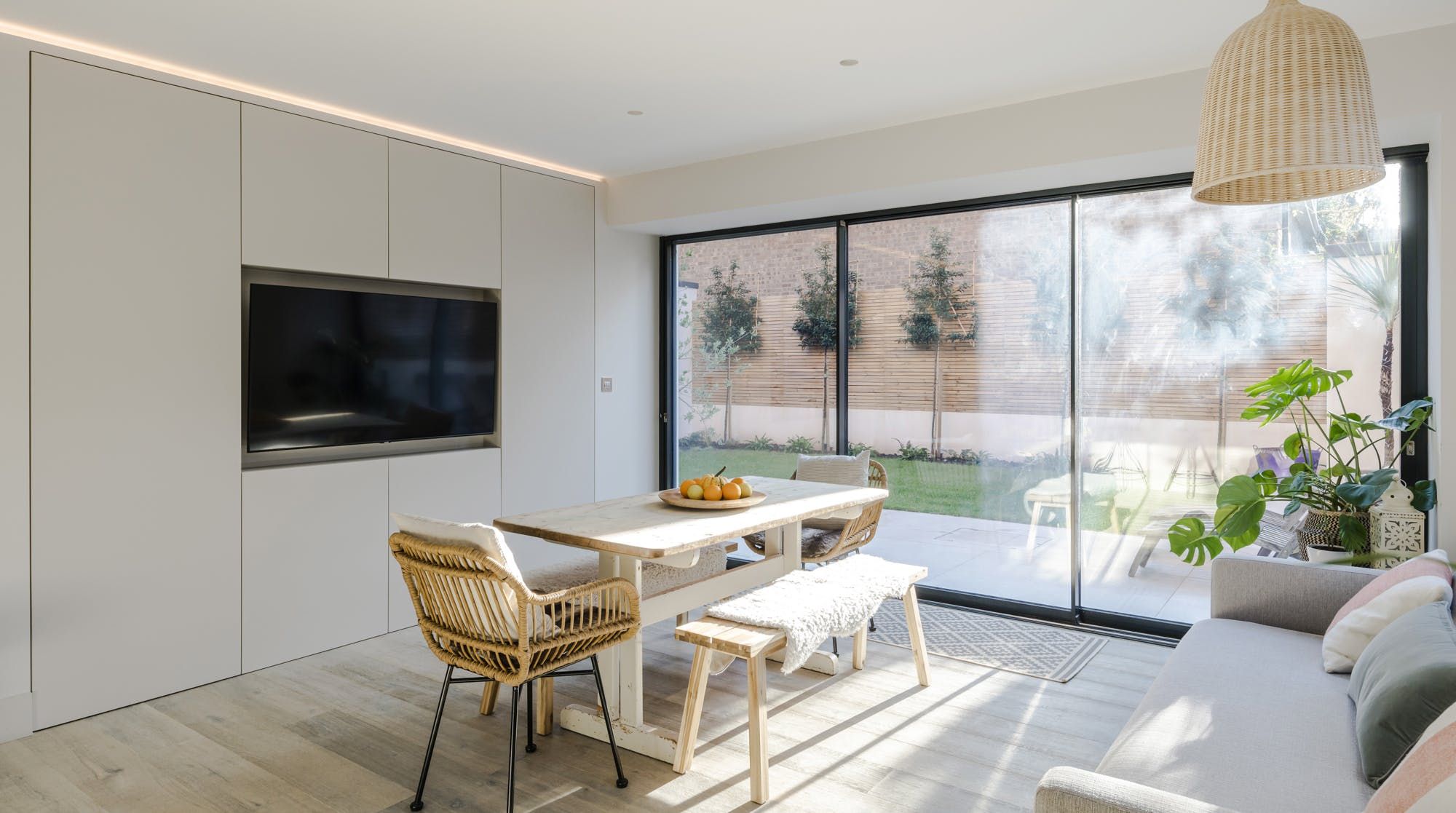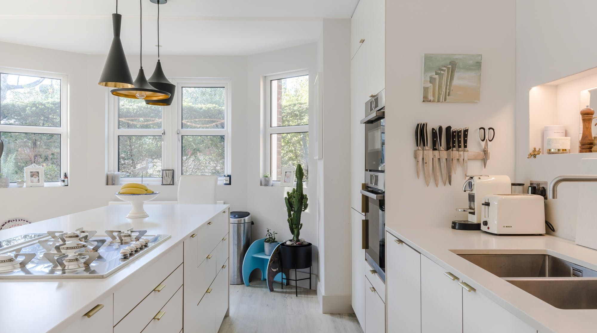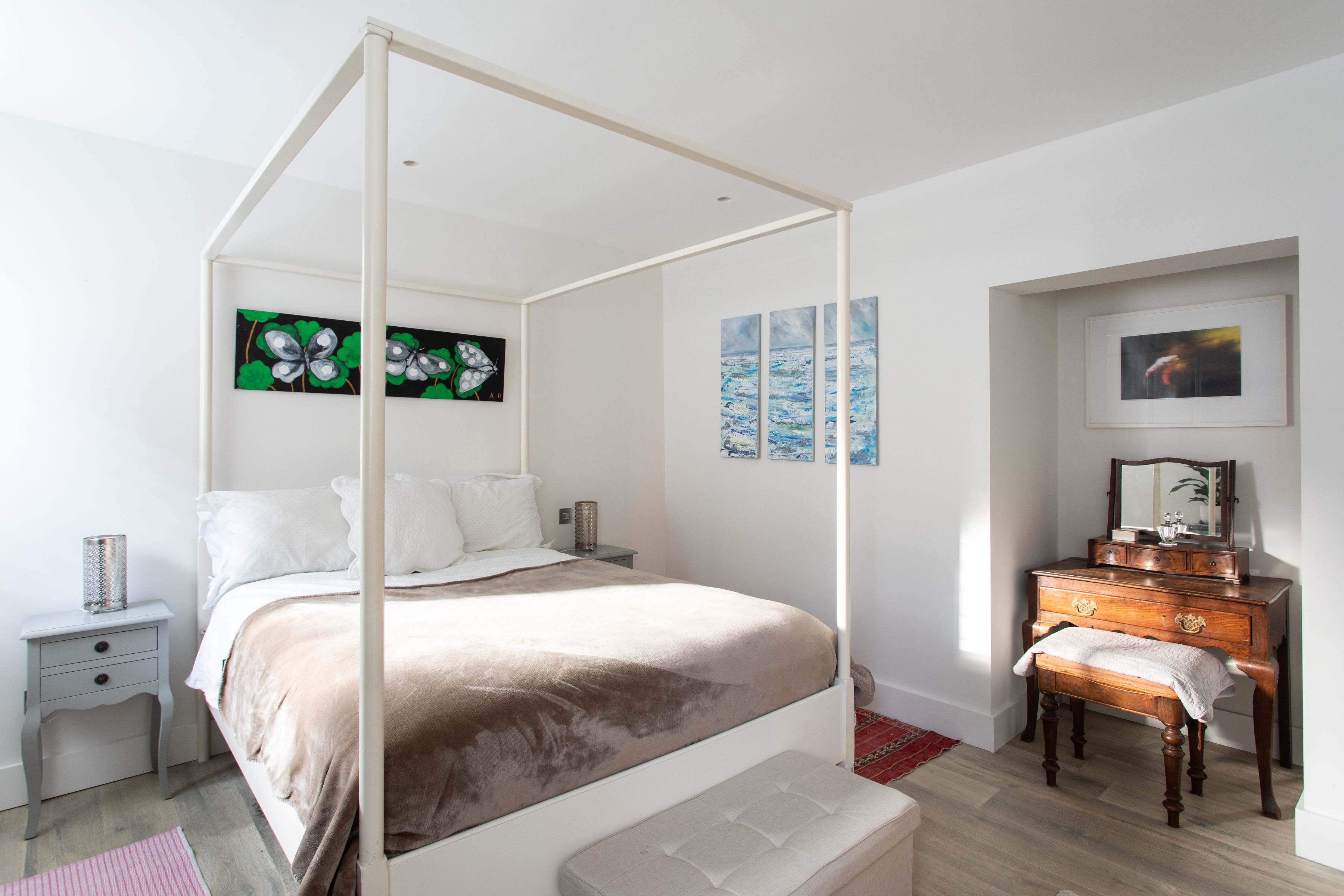 On the edge of Wimbledon, where the wild expanse of Wimbledon Common stretches before you, this family home is a little bit of luxury away from the hustle and bustle of London. It’s housed in a traditional red-brick building that looks like a grand mansion. Inside, a wall of glass slides open in the kitchen and living room to blend indoors with outdoors, seamlessly. Keep the doors open to the private garden and you can dine as the evening sun hits the table for six. Or, opt for a more casual set-up at the breakfast bar, perfect for a quick morning fuel-up before heading into London proper (fifteen minutes by train from Raynes Park). A healthy collection of pot plants, books and Indian throws add a boho-luxe feel to each room and liven up an otherwise bright, white space, making this a delightful spot to return home to. If the winding paths and greenery of Wimbledon Common on your doorstep aren’t enough, cross into Richmond Park, the former hunting ground of monarchs where you can still spot deer roaming free.