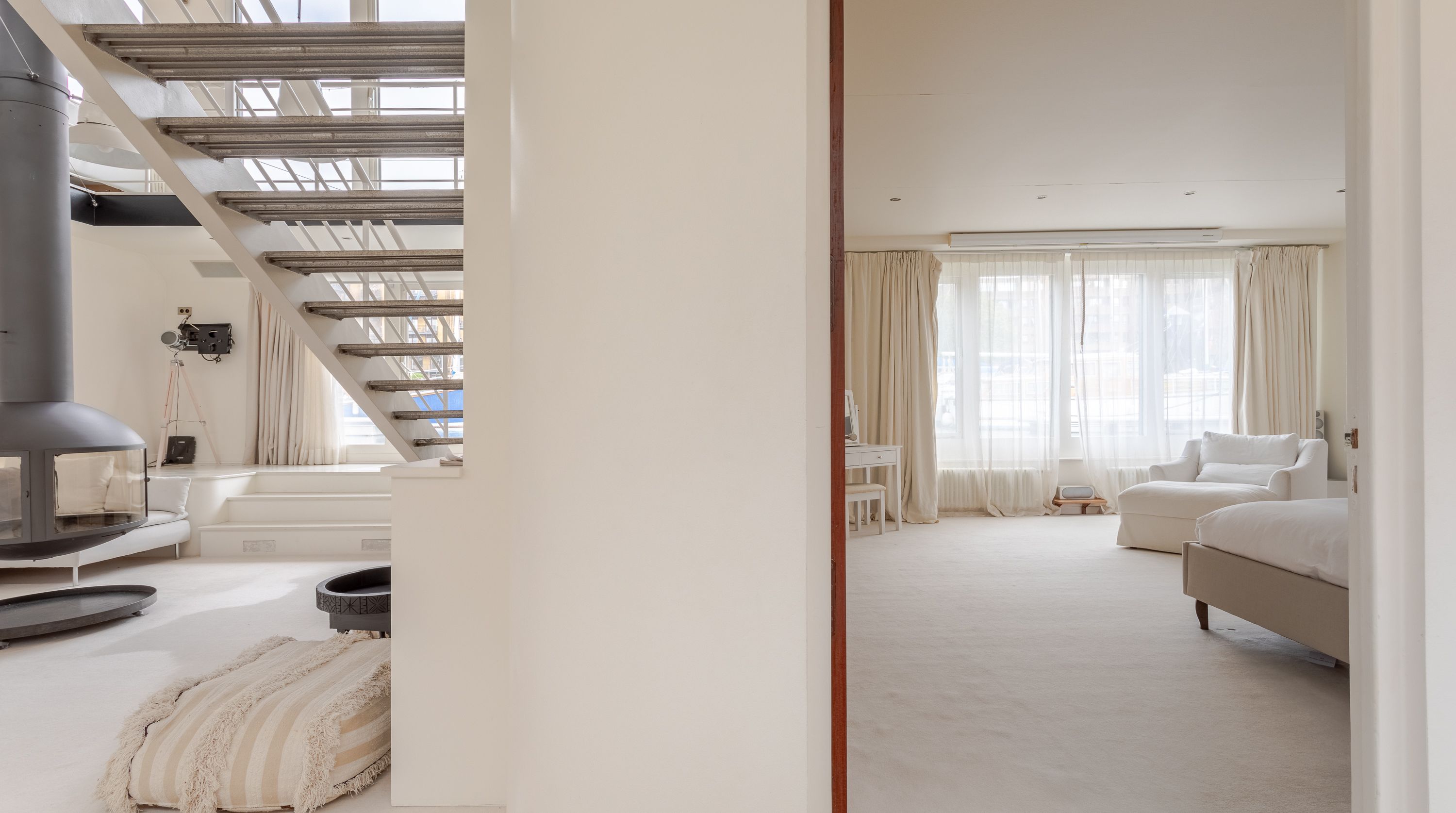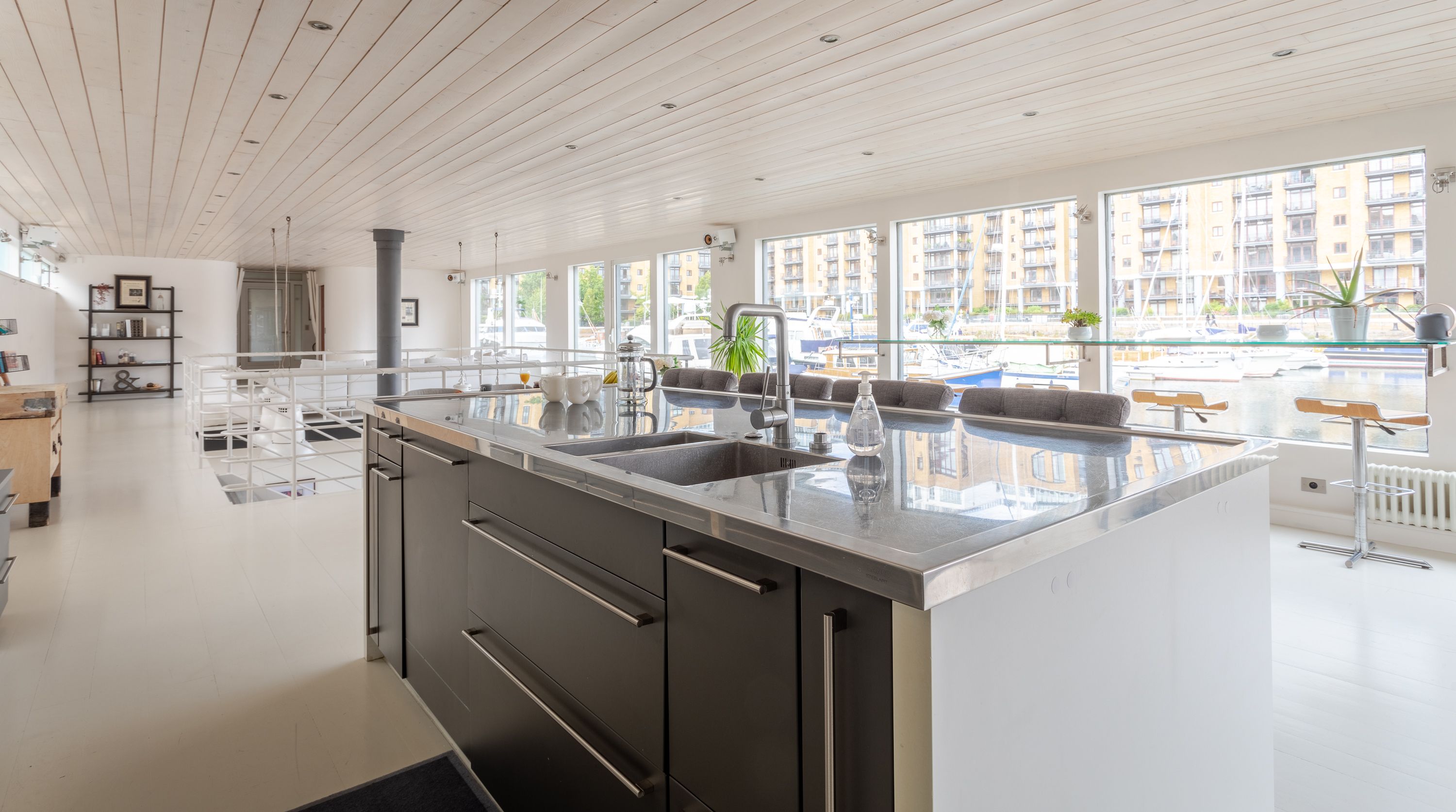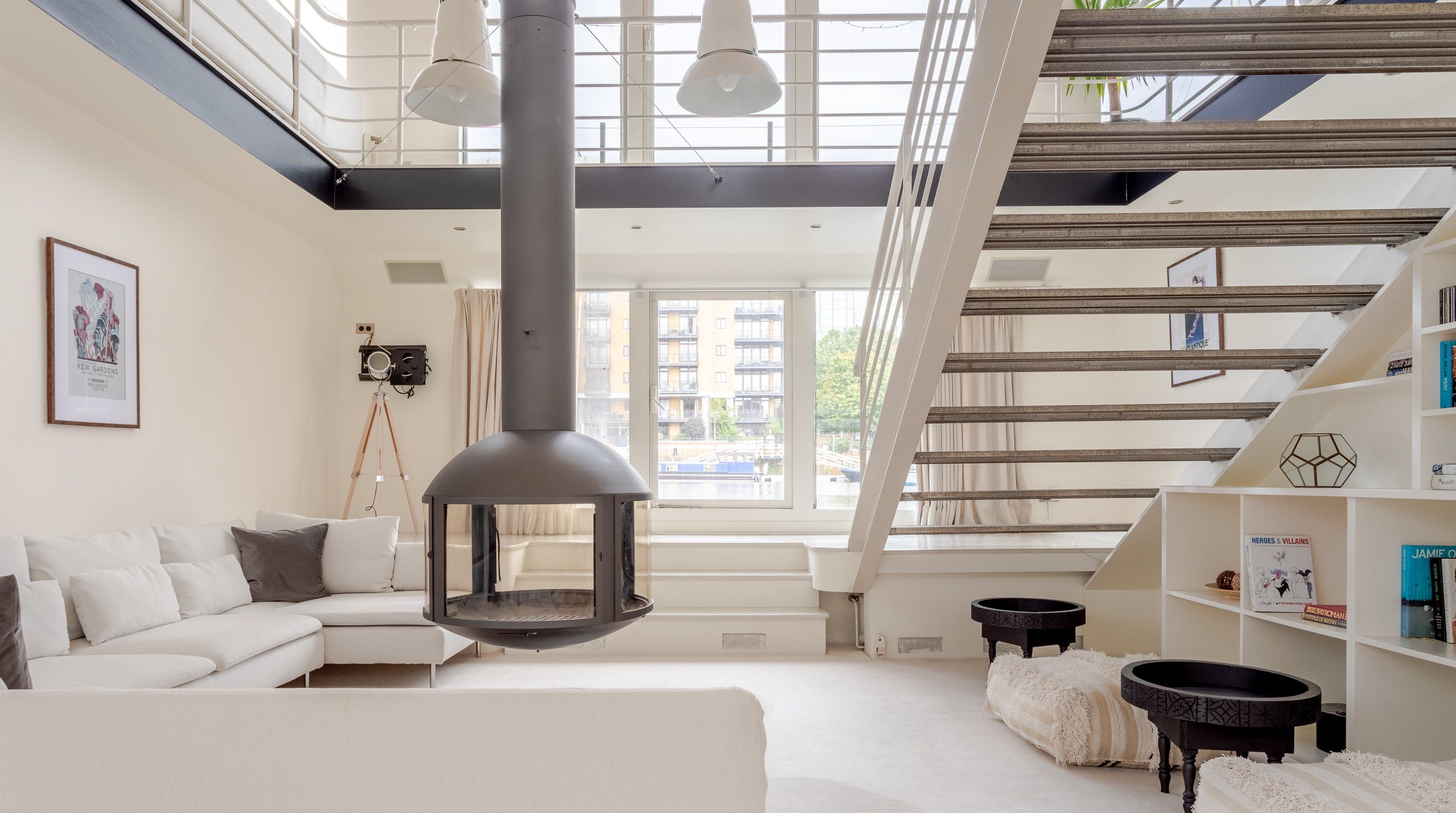 Cross the gangplank onto this incredible floating home near the Thames. Moored just a couple of blocks from Tower Bridge, this former 1930s steel barge is a ten-minute walk from the Tower of London. The top deck has been converted into a long, open living space with views of St Katharine Docks Marina from the huge windows. We love the semi-outdoor dining room, housed in a glass atrium-style space to the rear of the ship, with seating for ten. Choose to relax in the stylish white lounge on the upper deck, or head downstairs to the snug with its u-shaped sofa around a striking suspended fireplace. Bedrooms are on the lower deck, but that doesn’t mean dark cabins with tiny portholes. Spacious rooms have walls of windows and if there are portholes, they’re the size of a bass drum, letting in tonnes of natural light. If you manage to bag the master bedroom, its en-suite comes with a sauna. Welcome aboard, matey!