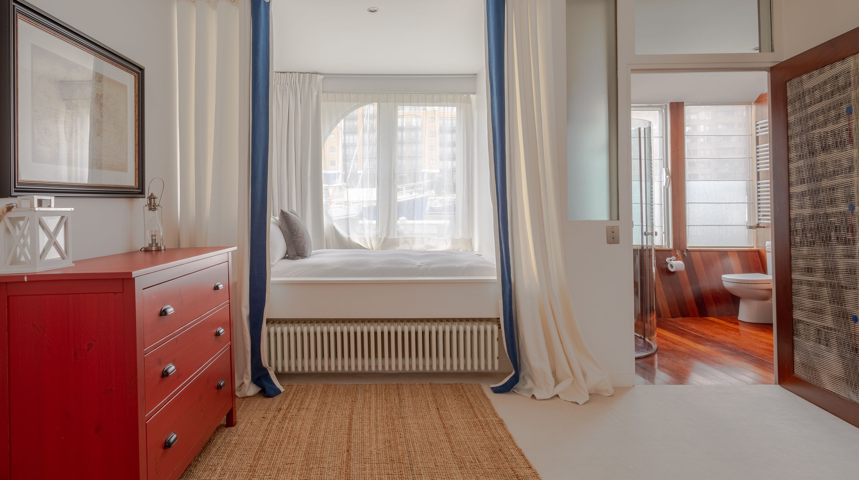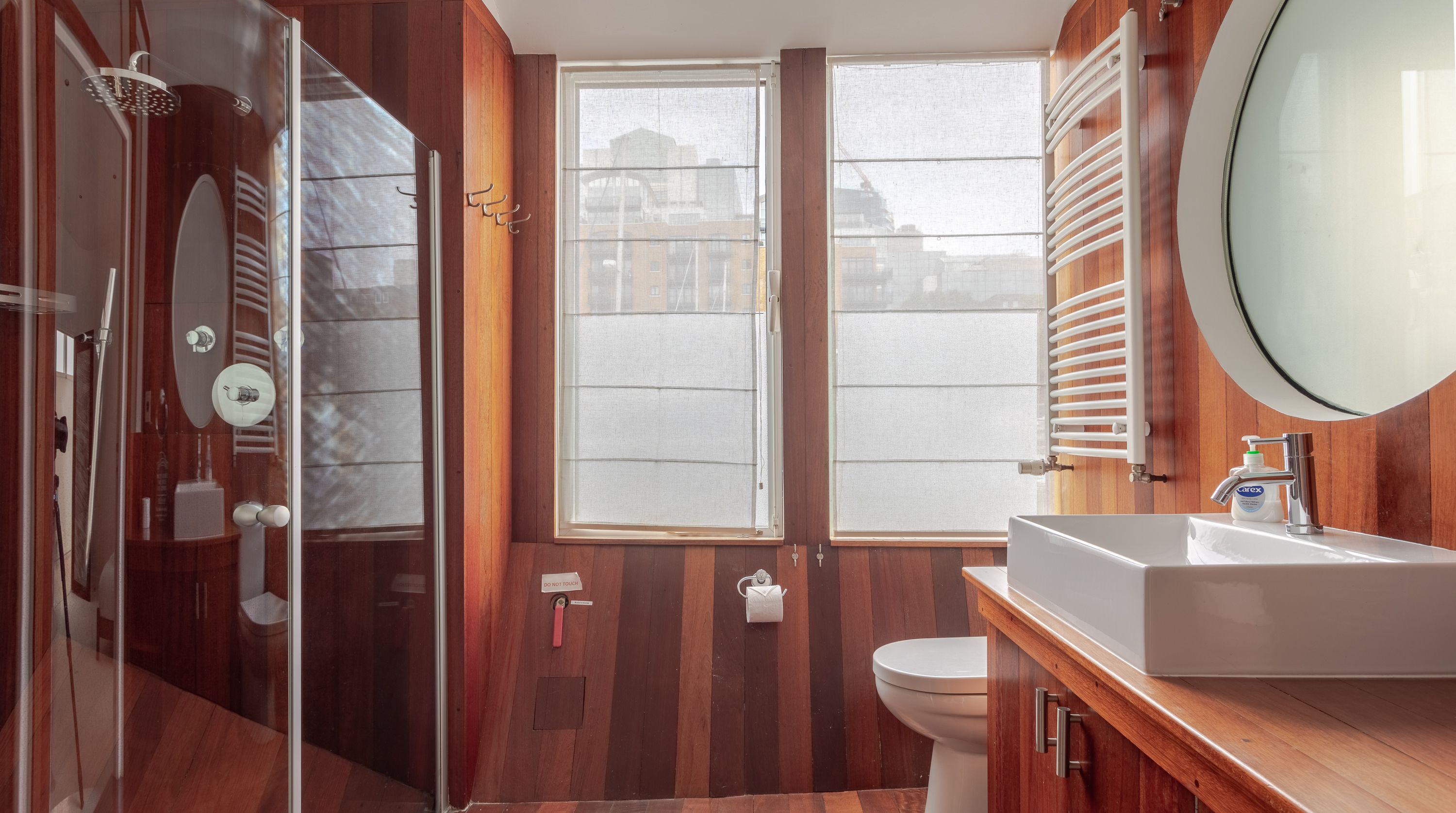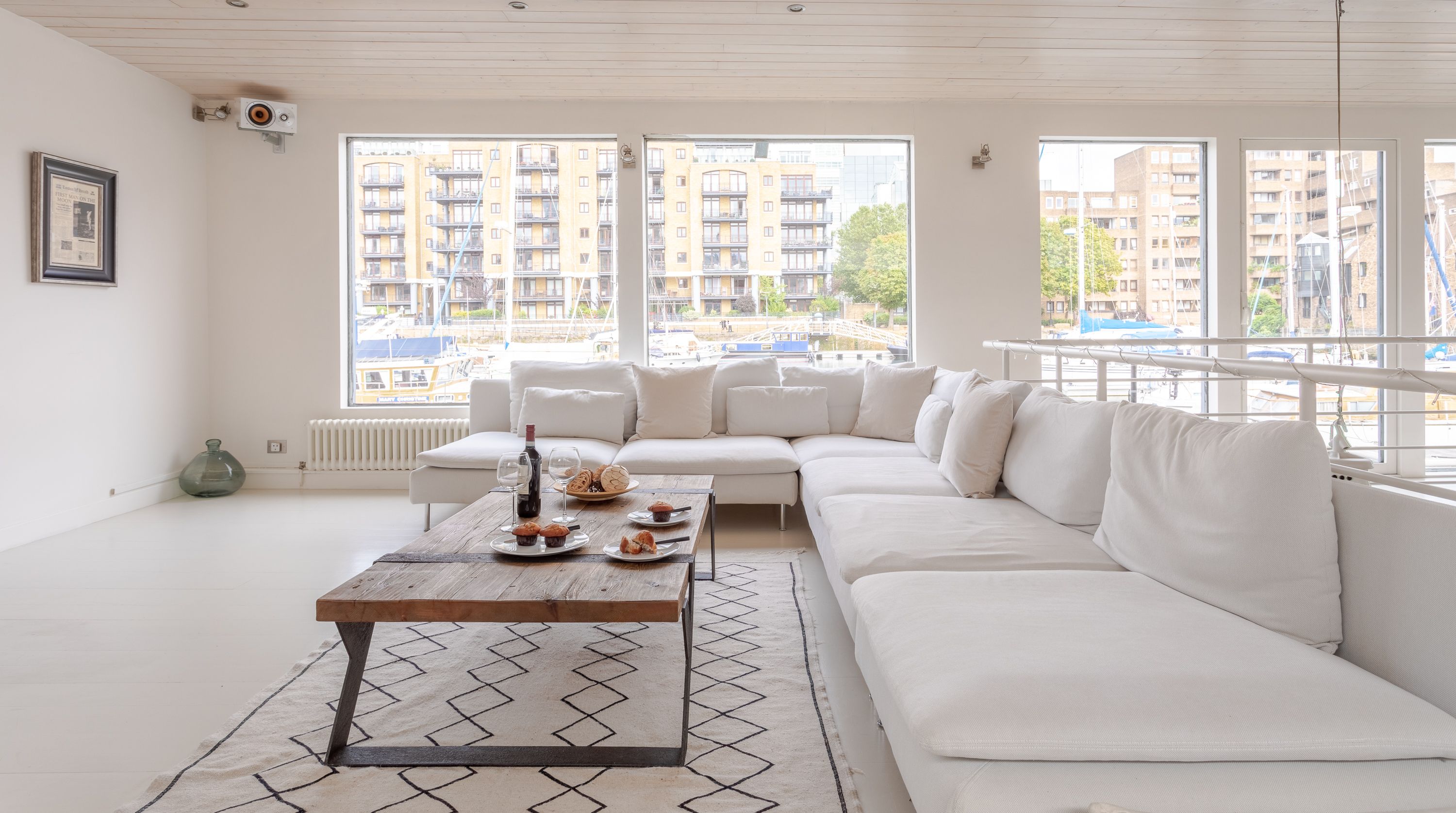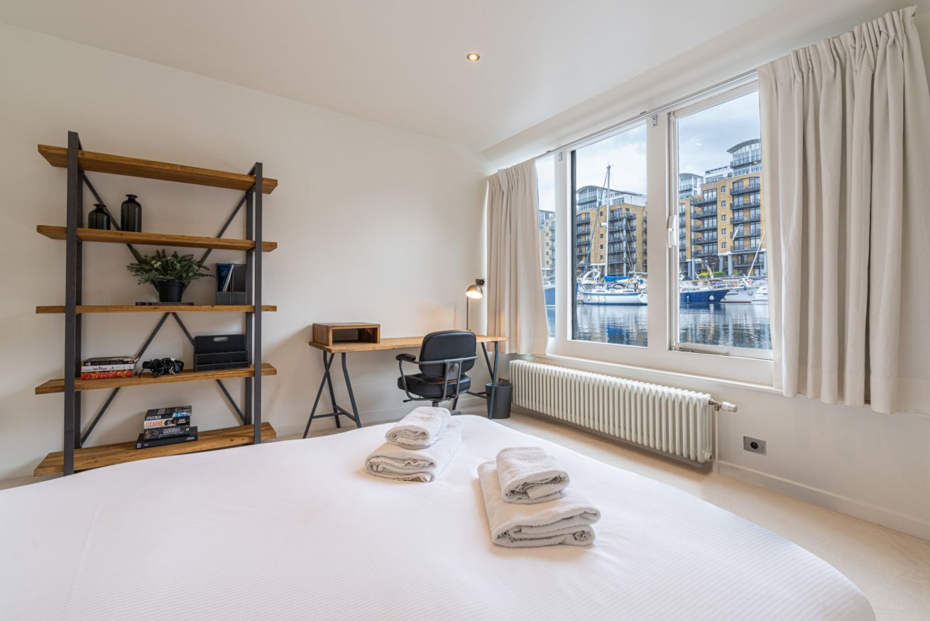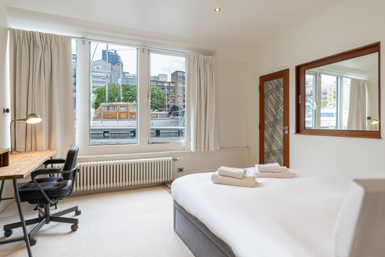Home truths: *This home is a former boat, floating in St Katharine Docks Marina, so you may feel some gentle movement from time to time *The fourth and fifth bedrooms share a bathroom *The fireplace is purely for decoration and not operational *The heating can at times be limited to the central parts of the boat so some of the bedrooms may feel colder *There is some slight wear and tear *Wifi signal can be a bit weak on the lower deck *There is no television in this home and the projector in the bedroom is out of bounds for guests *There is bike storage on the upper deck – or alternatively, there's a bike-sharing station just down the road *This property is fitted with a noise detection device – your host politely asks guests to keep the noise down