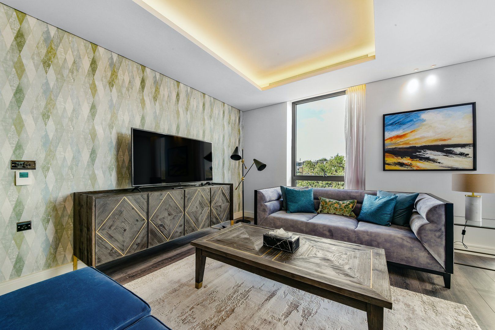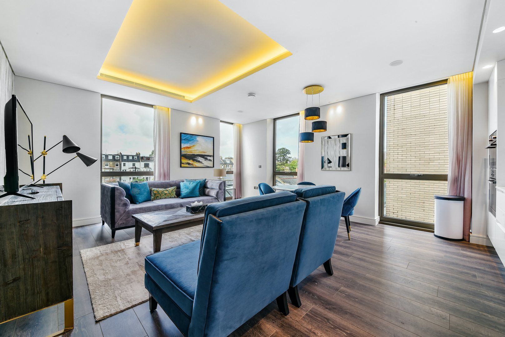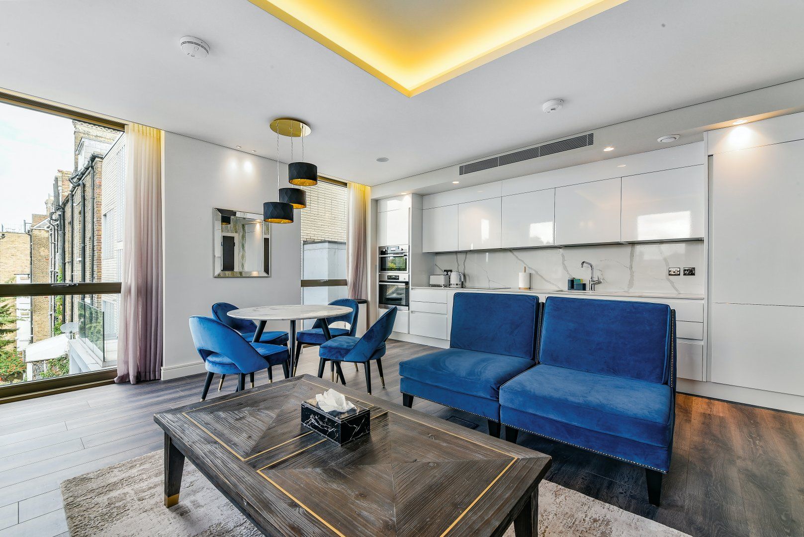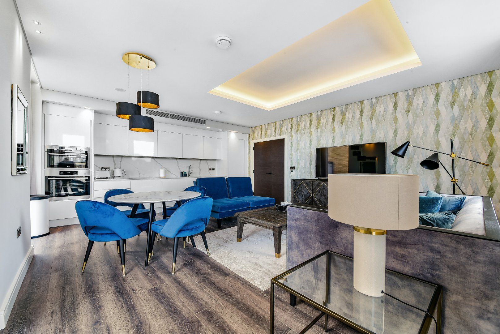 This pristine flat blends opulent design with a prime West London location. You’ll love the attention to detail and the luxe touches. Each room has ambient lighting, and in the daytime the floor to ceiling glass windows flood the space with natural light. From the plush velvet furniture to the squishy king size bed, you’ll easily relax and unwind here. The large desk and fast Wi-Fi mean you’re well equipped for squeezing in a spot of remote work. The bedroom has plenty of wardrobe space – perfect for longer stays. There is space for four in the living room and at the marble dining table in case you want to play host for the evening, and a high spec kitchen for whipping up home cooked meals.