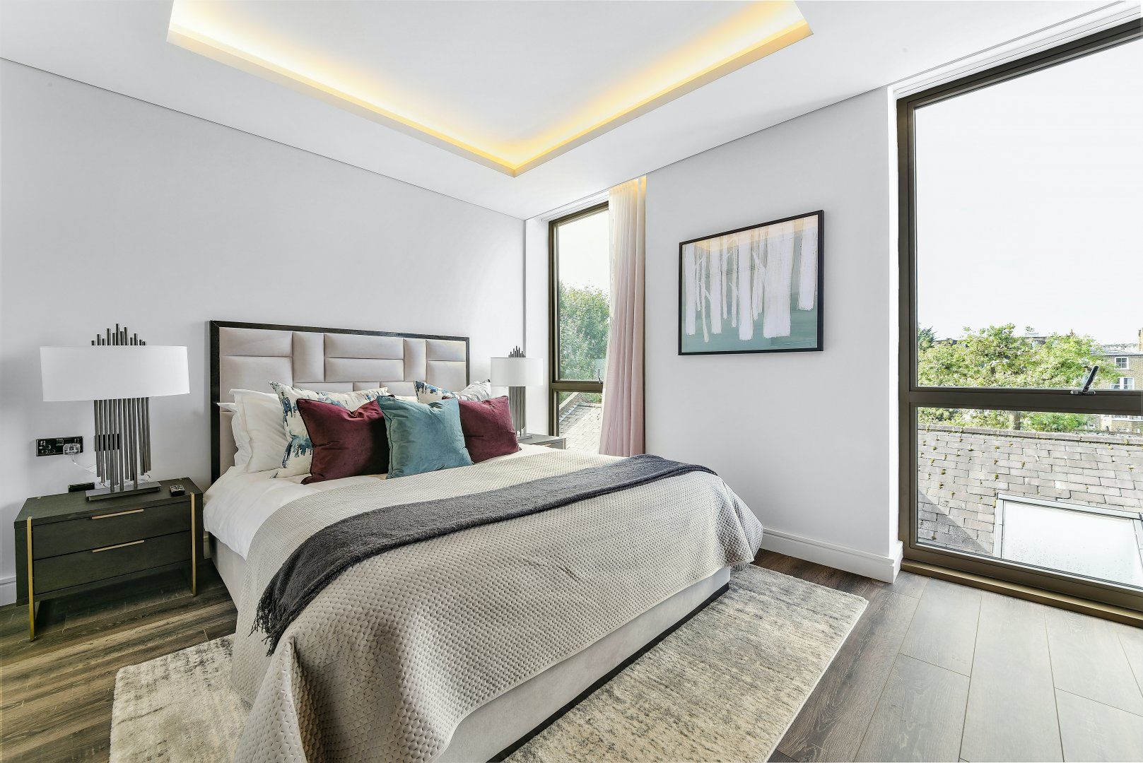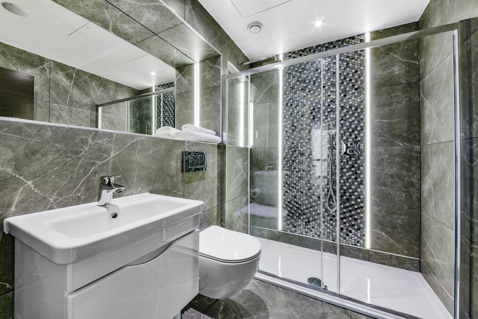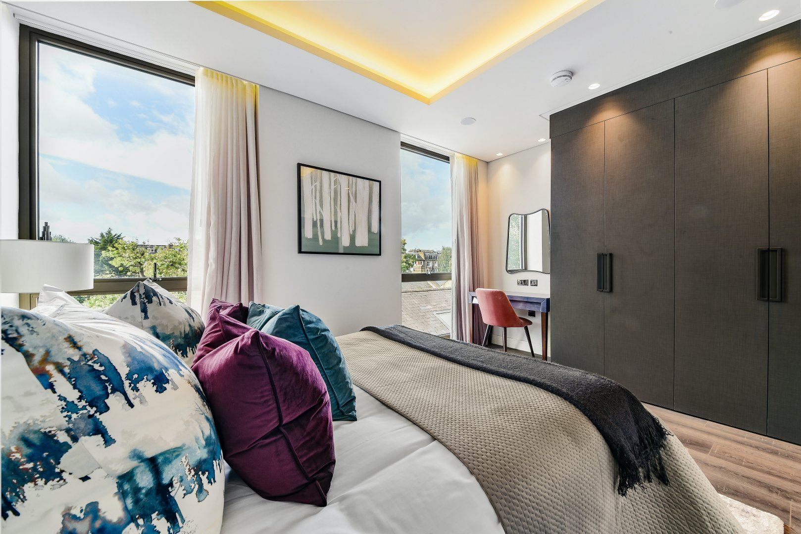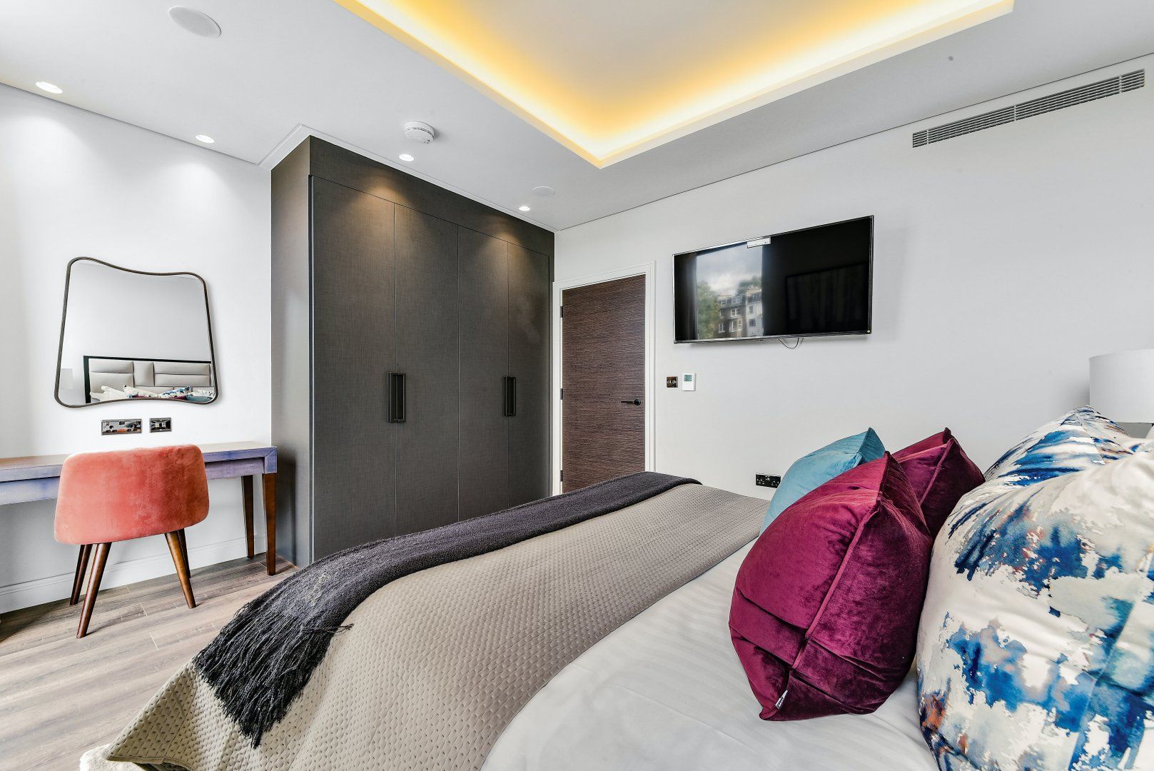 This pristine flat blends opulent design with a prime West London location. You’ll love the attention to detail and the luxe touches. Each room has ambient lighting, and in the daytime the floor to ceiling glass windows flood the space with natural light. From the plush velvet furniture to the squishy king size bed, you’ll easily relax and unwind here. The large desk and fast Wi-Fi mean you’re well equipped for squeezing in a spot of remote work. The bedroom has plenty of wardrobe space – perfect for longer stays. There is space for four in the living room and at the marble dining table in case you want to play host for the evening, and a high spec kitchen for whipping up home cooked meals.