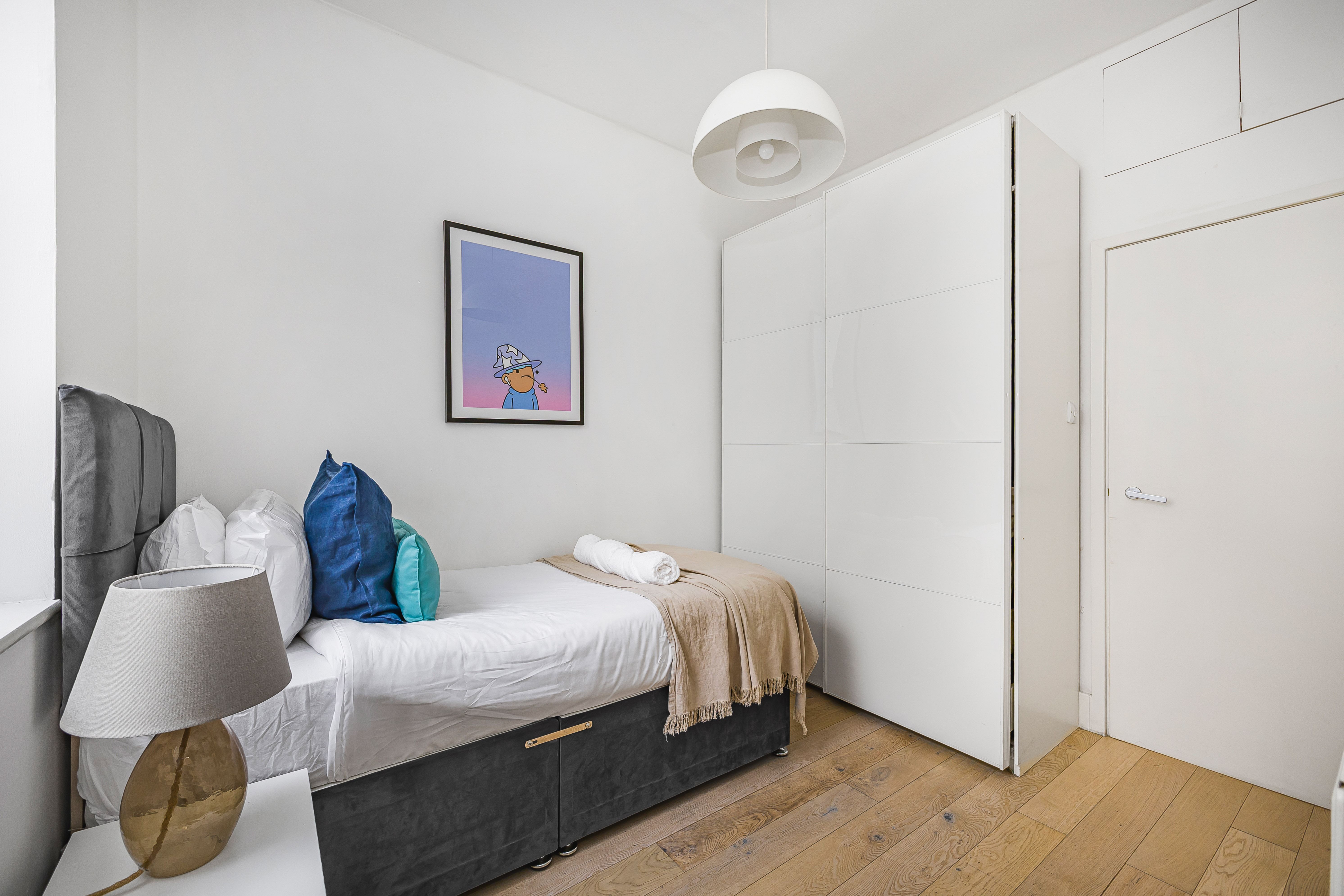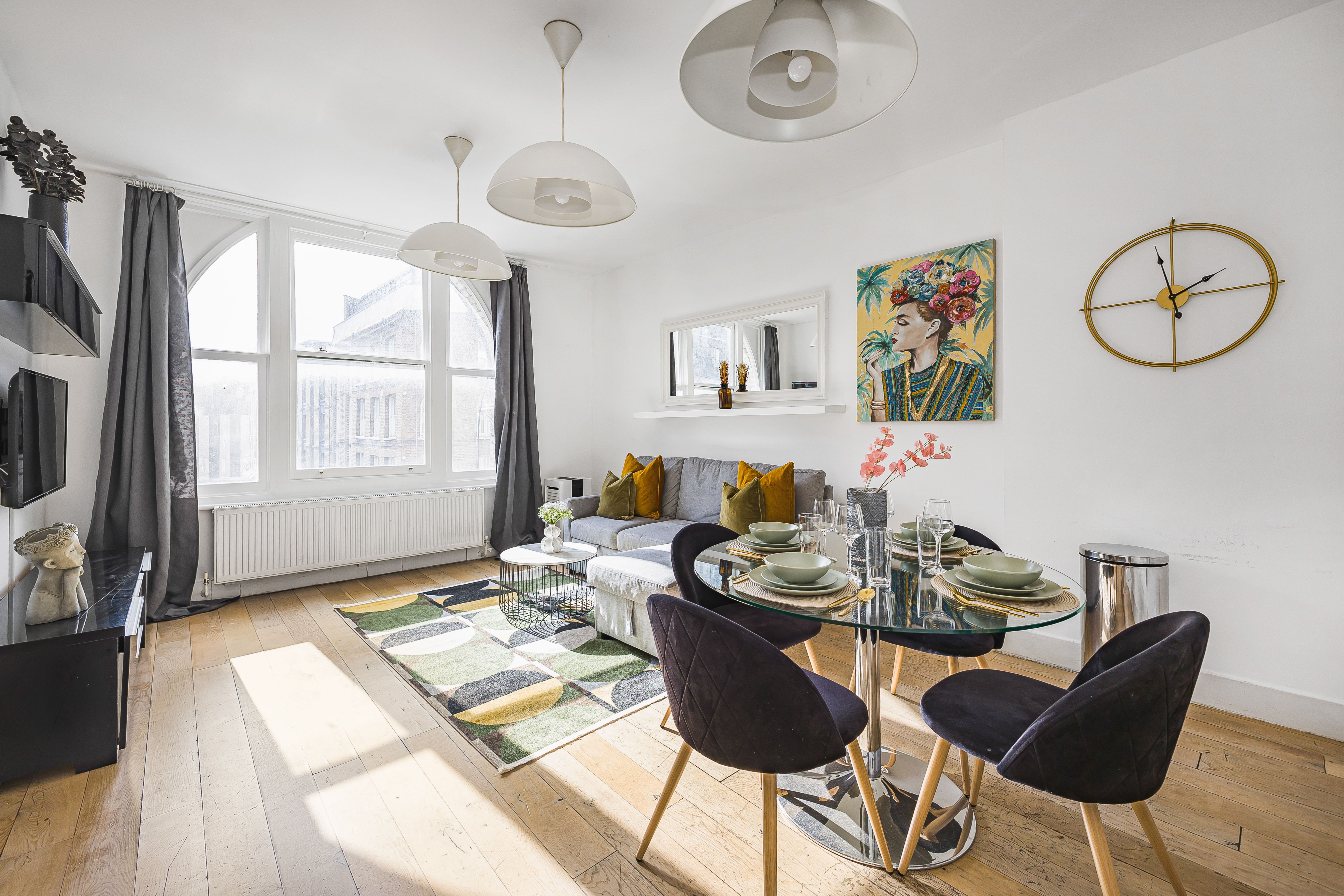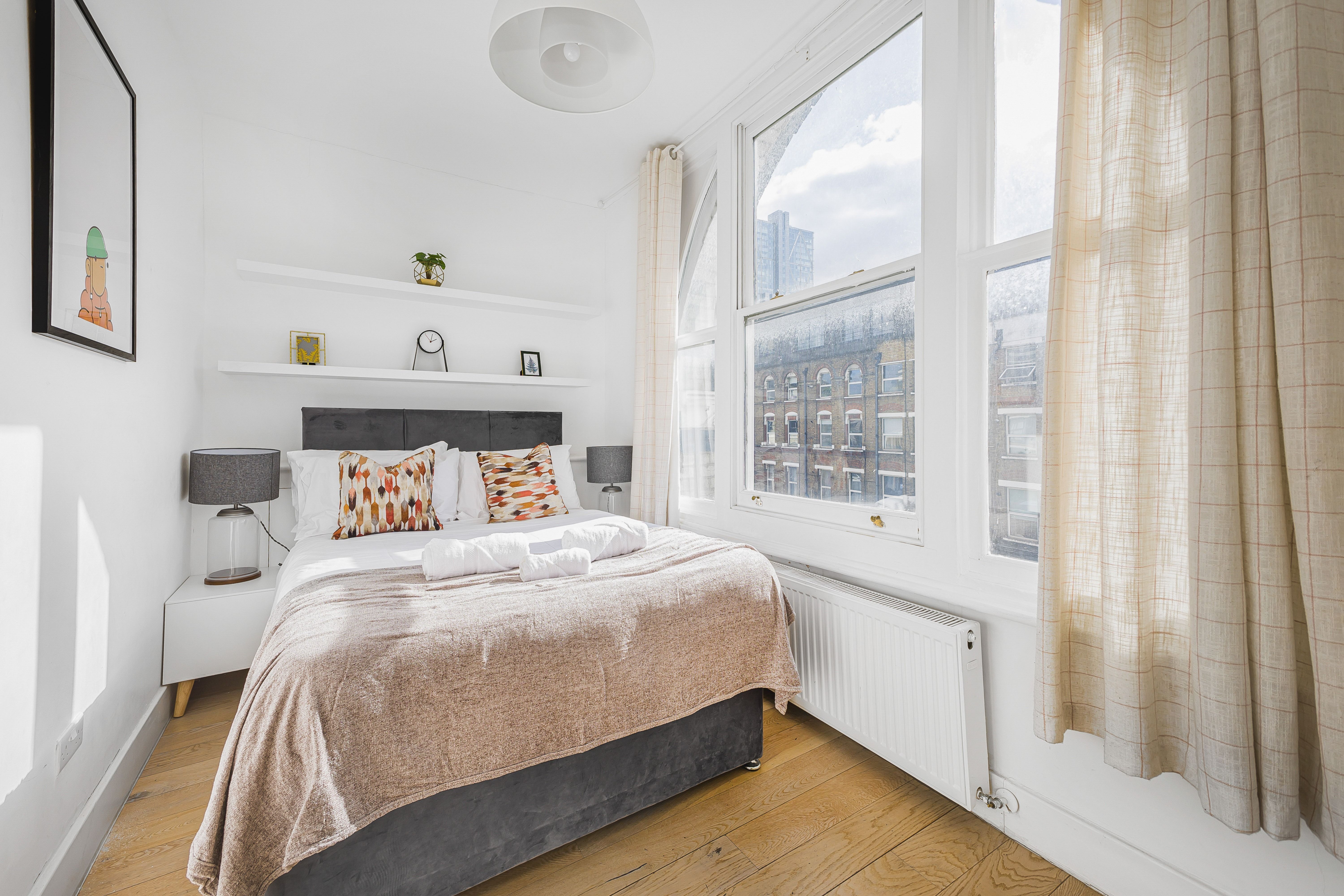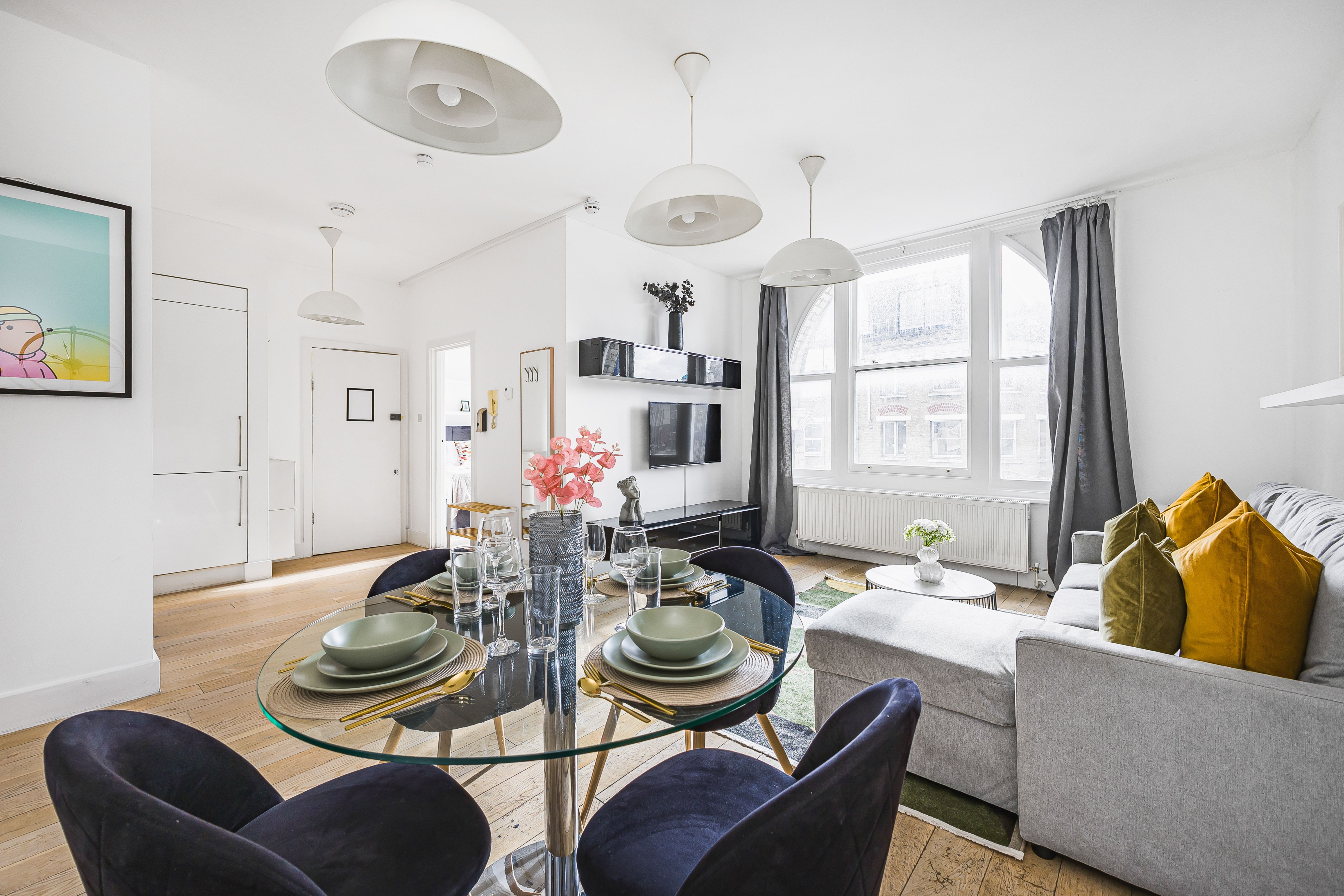 Ideal for families and groups of friends, this modern, attractive apartment is a delightful home-from-home. It’s bright and welcoming, with colourful artwork throughout, and large windows in the open-plan living and dining space. With a guest count of seven, two guests will sleep on a sofa bed in this space – we think sticking to five guests will be more comfortable for longer stays. The contemporary kitchen has everything you’ll need to whip up meals, but you’ll also have a wealth of cafes and eateries nearby – you’ll be in the thick of things in this Shoreditch abode.
