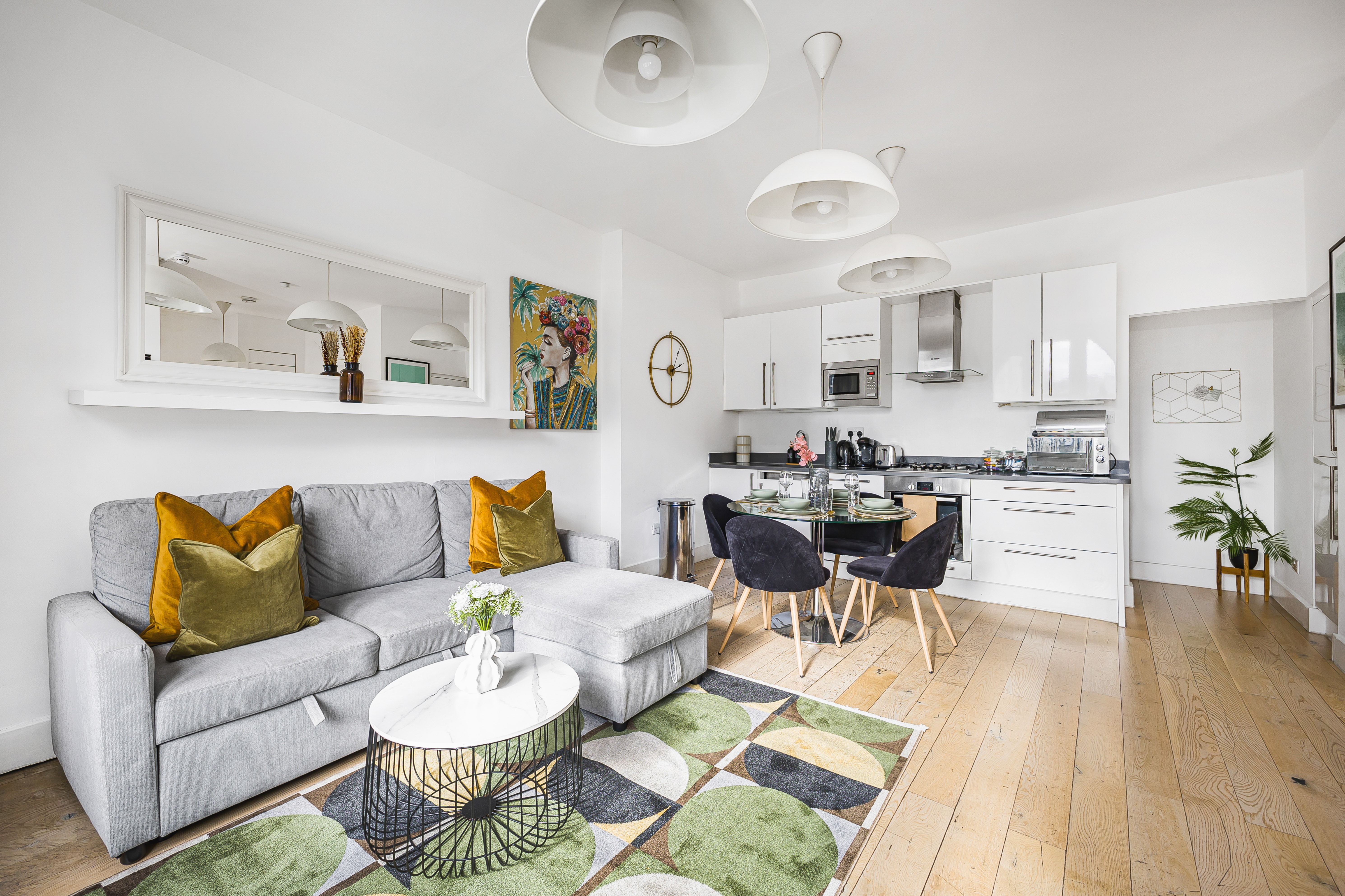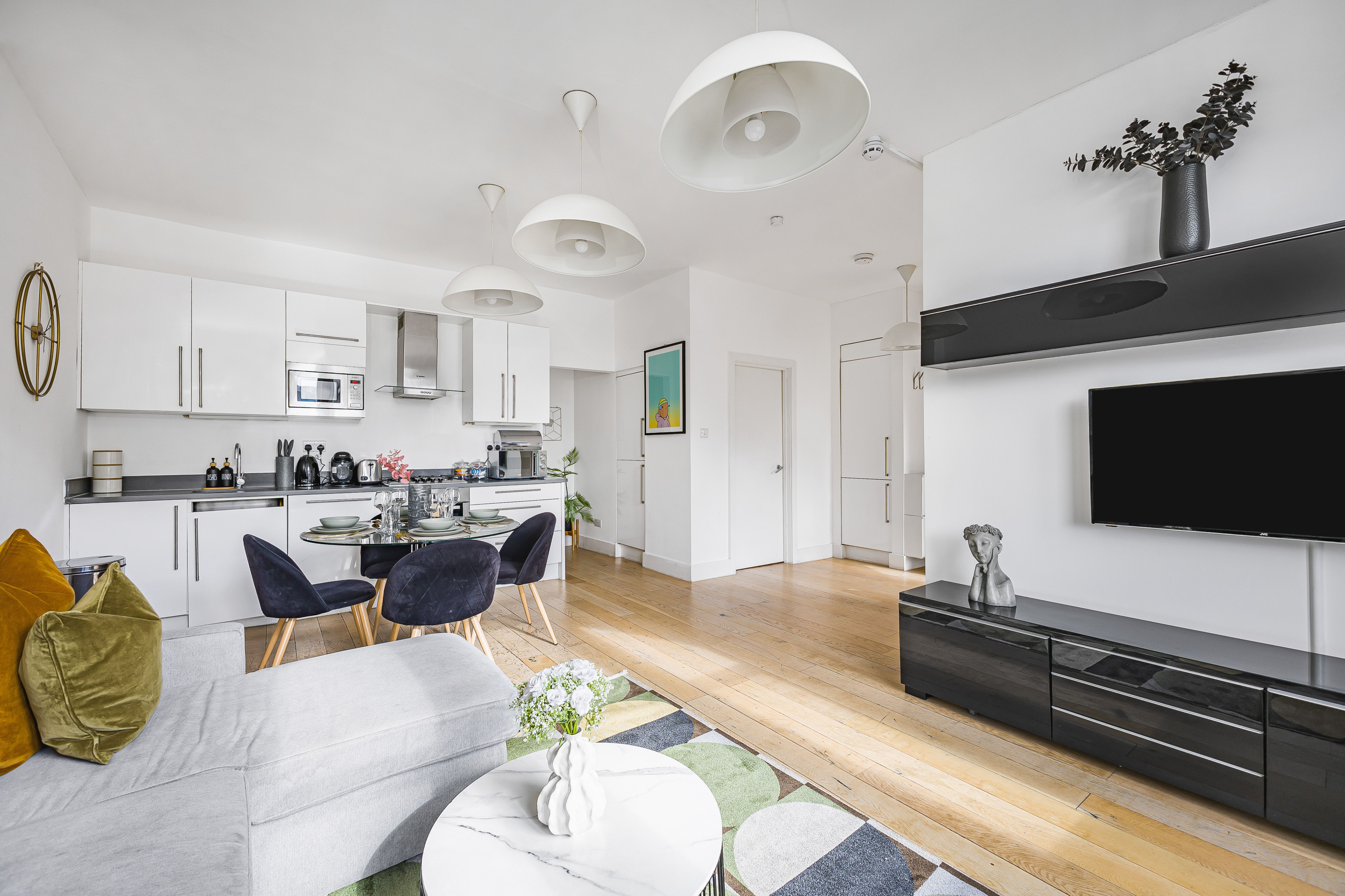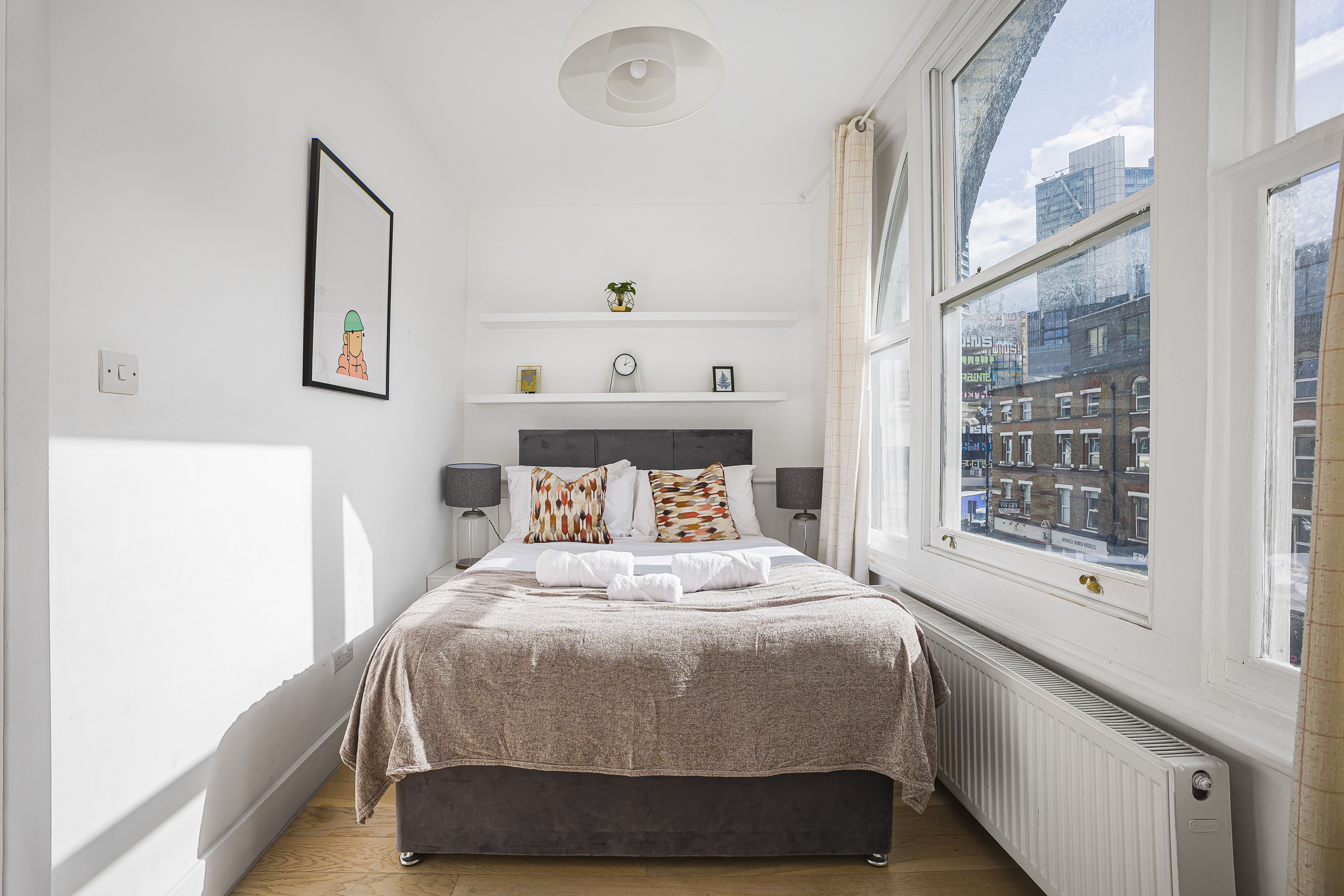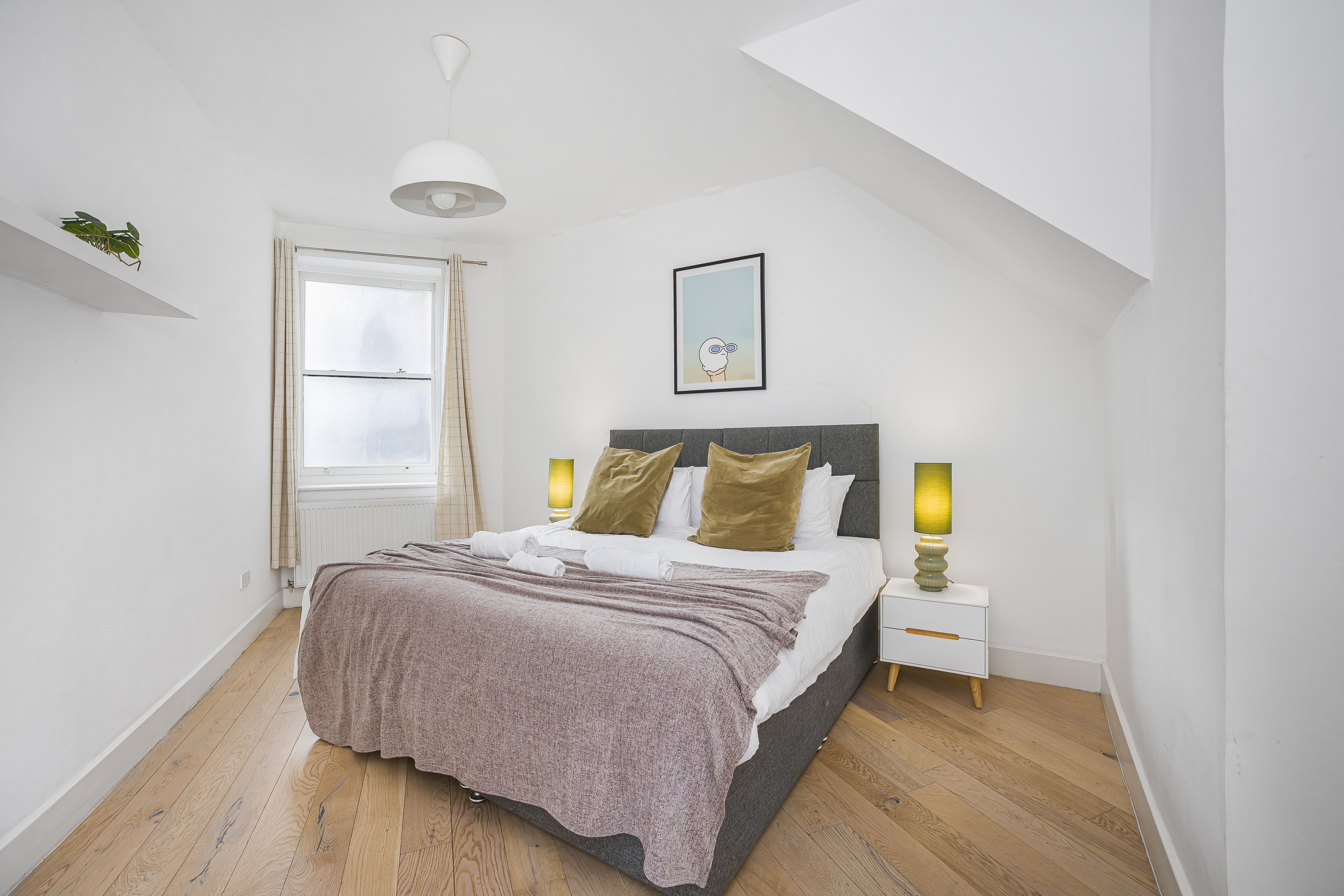 Ideal for families and groups of friends, this modern, attractive apartment is a delightful home-from-home. It’s bright and welcoming, with colourful artwork throughout, and large windows in the open-plan living and dining space. With a guest count of seven, two guests will sleep on a sofa bed in this space – we think sticking to five guests will be more comfortable for longer stays. The contemporary kitchen has everything you’ll need to whip up meals, but you’ll also have a wealth of cafes and eateries nearby – you’ll be in the thick of things in this Shoreditch abode.
