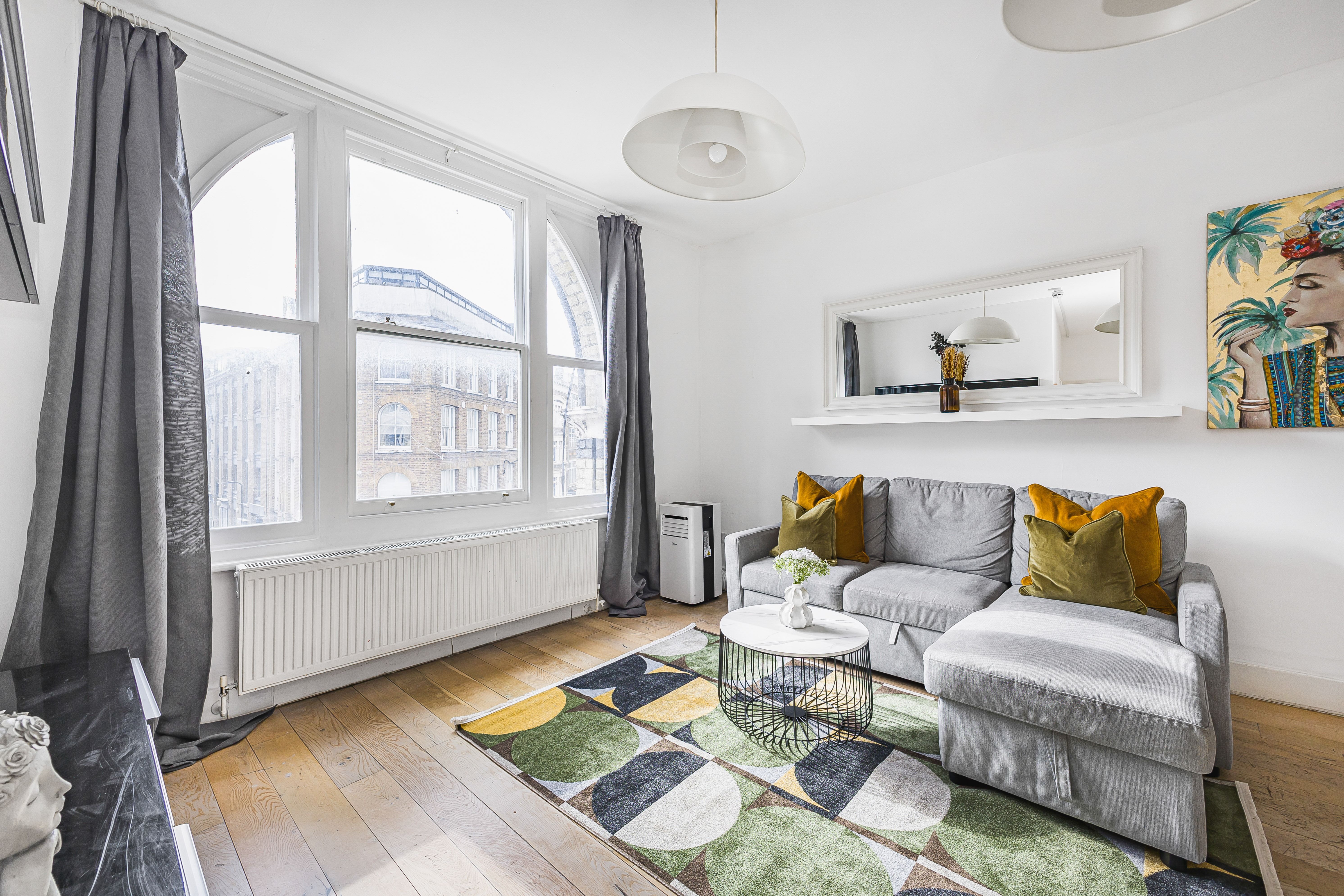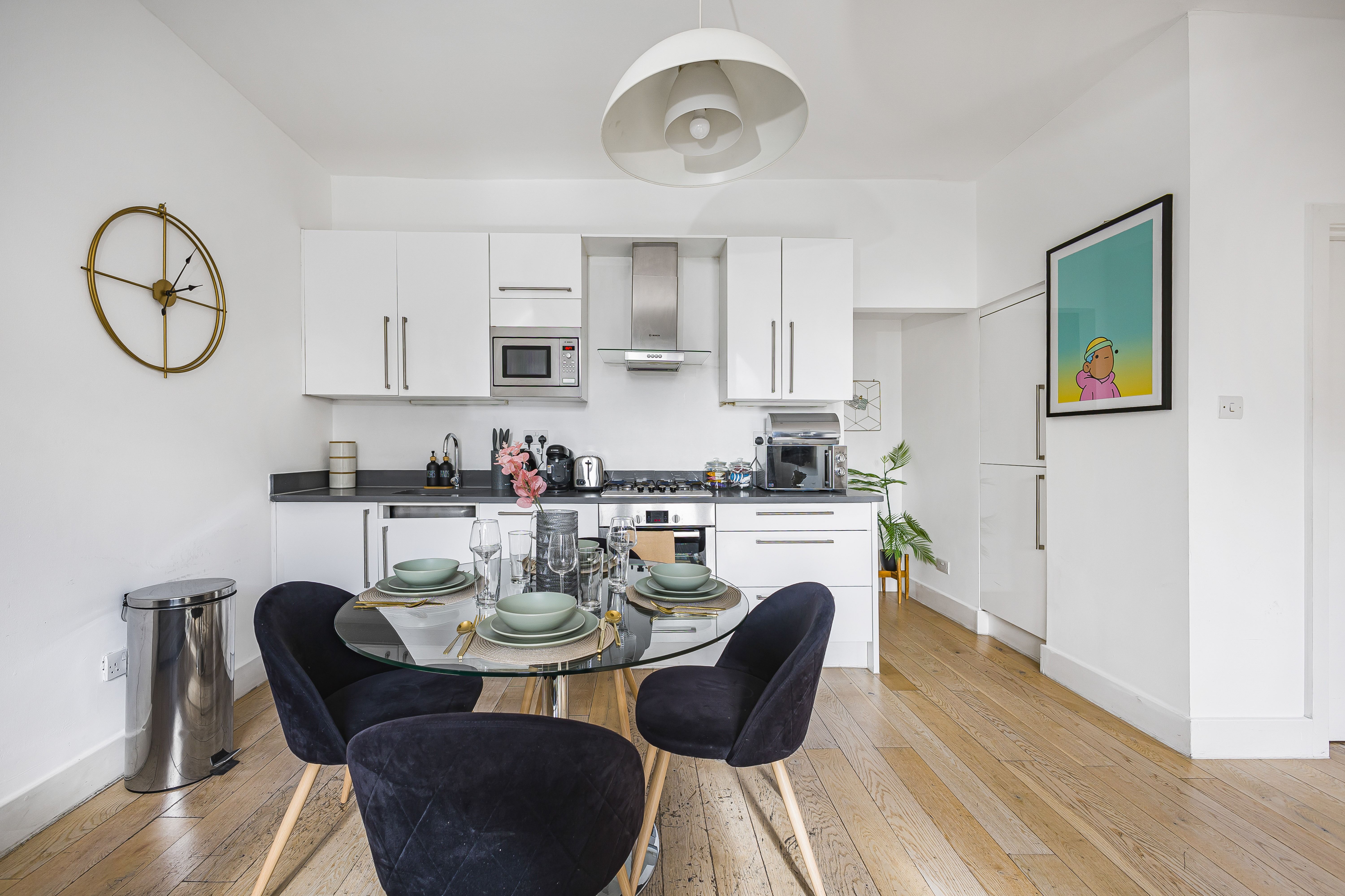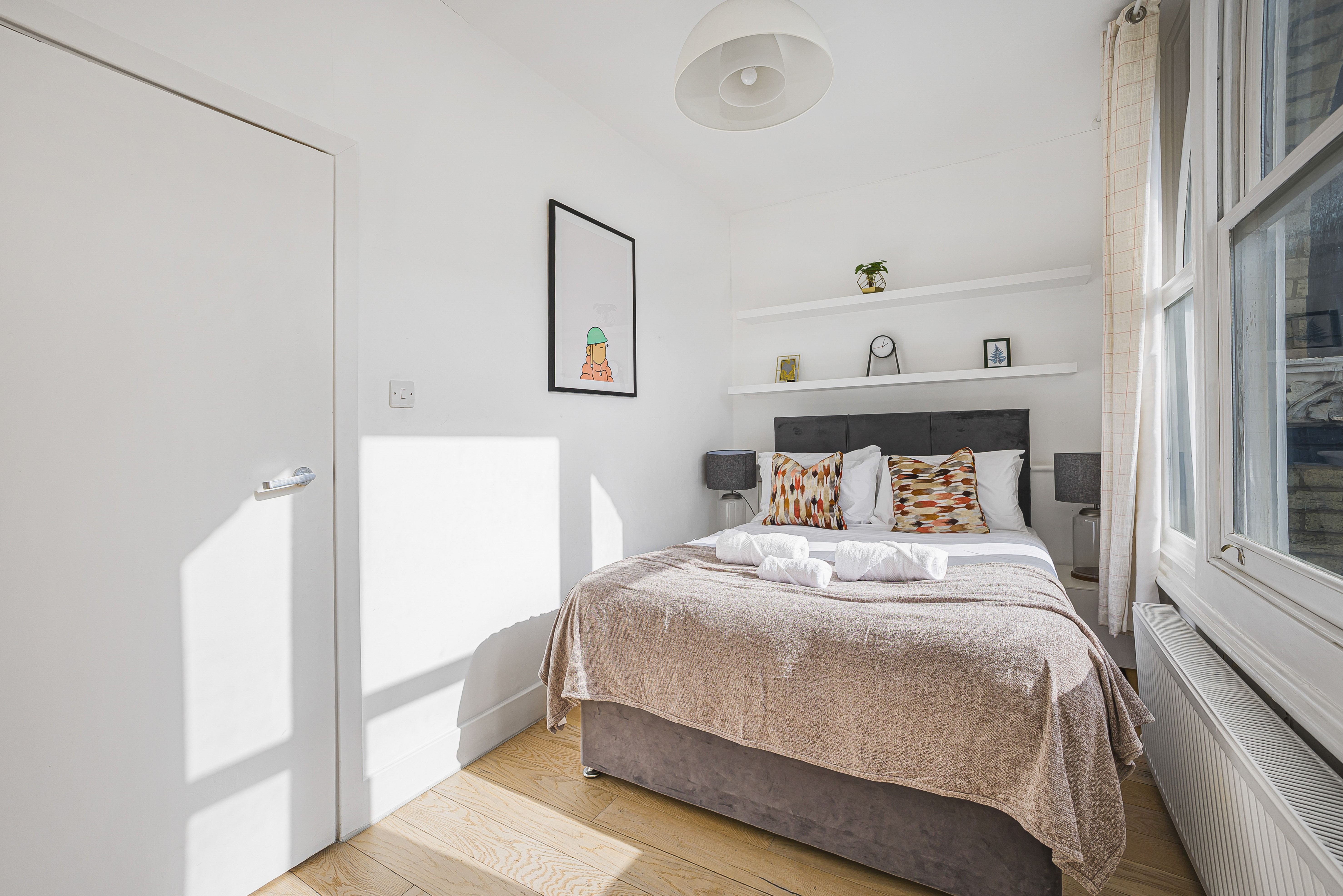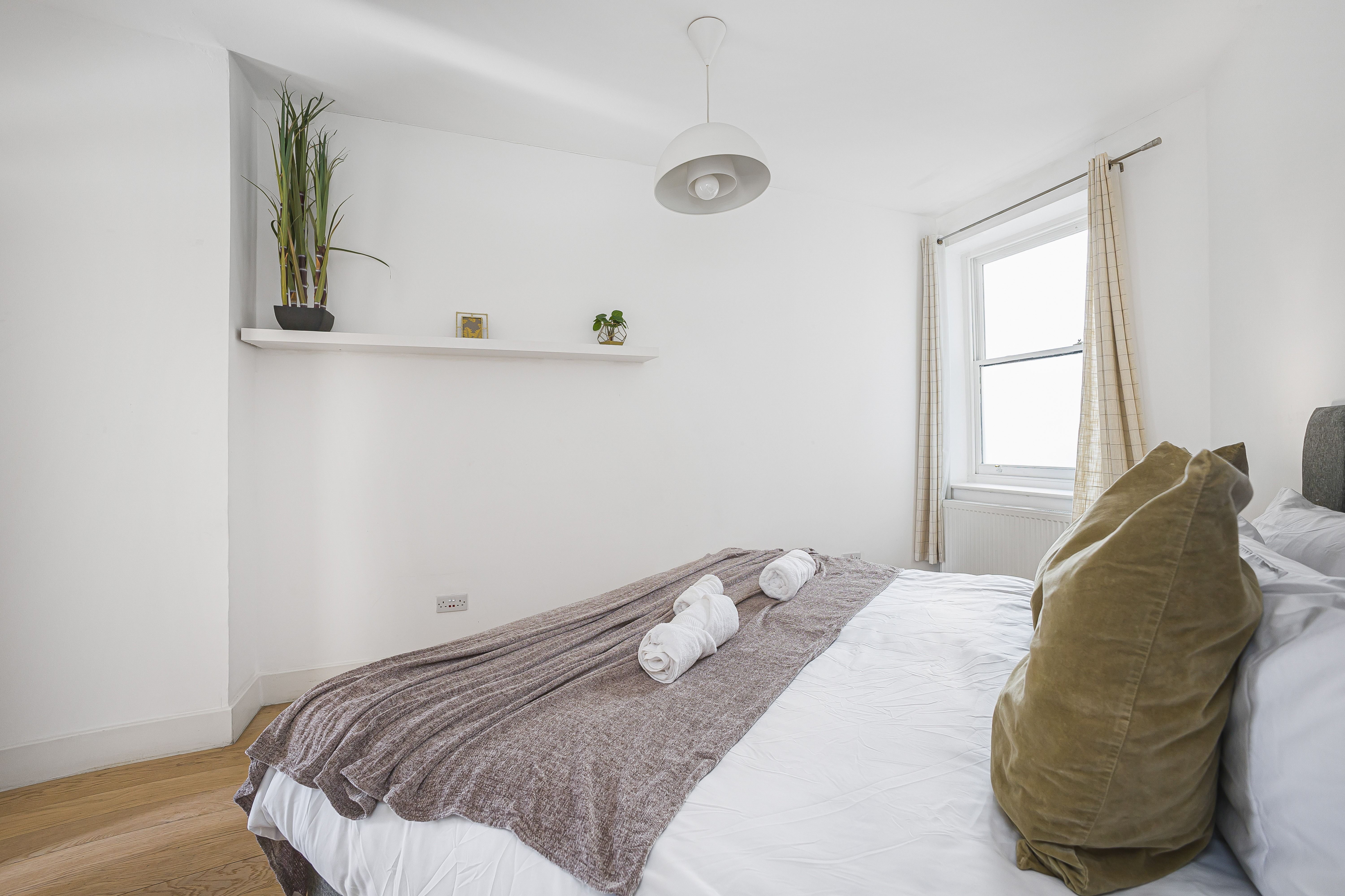 Ideal for families and groups of friends, this modern, attractive apartment is a delightful home-from-home. It’s bright and welcoming, with colourful artwork throughout, and large windows in the open-plan living and dining space. With a guest count of seven, two guests will sleep on a sofa bed in this space – we think sticking to five guests will be more comfortable for longer stays. The contemporary kitchen has everything you’ll need to whip up meals, but you’ll also have a wealth of cafes and eateries nearby – you’ll be in the thick of things in this Shoreditch abode.