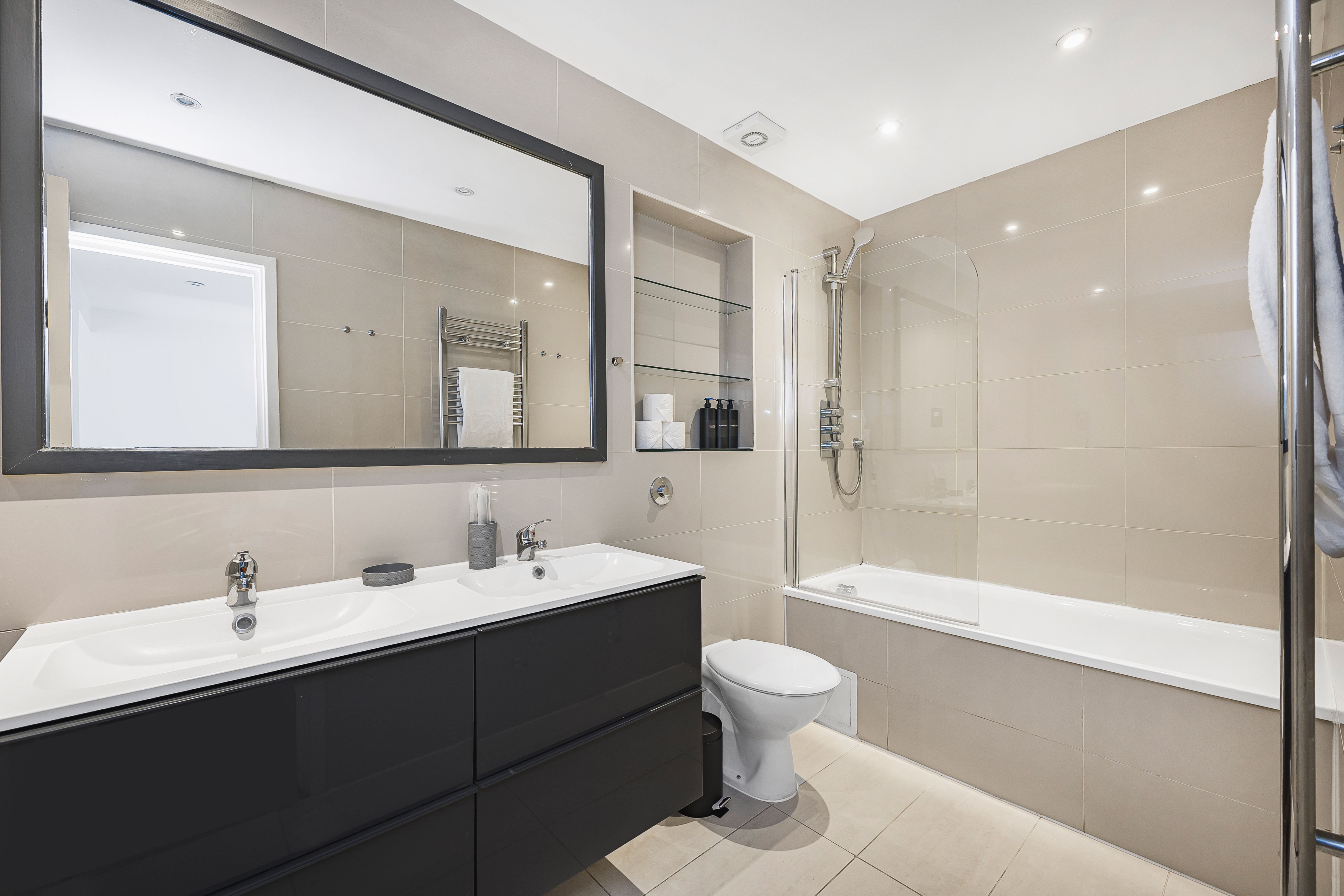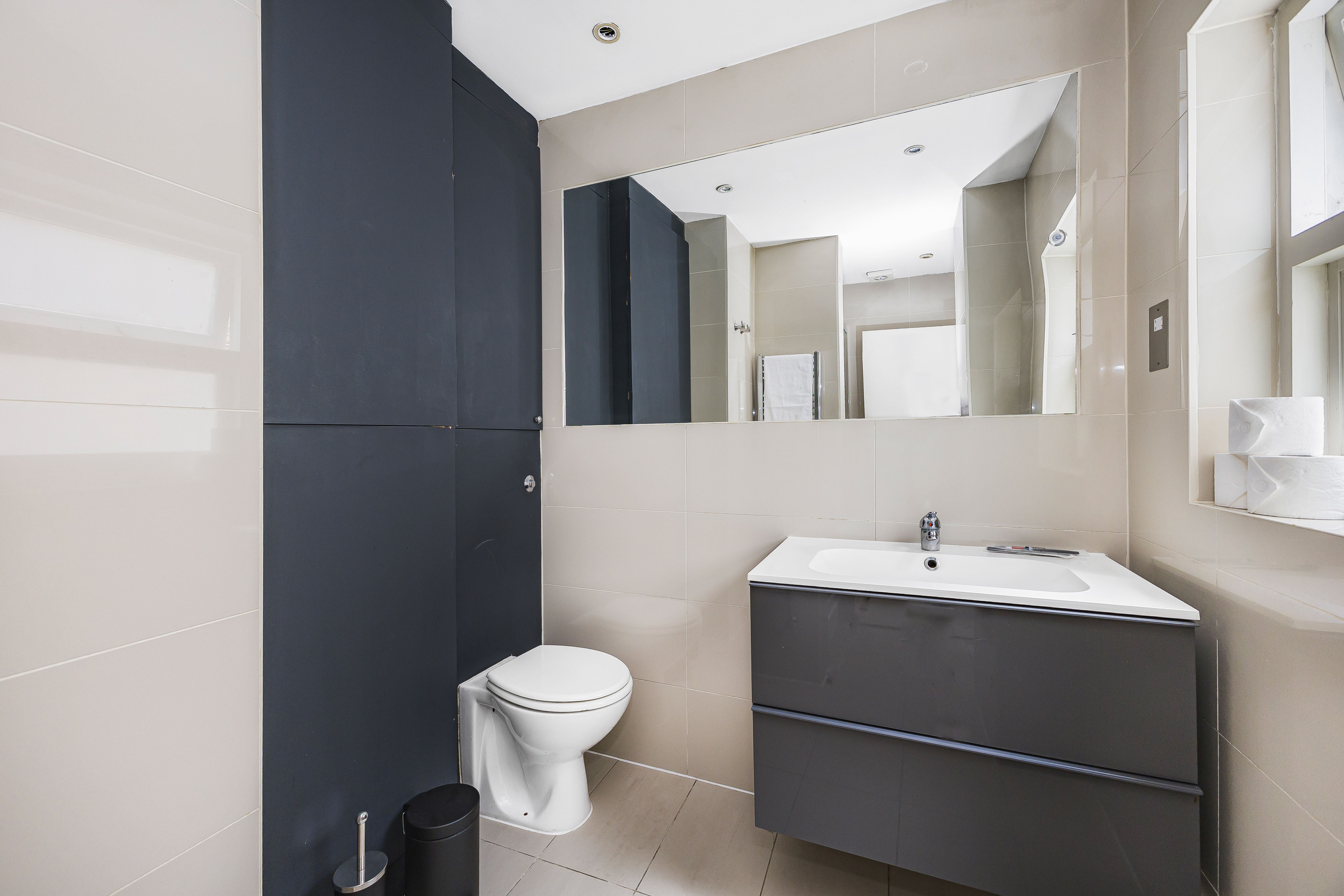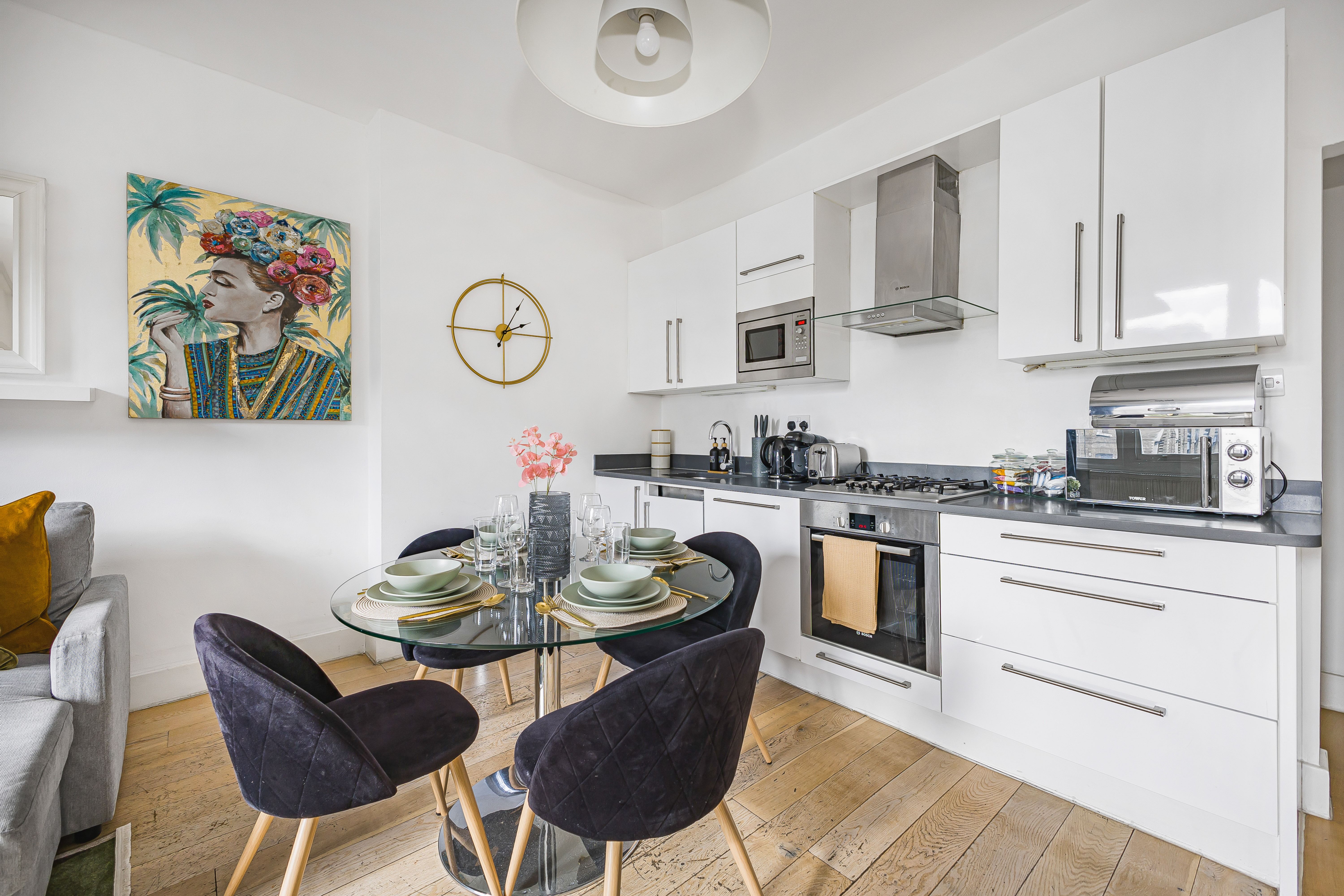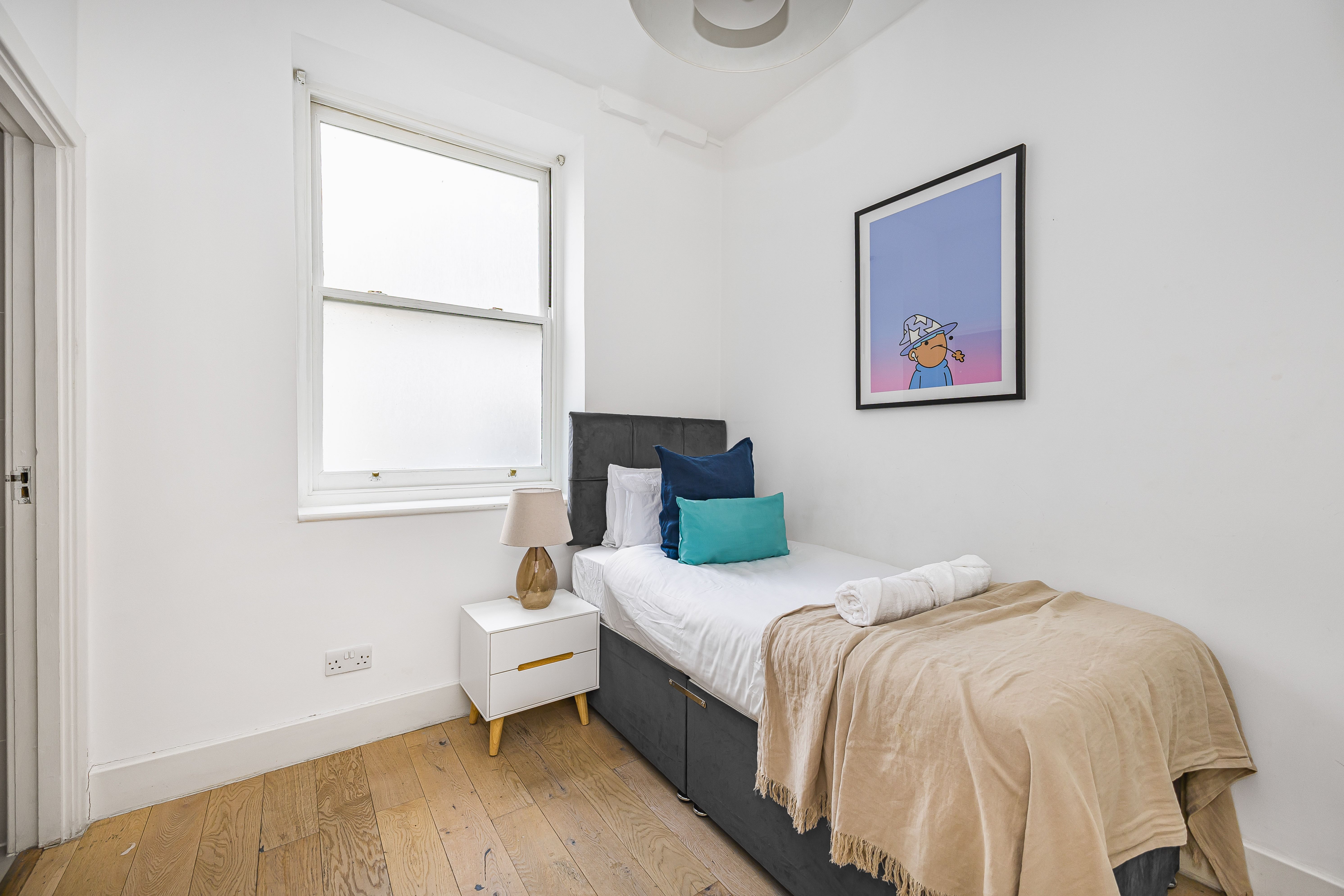 Ideal for families and groups of friends, this modern, attractive apartment is a delightful home-from-home. It’s bright and welcoming, with colourful artwork throughout, and large windows in the open-plan living and dining space. With a guest count of seven, two guests will sleep on a sofa bed in this space – we think sticking to five guests will be more comfortable for longer stays. The contemporary kitchen has everything you’ll need to whip up meals, but you’ll also have a wealth of cafes and eateries nearby – you’ll be in the thick of things in this Shoreditch abode.