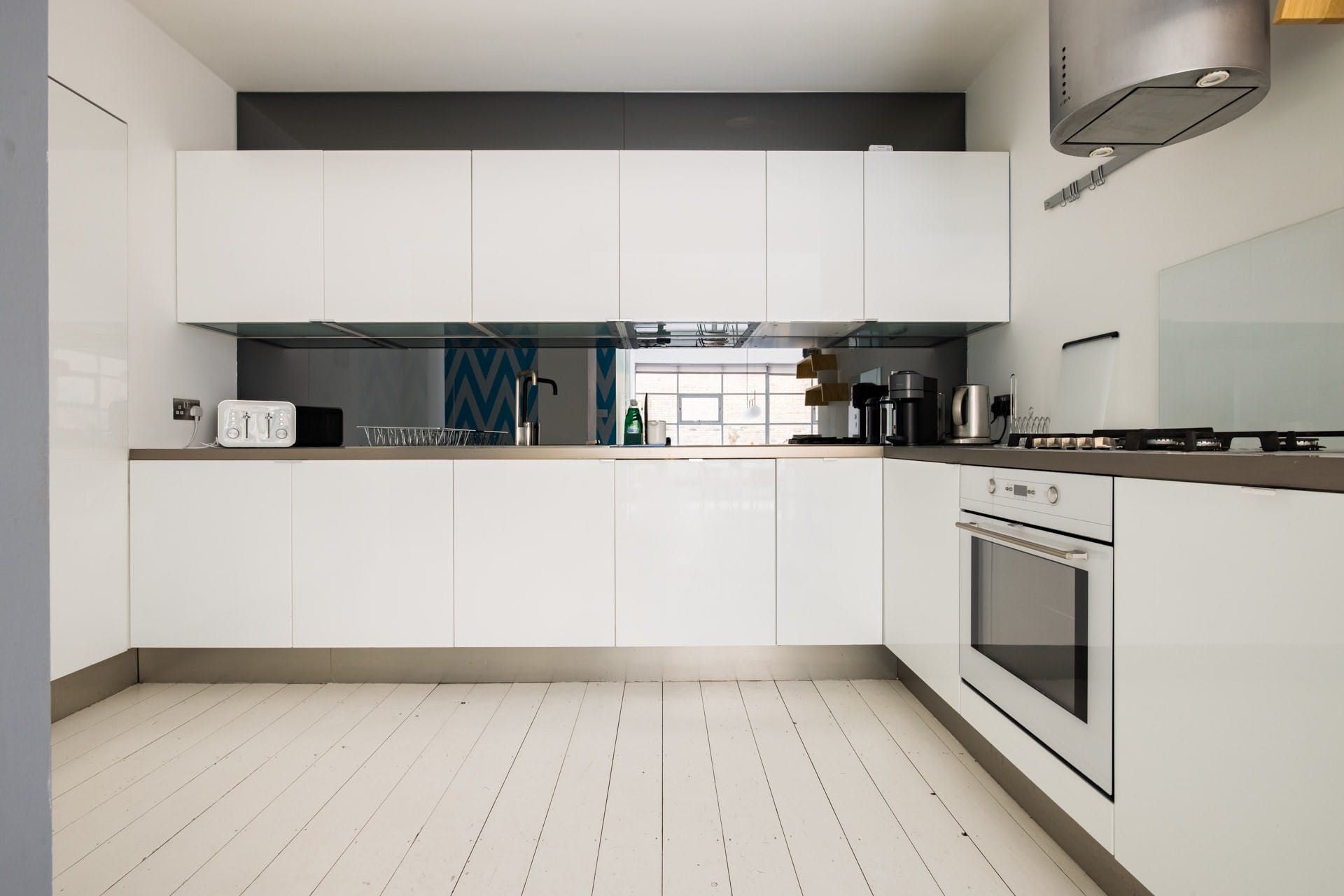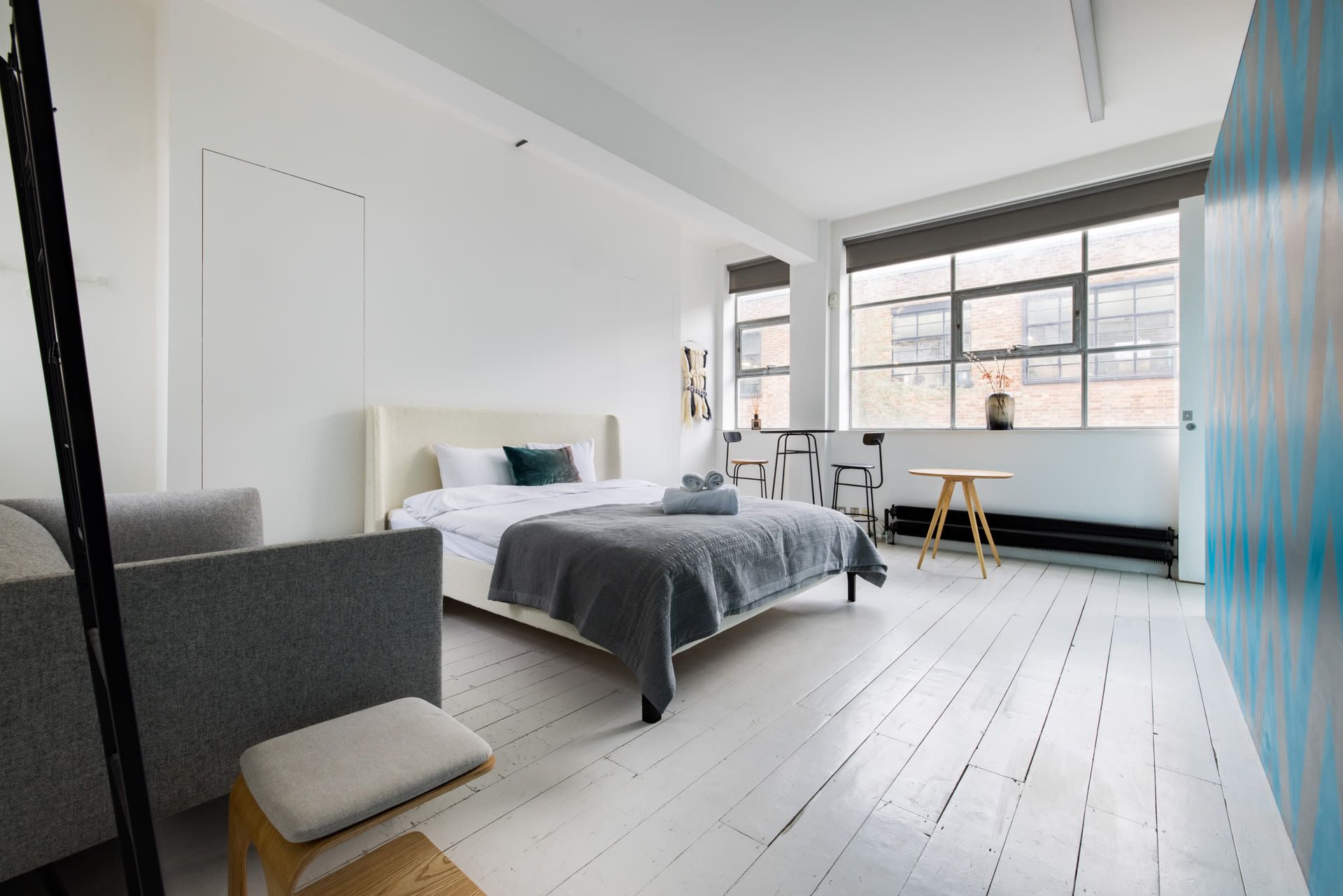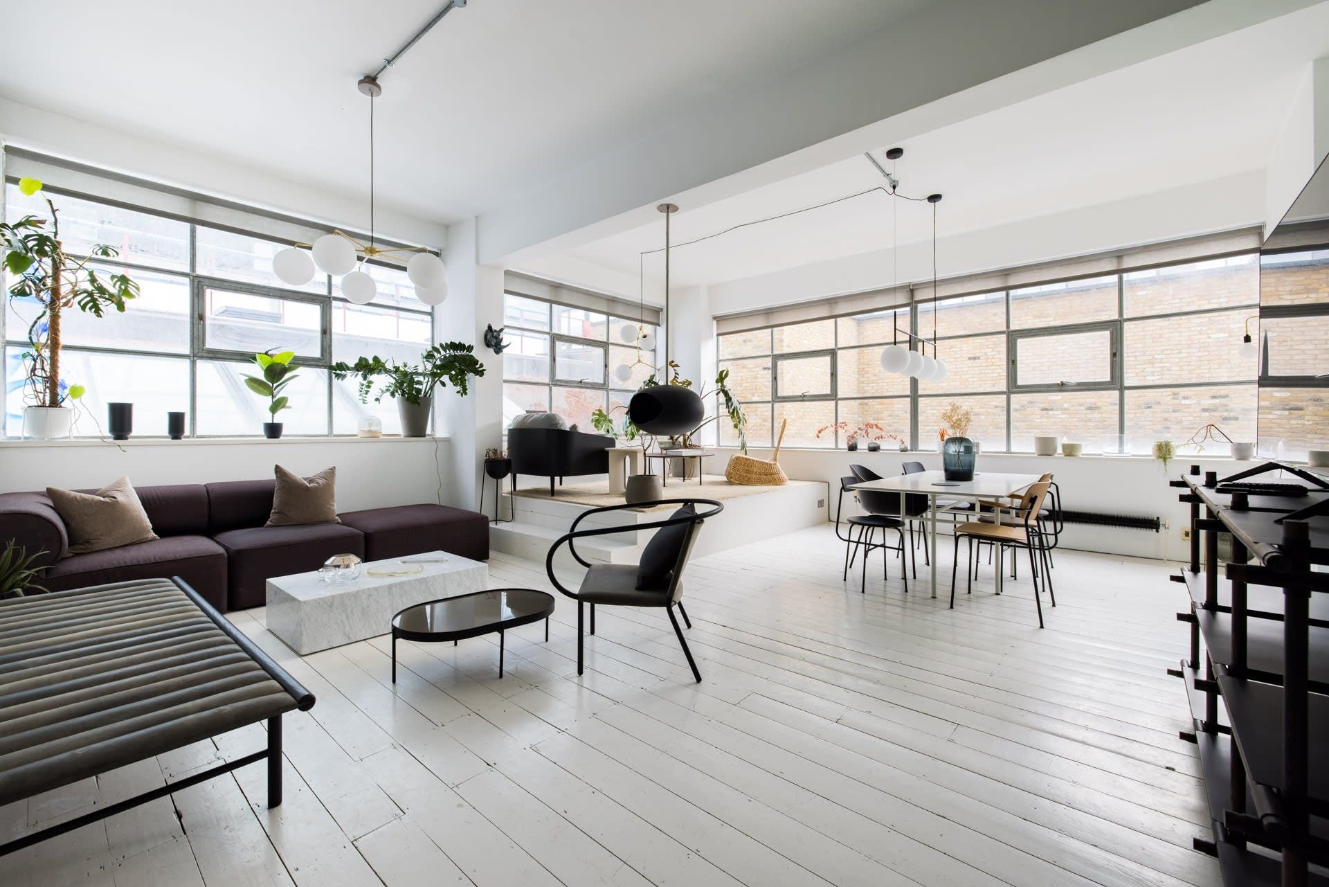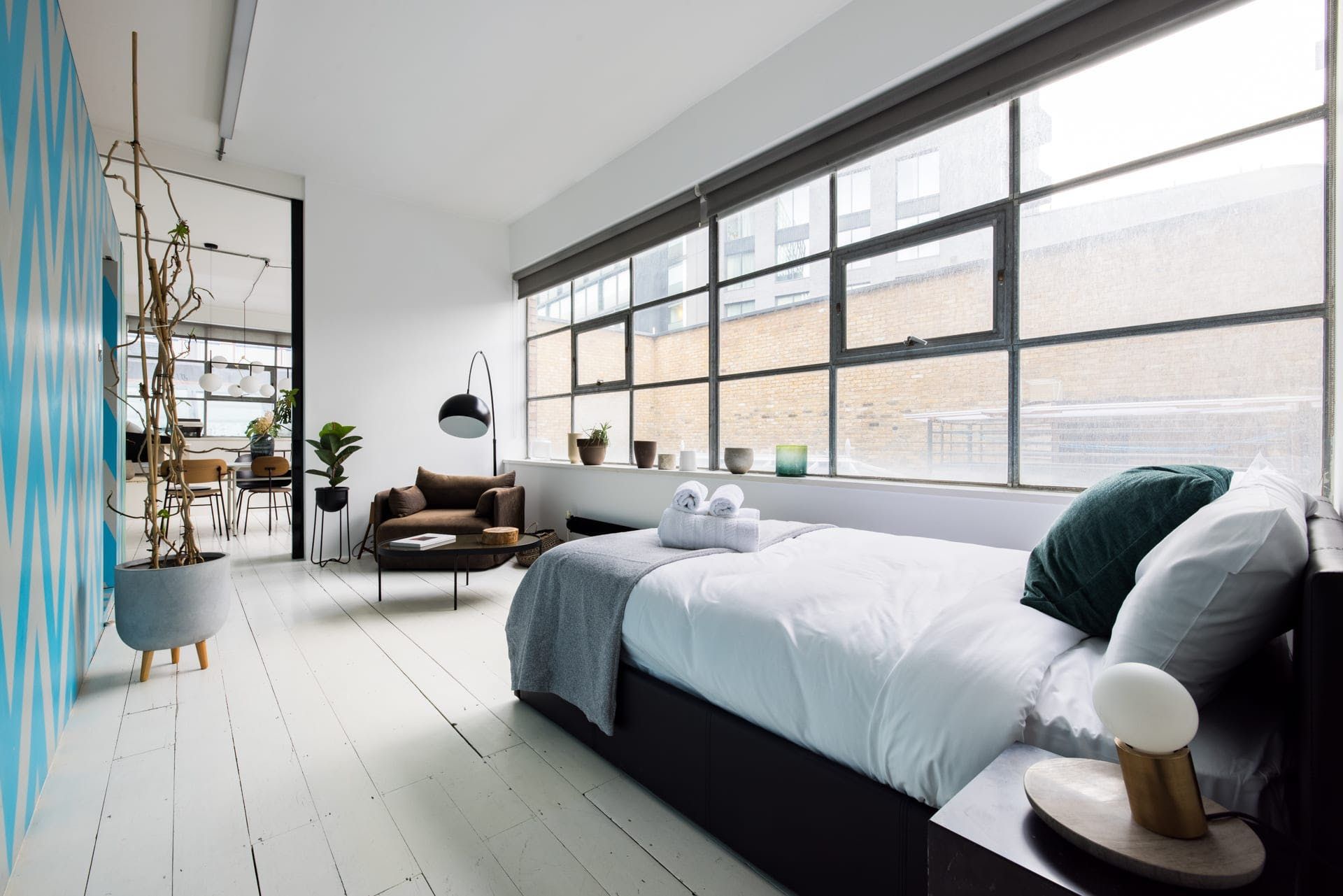 Dazzlingly bright thanks to its large windows, this stunning open-plan apartment is a treat for those looking to explore London’s trendiest postcode. Located just a five-minute walk from Shoreditch High Street station, the area’s arty atmosphere is reflected in the home’s cool design, from the white panelled floors to the stylish furnishings and huge panes of glass that allow plenty of sunlight to shine in. A plethora of houseplants adds vibrant pops of green against the monochromatic main room, with a chic dining table beckoning celebratory feasts and a raised reading area inviting you to kick back and relax with a glass of wine. The same funky minimalism is echoed in the bedrooms, while the hallways and bathrooms are punctuated by splashes of blue that lend a serene vibe to this trendy loft-style home. When you’re not chilling out in your hip pad, go out and explore the vintage boutiques, eclectic bars and innovative restaurants on your doorstep. You’re also just a twelve-minute stroll from the colourful Columbia Road Flower Market, while Spitalfields Market is a ten-minute walk from your door.