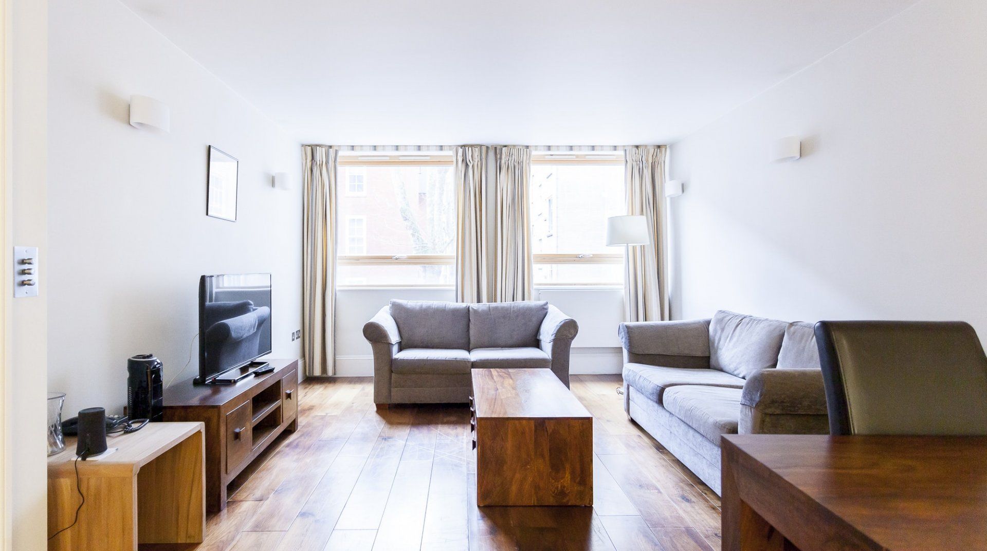 In the heart of Bloomsbury, one of London’s most authentic and central neighbourhoods, here you'll be within striking distance of Russell Square, and just across the street from Tavistock Square Gardens. This smart apartment is set in one of the area's typical buildings – with bedrooms at the back promising peace and quiet. Neat and practical, it's a great option for a family trip to London or a business stay. Dark wood floors and comfy sofas in the open-plan living space and joined by a dining table for up to four and a sleek, well kitted-out kitchen (hello waste disposal unit). Ride downstairs in your private lift, step outside and you'll be close to popular tourist attractions, such as the British Museum, the Postal Museum and the Charles Dickens Museum. You can easily walk to tonnes of brilliant restaurants, from high-end to local favourites, or hop on the Tube at nearby Russell Square and explore the rest of the city with ease.