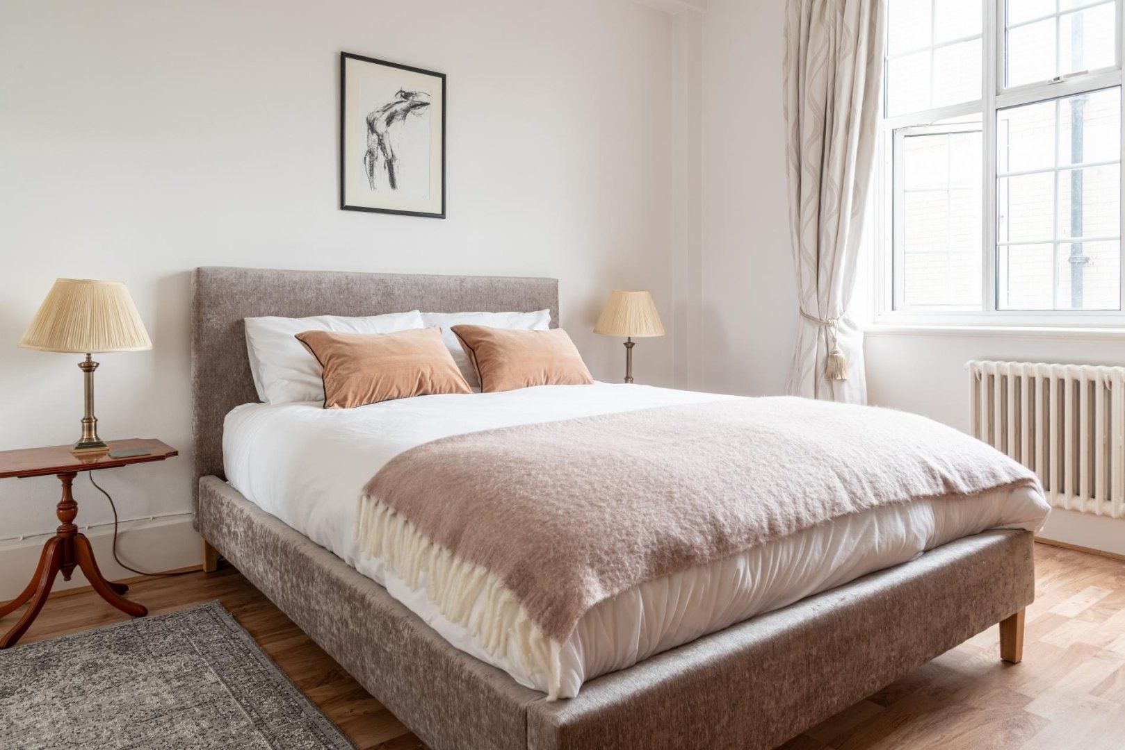 Positioned in Kensington, only a seven-minute stroll from Holland Park and The Design Museum, this home provides a stylish base for couples and solo travellers. It sits on the fifth floor and, through large bay windows, offers sweeping views over West London's rooftops.