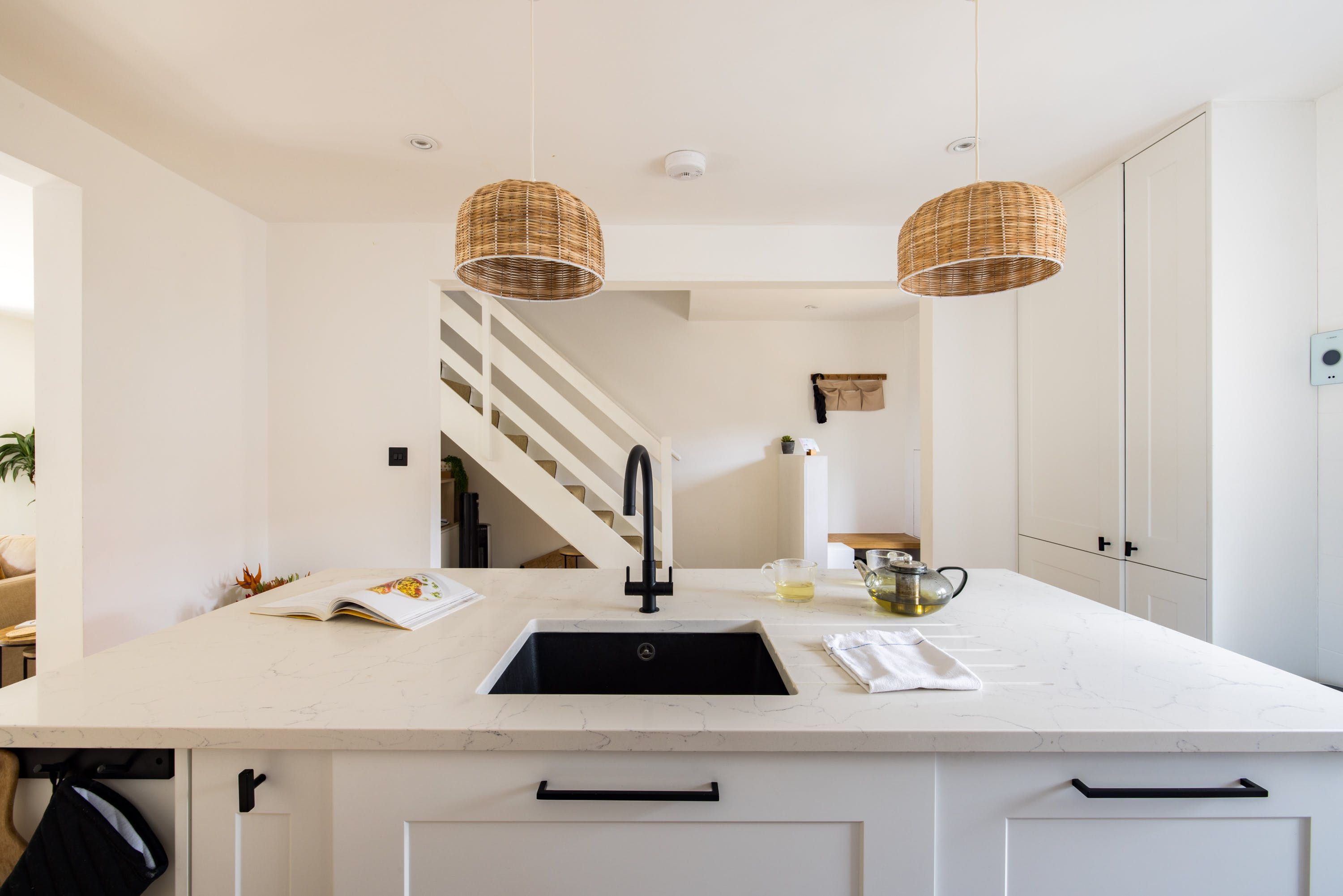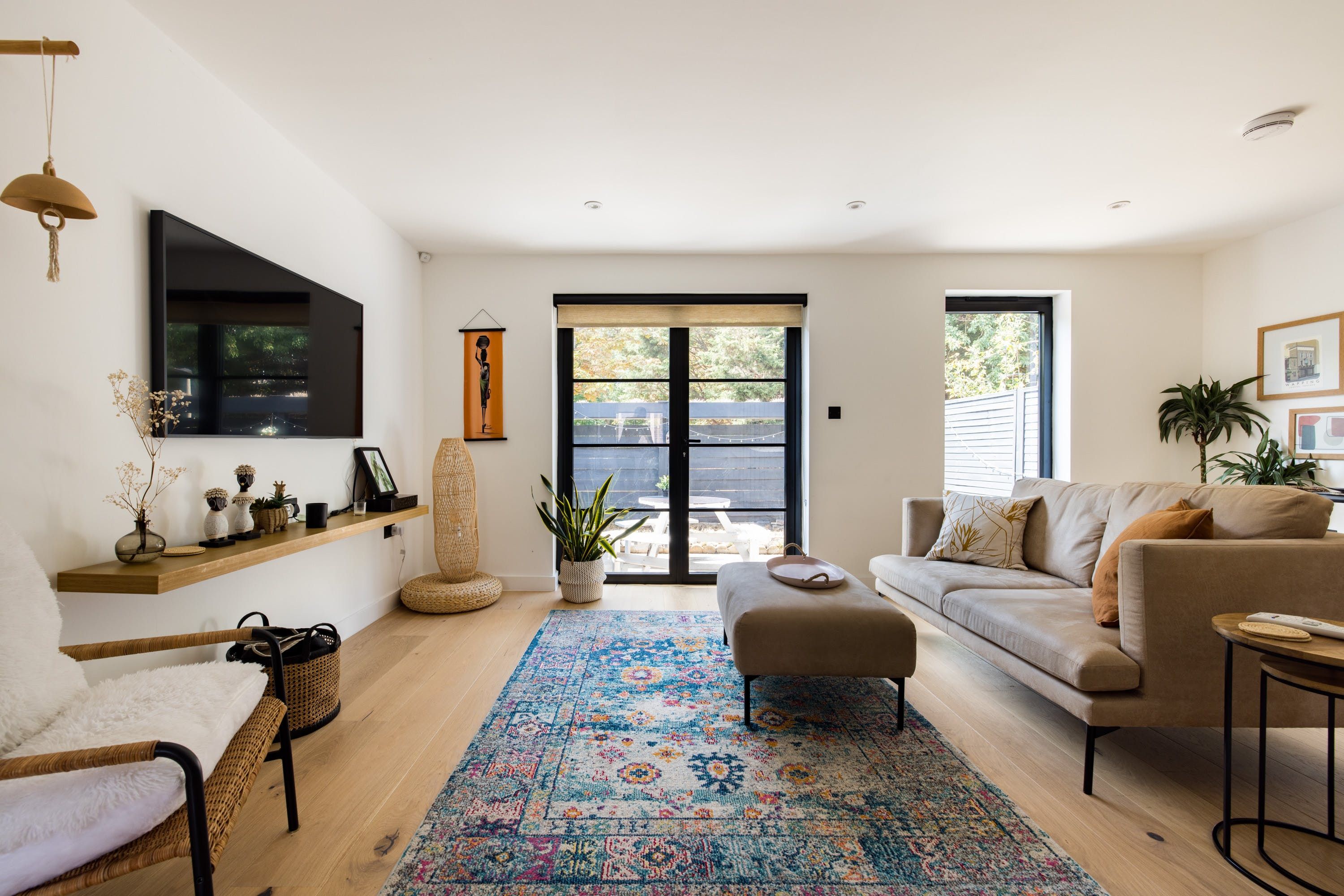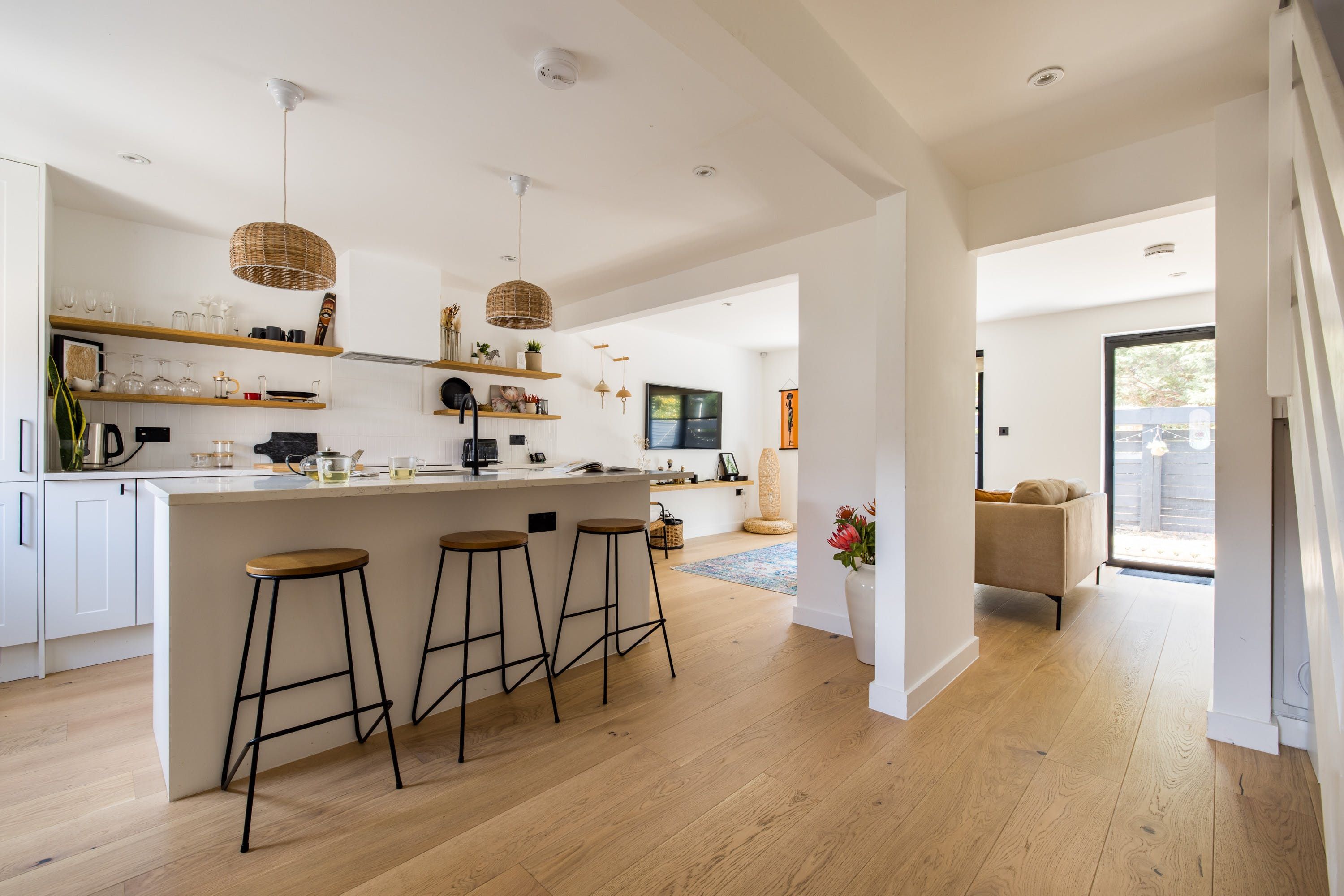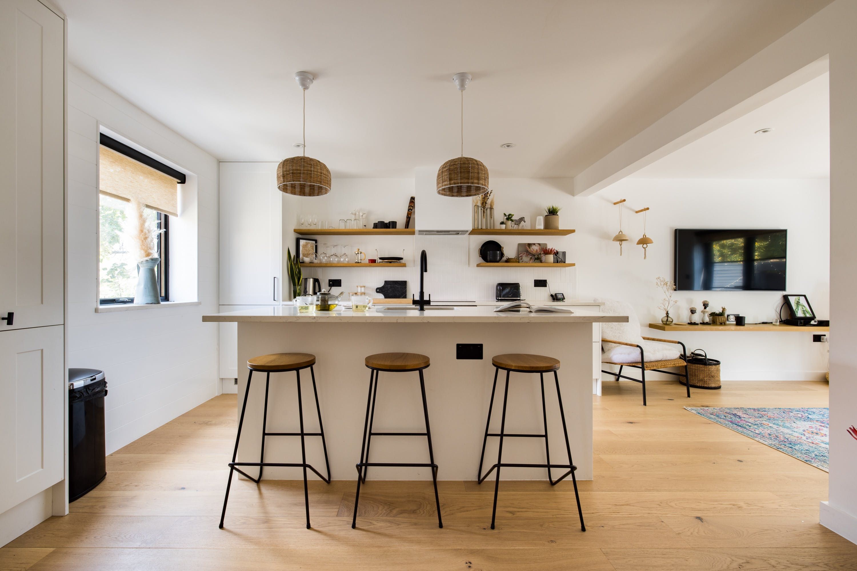 When the weather's not on your side, move into the chic style of your home. The earthy palette continues throughout the open plan living room and kitchen – light, brown shades mingle with the pure white tones on the walls and kitchen counter.