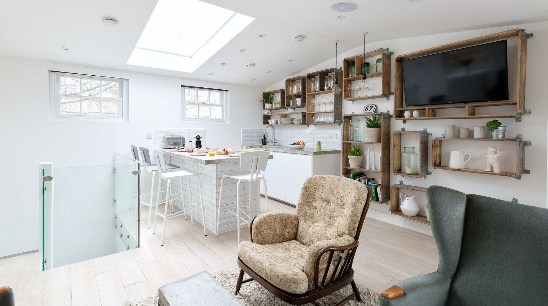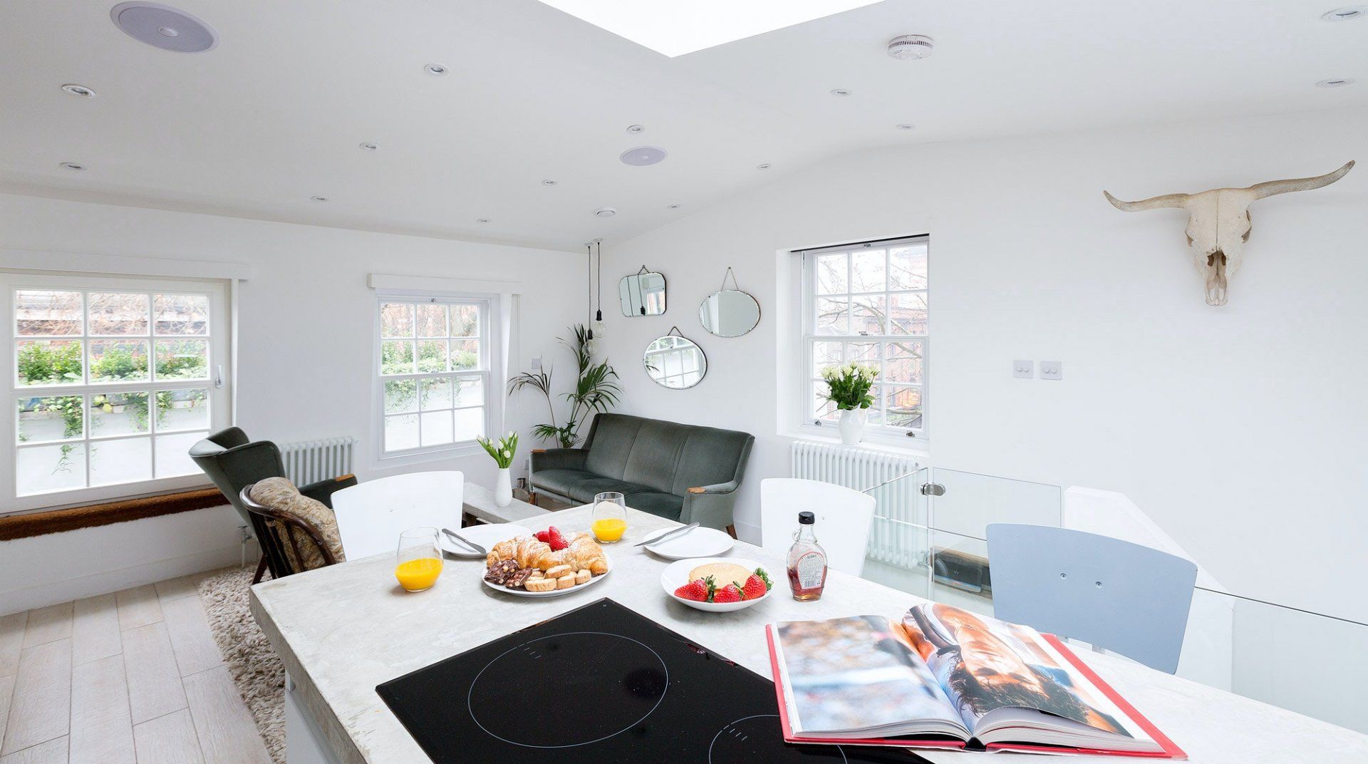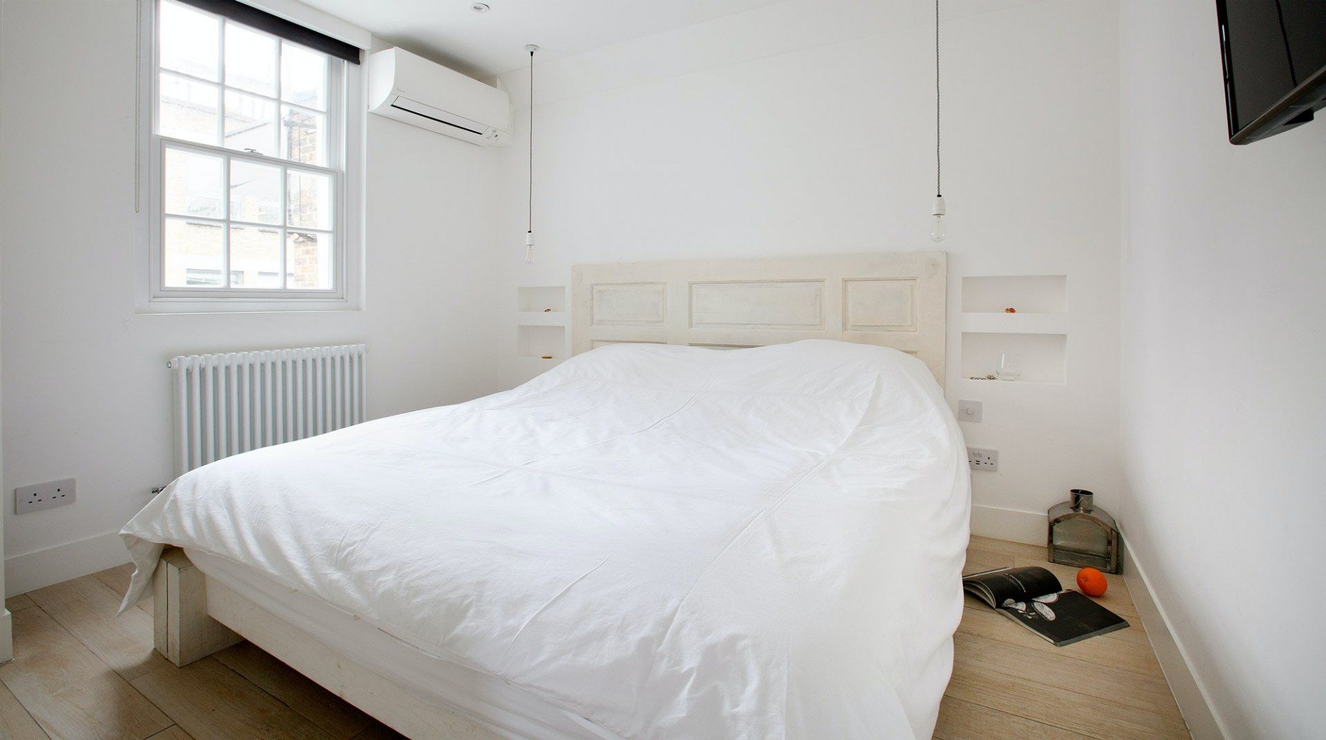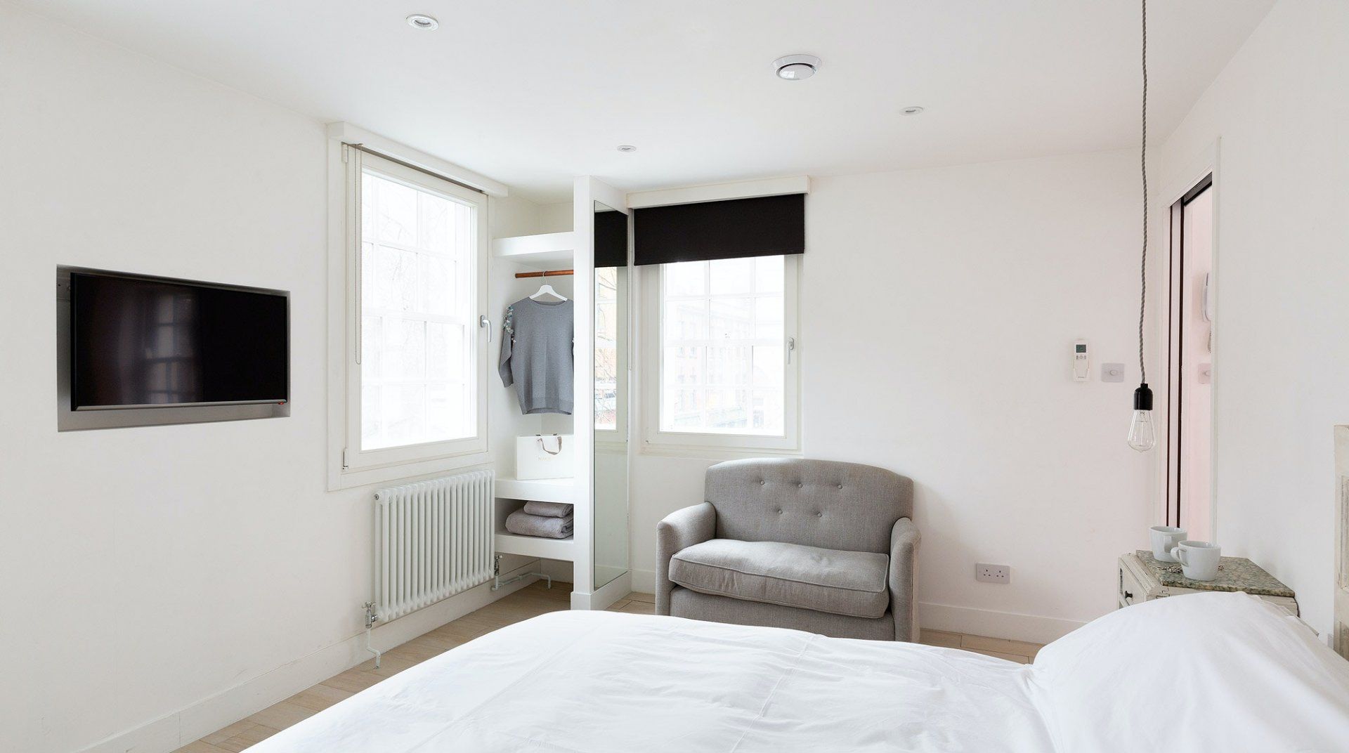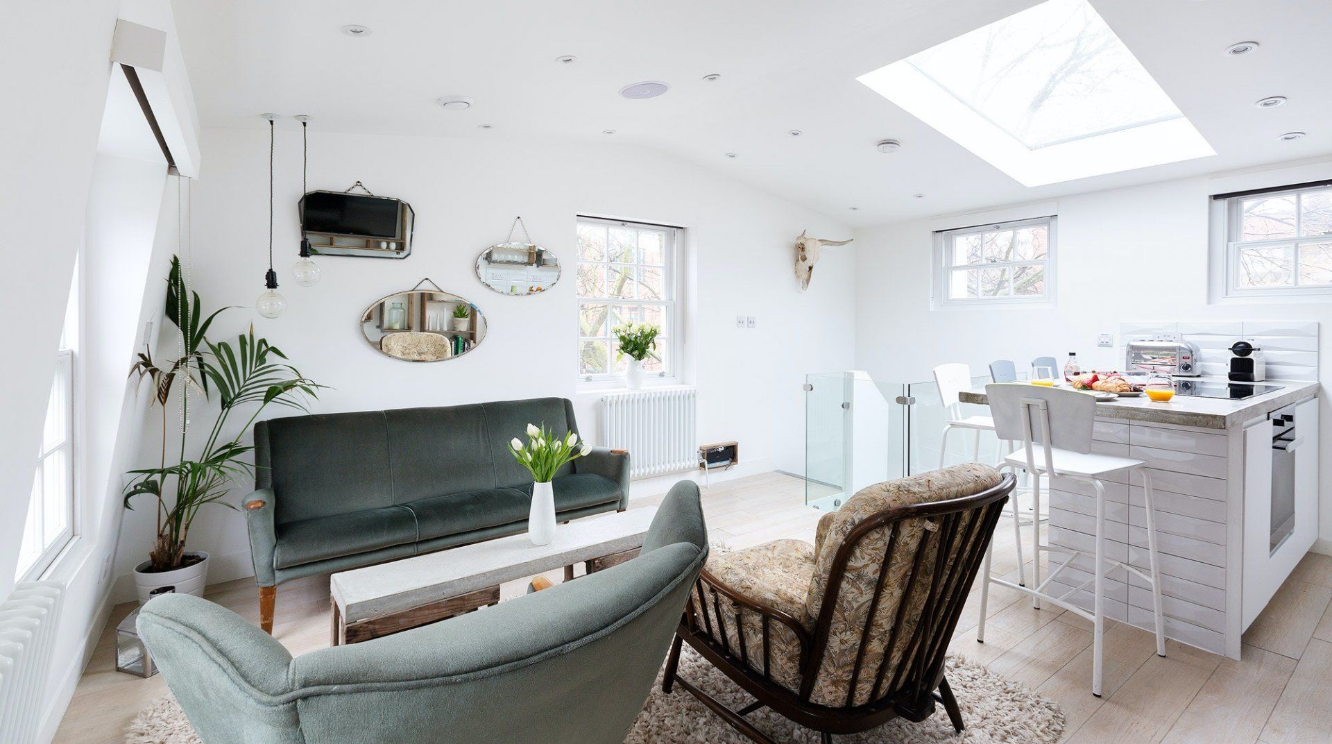 In Gina’s reverse duplex, bedrooms unusually take the lower level while the kitchen and living room are found upstairs beside a leafy mini-balcony. It’s also rare to find two super king-size beds, and even rarer for a spa-style bathroom to offer natural light with its standalone tub and TV. A minimal Scandi vibe runs throughout the beautiful apartment, incorporating suspended lamps, wall nooks, recycled woods and cacti. Right outside is the villagey Exmouth Market street, famed among Londoners for its superb restaurants.