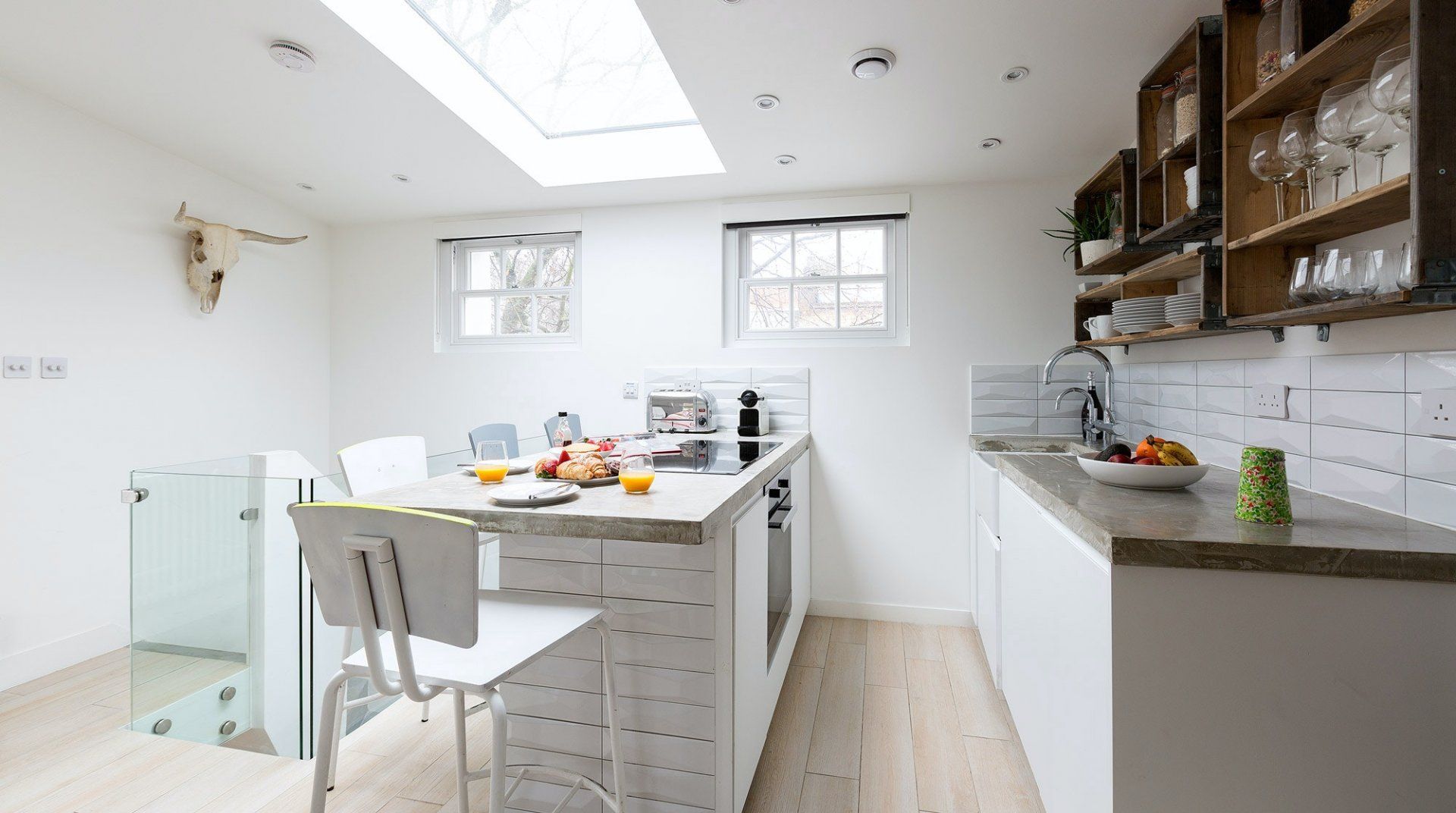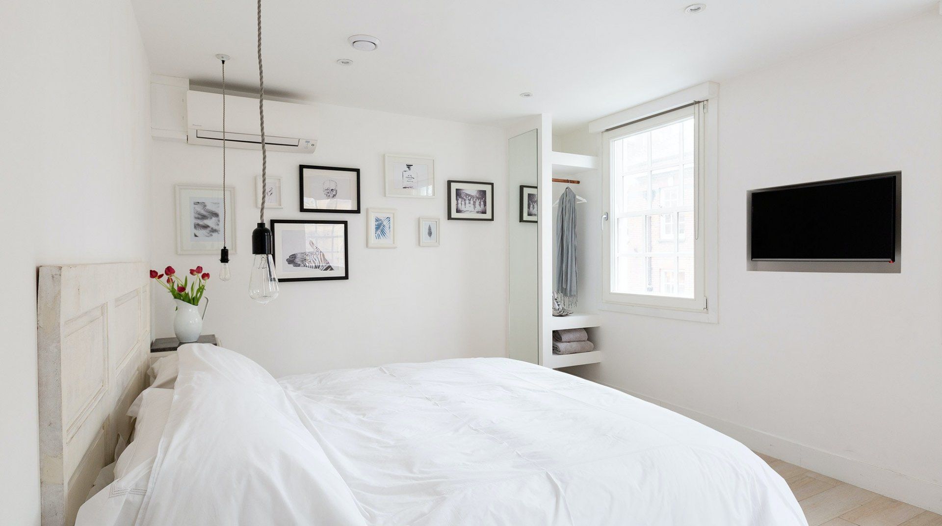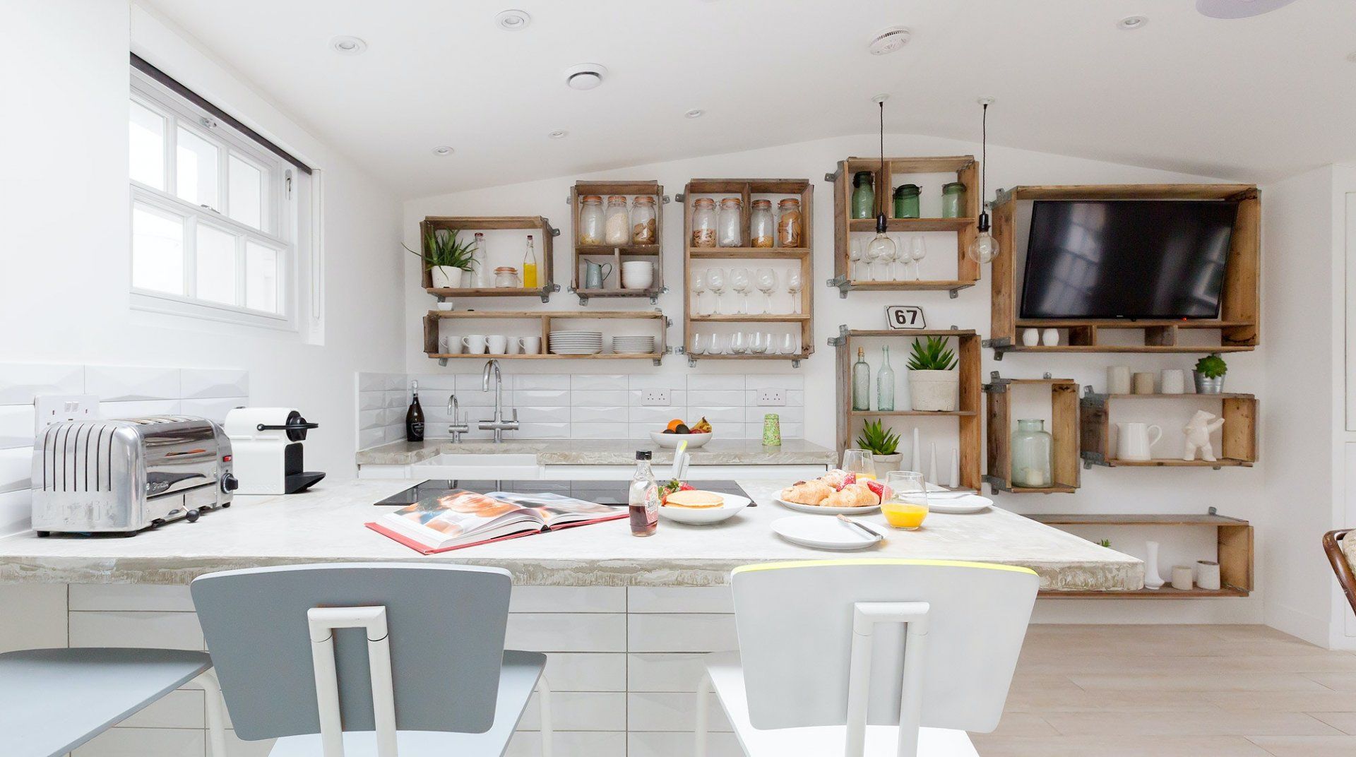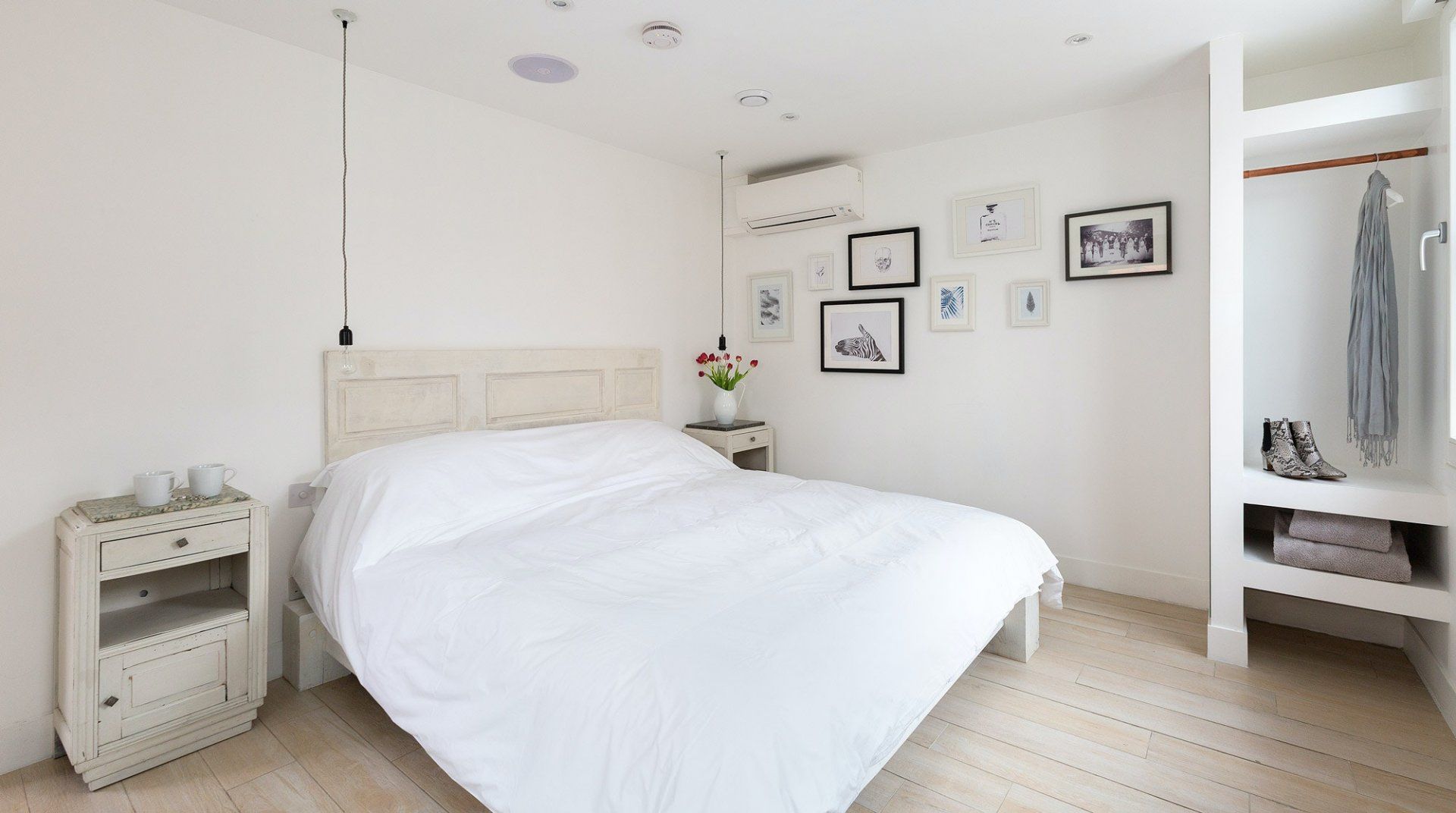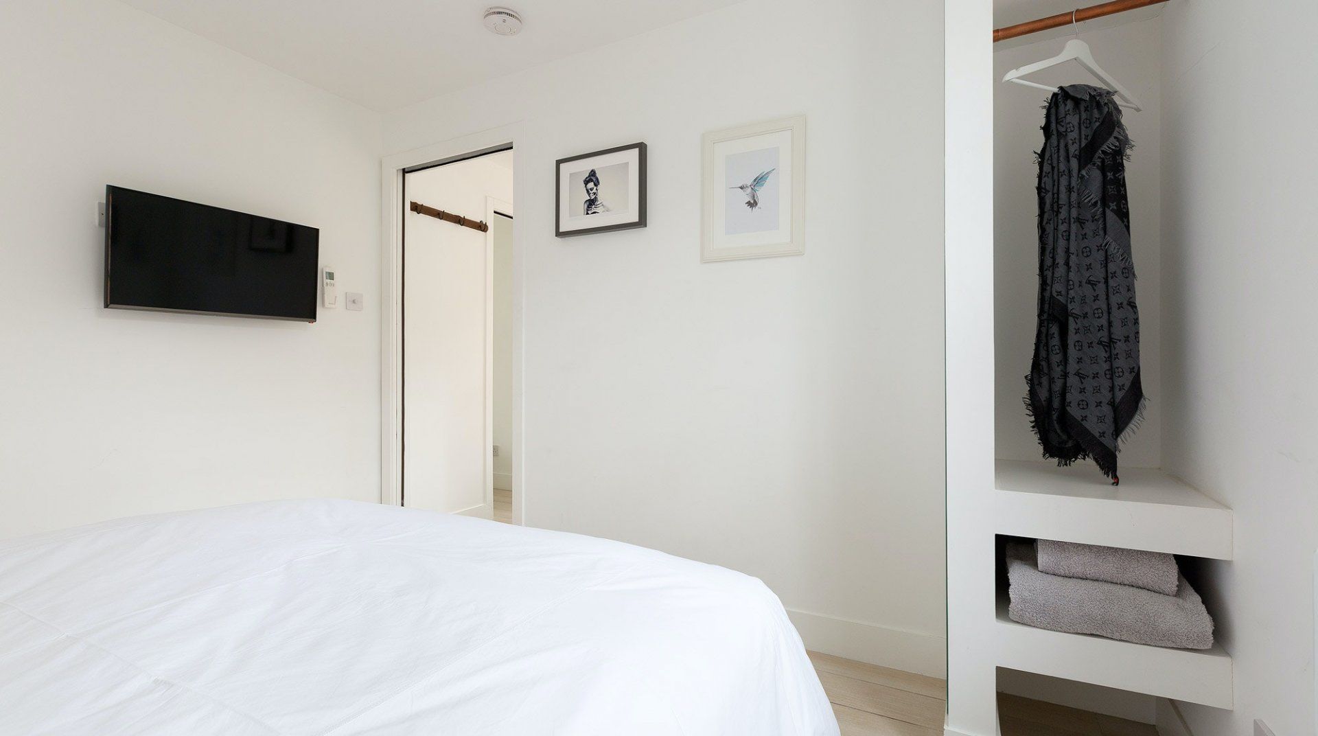 In Gina’s reverse duplex, bedrooms unusually take the lower level while the kitchen and living room are found upstairs beside a leafy mini-balcony. It’s also rare to find two super king-size beds, and even rarer for a spa-style bathroom to offer natural light with its standalone tub and TV. A minimal Scandi vibe runs throughout the beautiful apartment, incorporating suspended lamps, wall nooks, recycled woods and cacti. Right outside is the villagey Exmouth Market street, famed among Londoners for its superb restaurants.