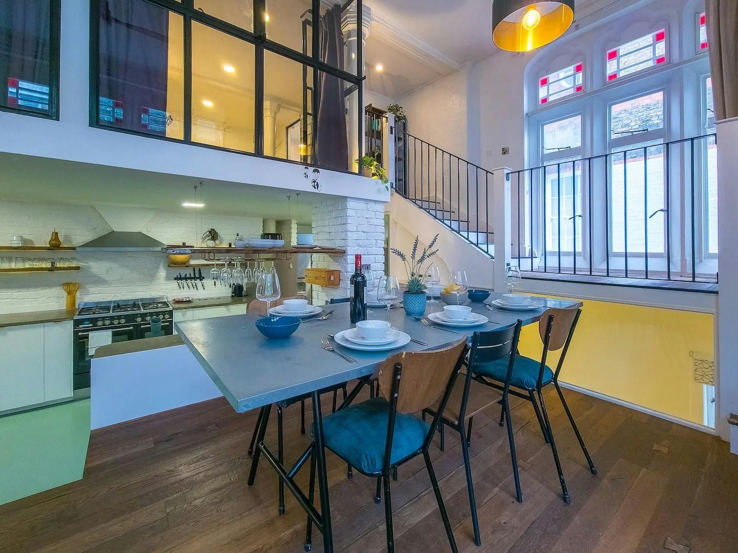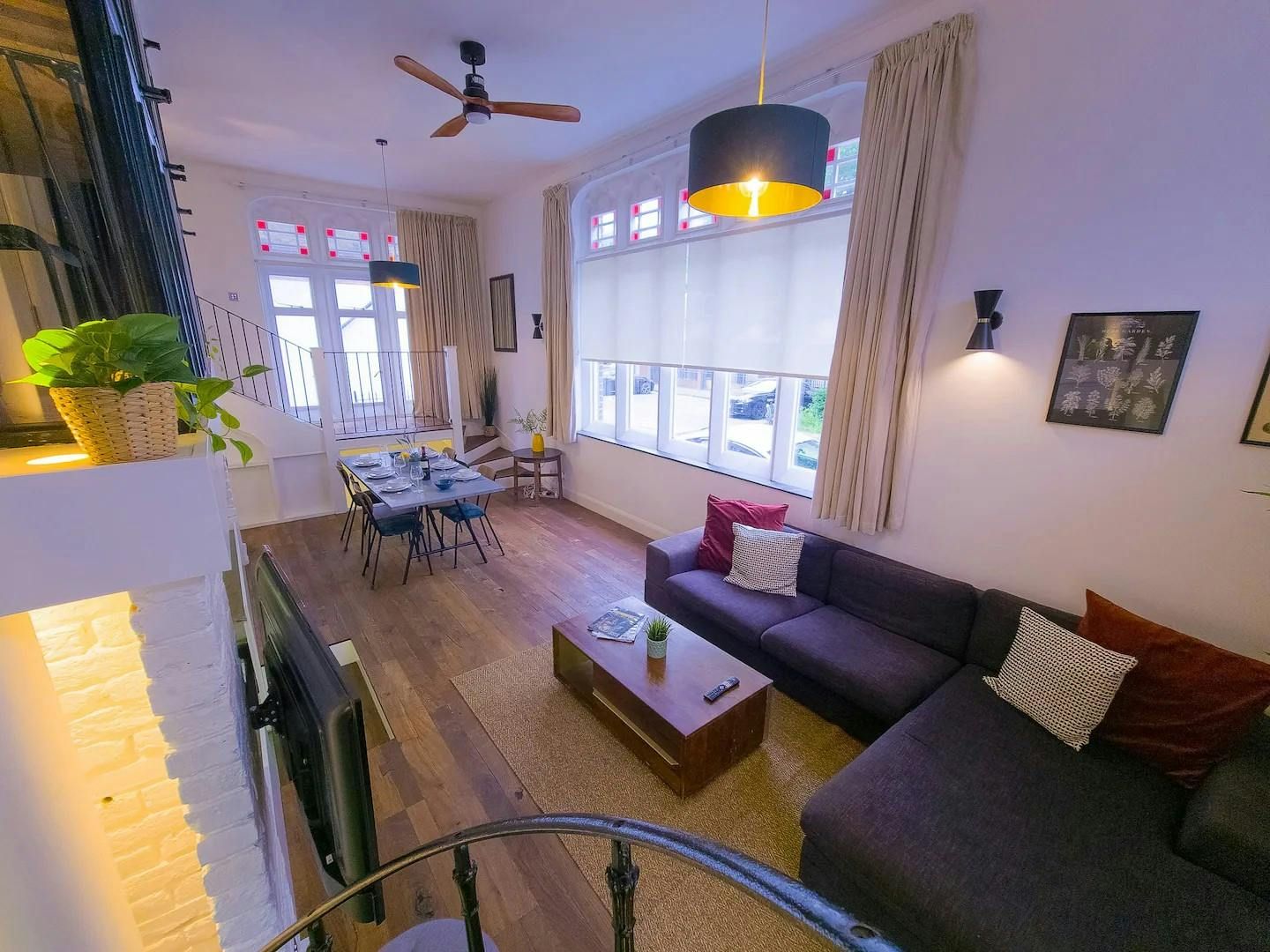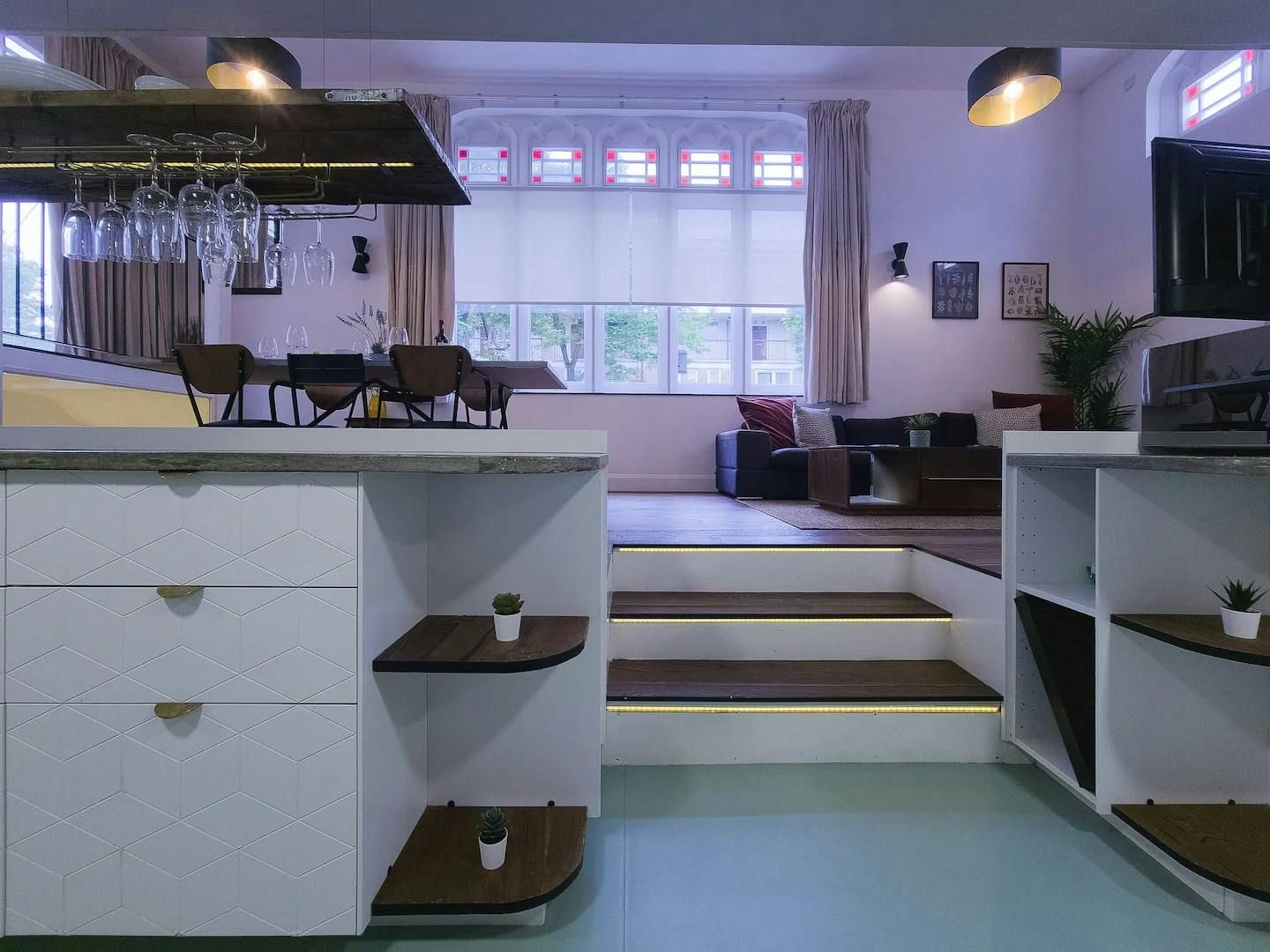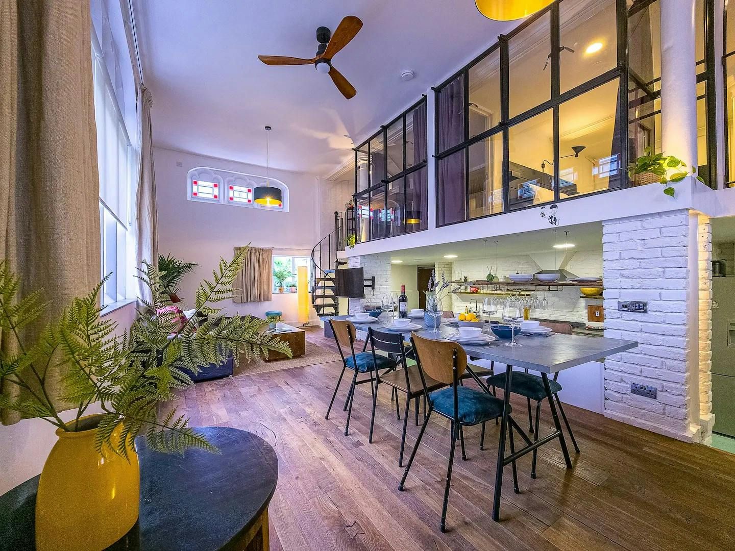 A quirky home-from-home in Poplar, this historic property is a conversion of St Frideswide’s Chancel. It’s been used as a filming location for Call The Midwife and perfectly blends reclaimed period features with contemporary amenities. You can look forward to smart home features including voice-controlled lights, thermostats, and curtains, and ambient lighting that makes this a cosy, relaxing place to return to. There’s lots of room for your group to spend time together on the open-plan ground floor, whether you’re dining or lounging.