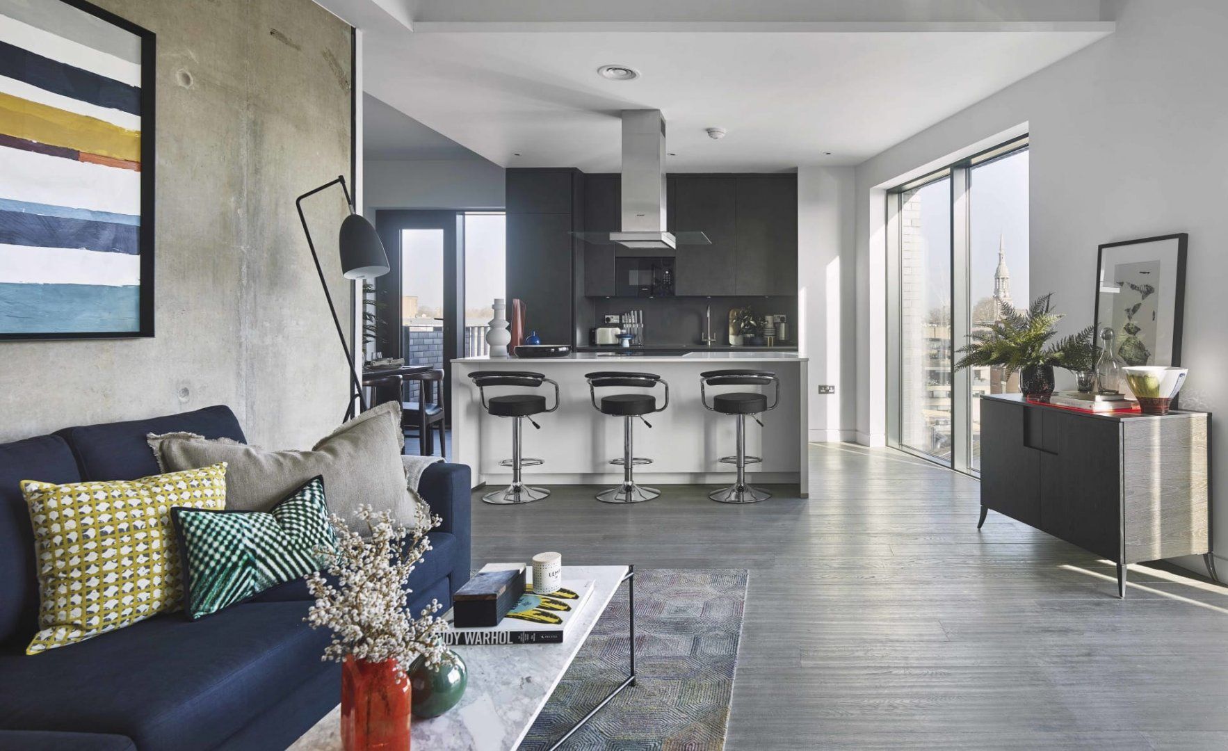 Anyone looking to tap into the creative energy and undeniable cool of East London can't go wrong with this stunning three-bedroom flat, just a stone's throw from the heart of Shoreditch. With its privileged sixth-floor vantage point, gaze through floor-to-ceiling windows across the low-rise landscape of East London's Victorian terraces, or breathe in the atmosphere from one of the private balconies.