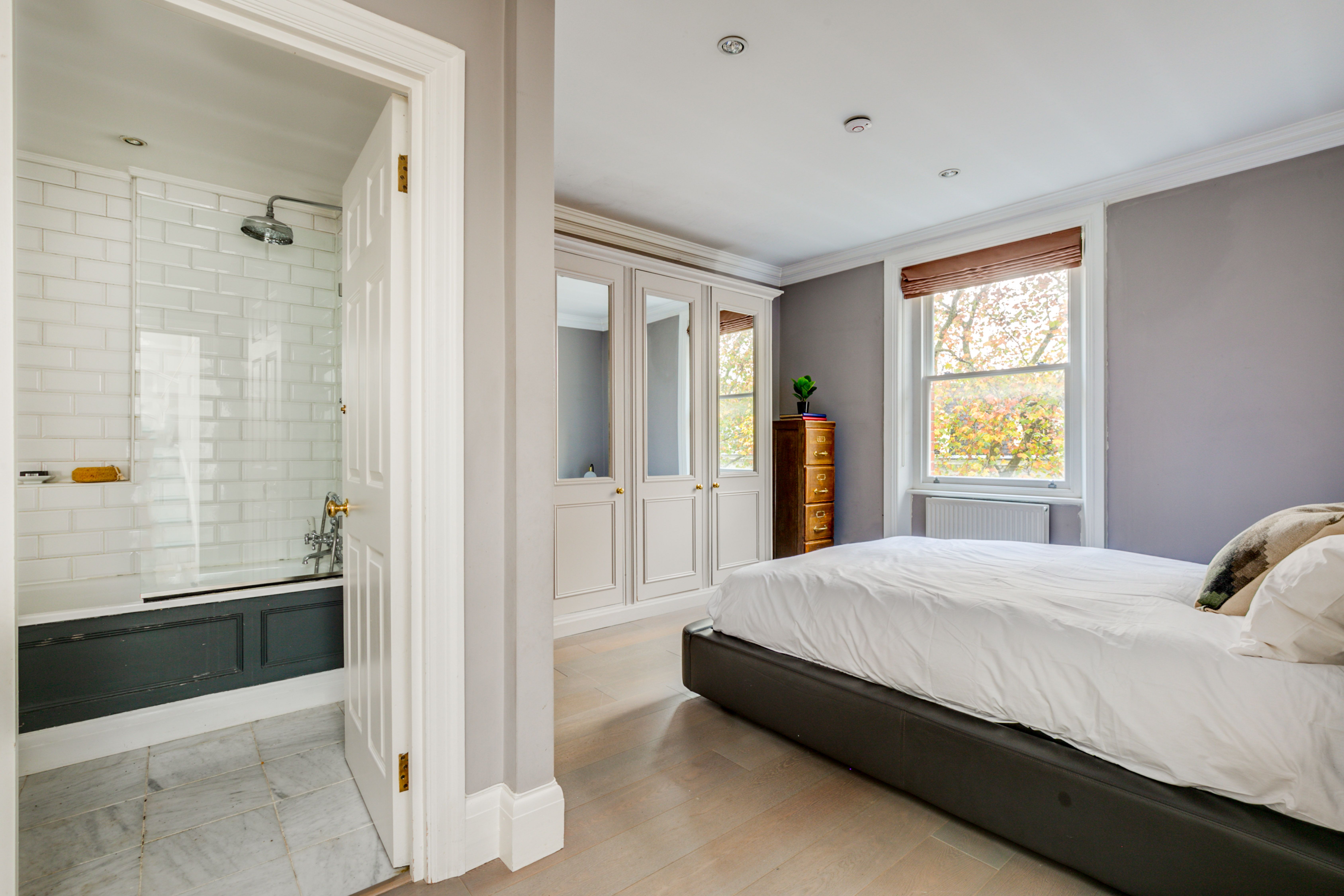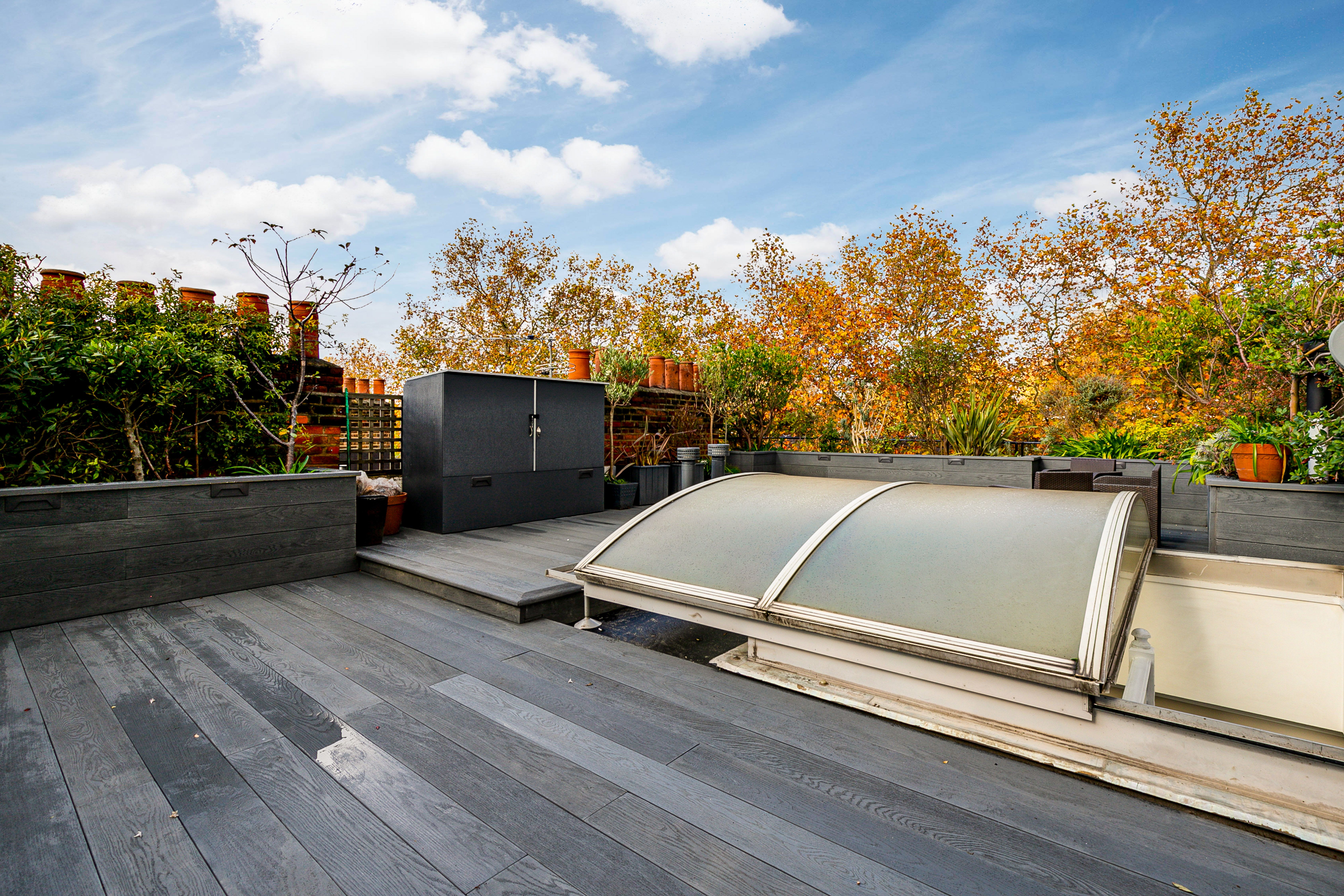 This penthouse apartment is tucked away in one of Kensington's charming red brick buildings. Part of a conservatory area, you’ll be a short walk from shops, restaurants, museums, and a Tube station, making it easy to explore both near and far. The interiors are traditional and understated – there's a cosy living area, a well-appointed kitchen, and two comfortable bedrooms. That said, the star of the show is the enormous roof terrace, where you can perch with a glass of wine and admire the views of the communal garden across the street.