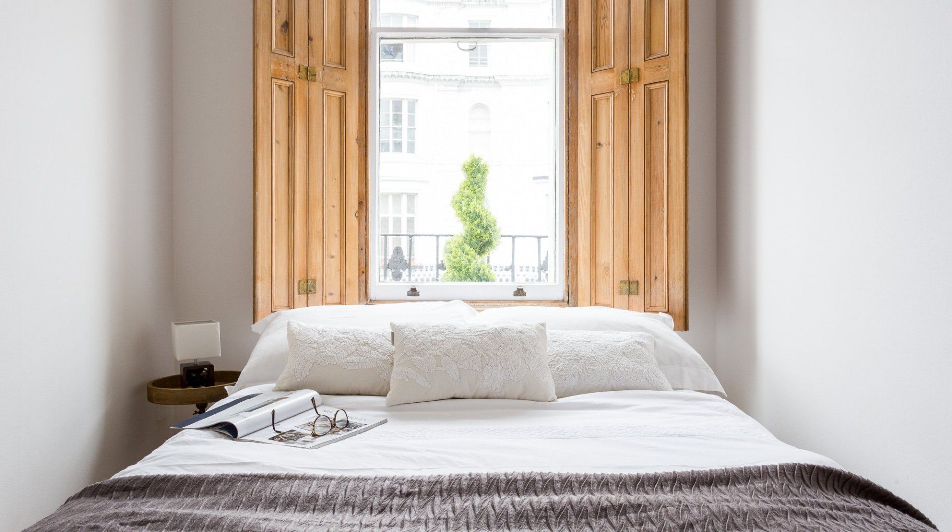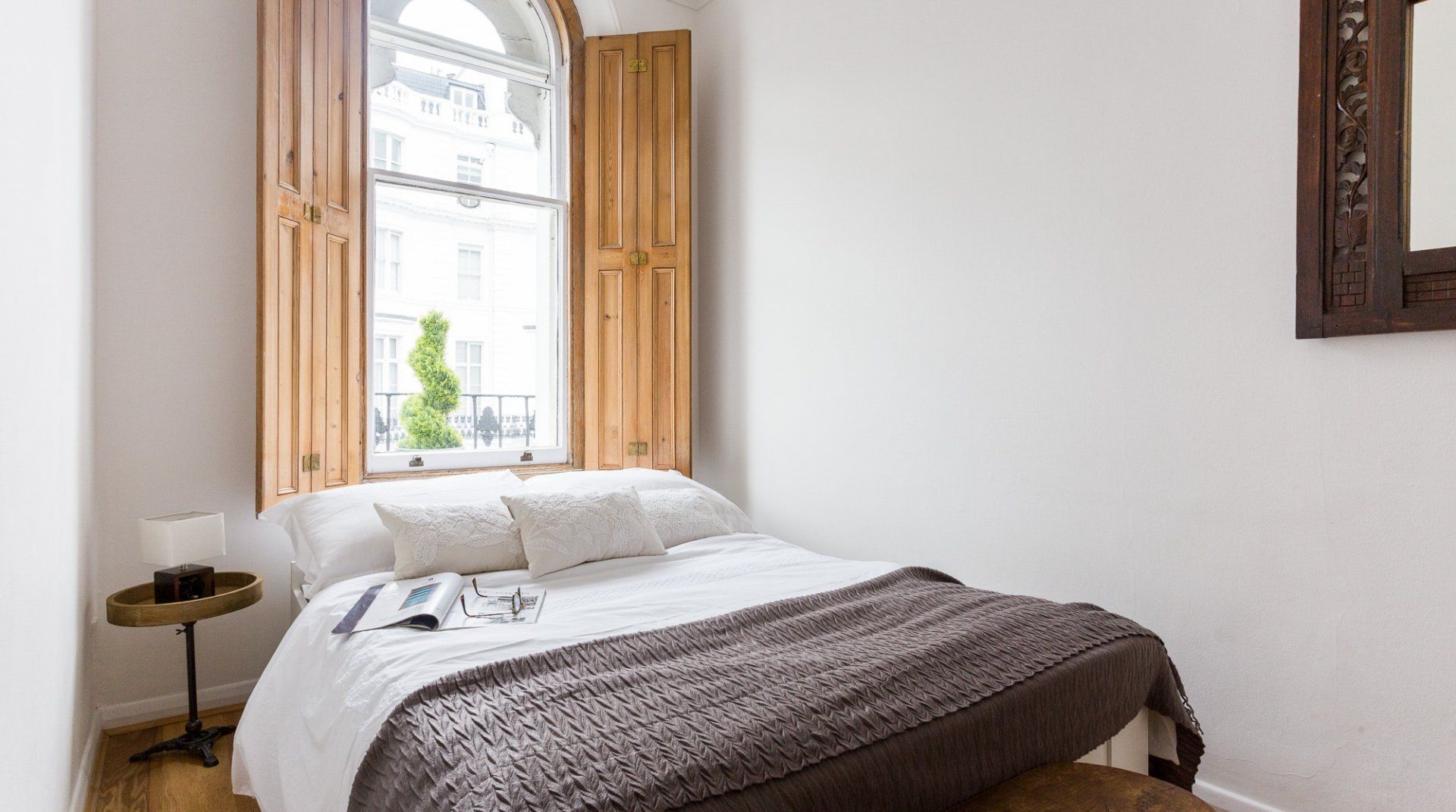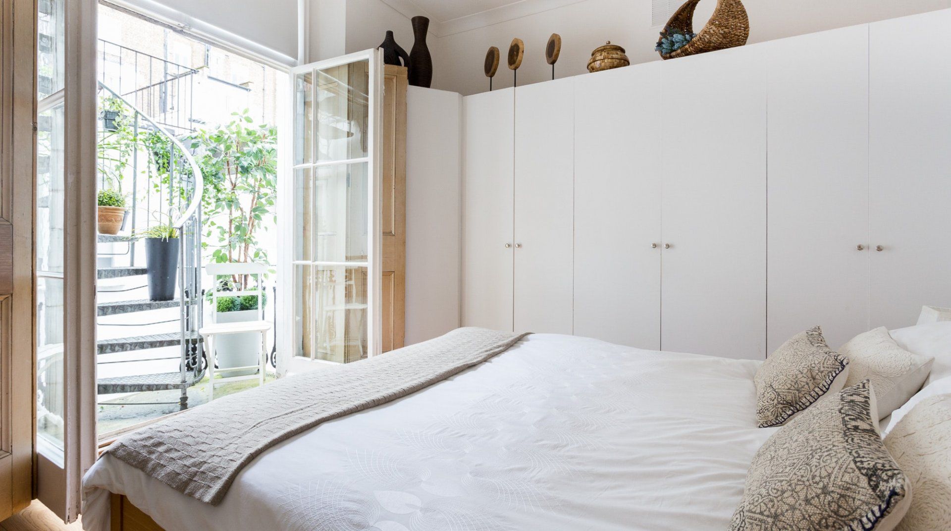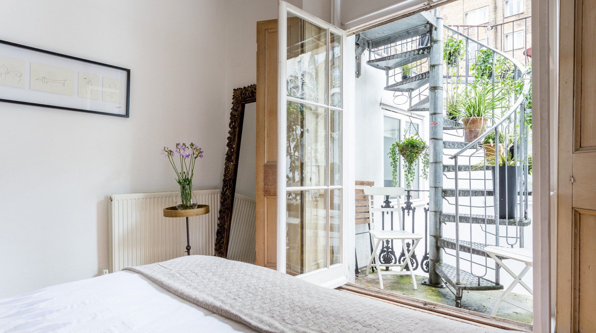 Positioned in an enviable location, a 2-minute stroll from Hyde Park, this lovely white stucco-fronted apartment has easy access to Little Venice canals and Paddington Station. A leisurely walk across the expansive greenery of Hyde Park takes you to the myriad museums of South Kensington – the V&A, Natural History, and Science Museum. There are plenty of chic eateries, bars and cafés on your doorstep, but the natural minimalism and calming interior of this apartment might invite you to spend an evening in. Raw wood accents and houseplants brighten up the pristine white walls. The dining table sits in a sunny bay window, offering the perfect spot for breakfast before a big day out. Just off the master bedroom, French doors open up to a tiny, flower-filled balcony with a couple of bistro chairs to take in the sun and a twisting spiral staircase that leads to a shared roof terrace – a rarity in central London.