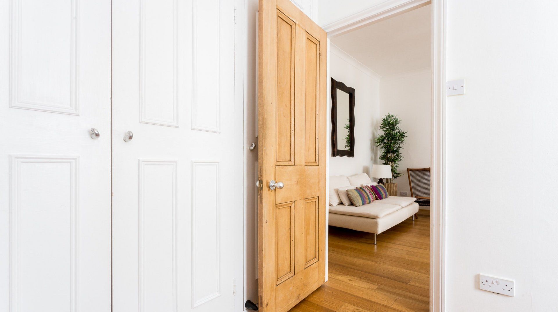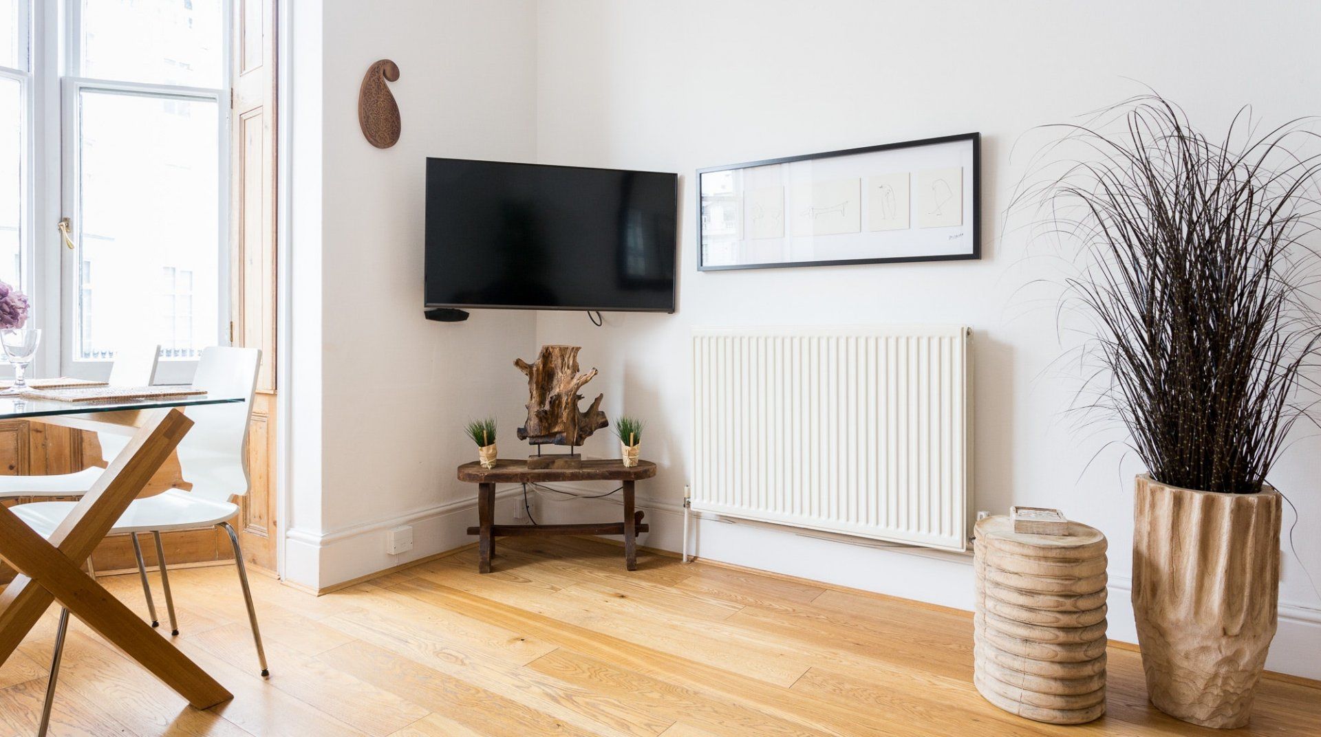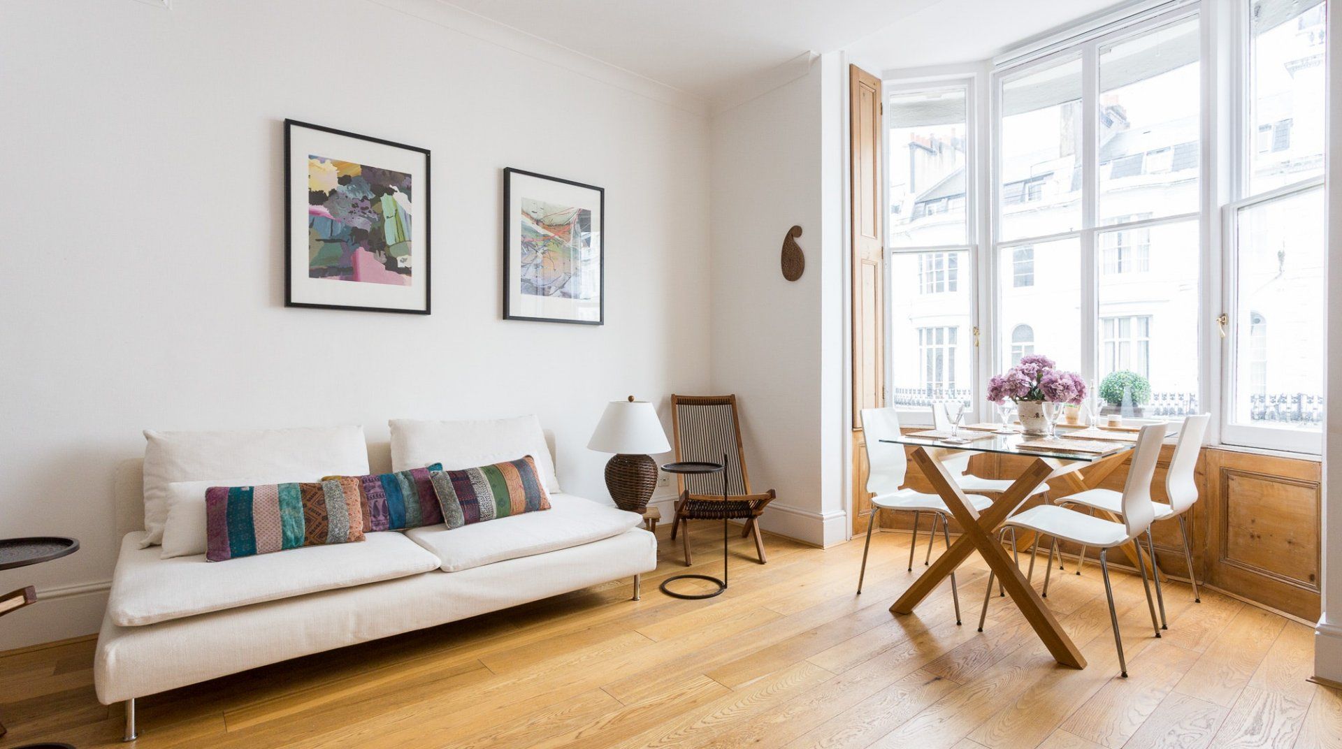 Positioned in an enviable location, a 2-minute stroll from Hyde Park, this lovely white stucco-fronted apartment has easy access to Little Venice canals and Paddington Station. A leisurely walk across the expansive greenery of Hyde Park takes you to the myriad museums of South Kensington – the V&A, Natural History, and Science Museum. There are plenty of chic eateries, bars and cafés on your doorstep, but the natural minimalism and calming interior of this apartment might invite you to spend an evening in. Raw wood accents and houseplants brighten up the pristine white walls. The dining table sits in a sunny bay window, offering the perfect spot for breakfast before a big day out. Just off the master bedroom, French doors open up to a tiny, flower-filled balcony with a couple of bistro chairs to take in the sun and a twisting spiral staircase that leads to a shared roof terrace – a rarity in central London.