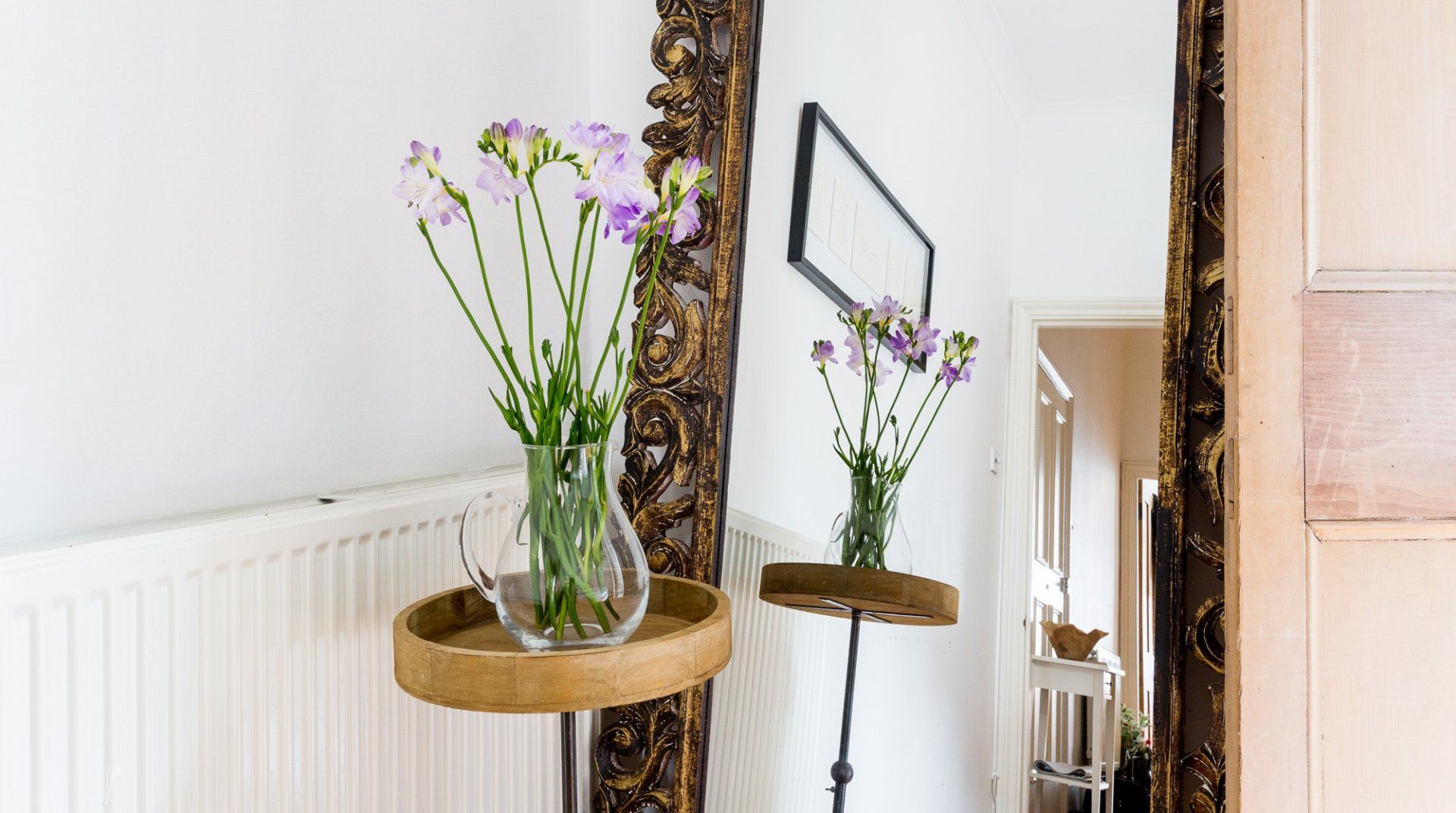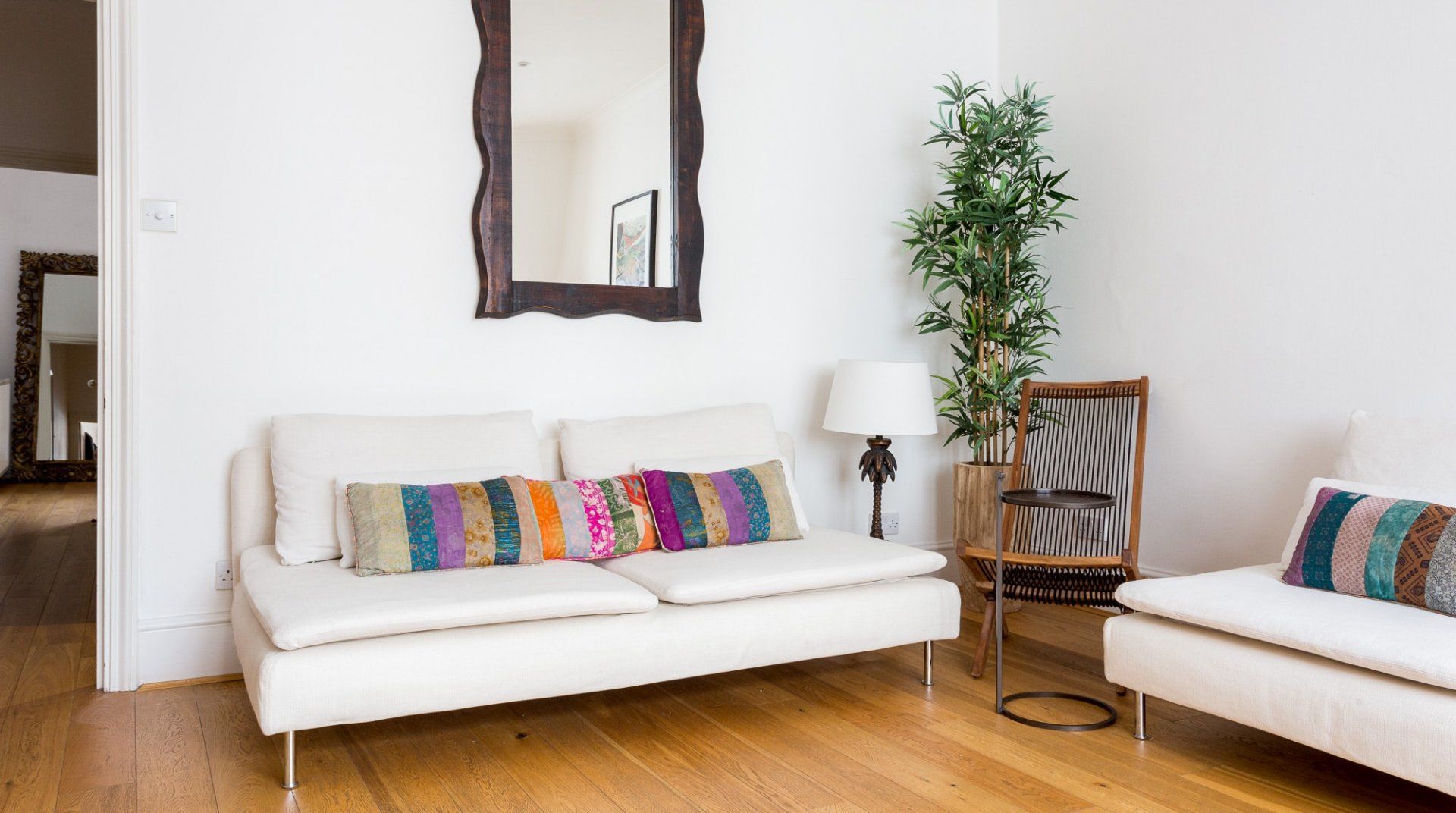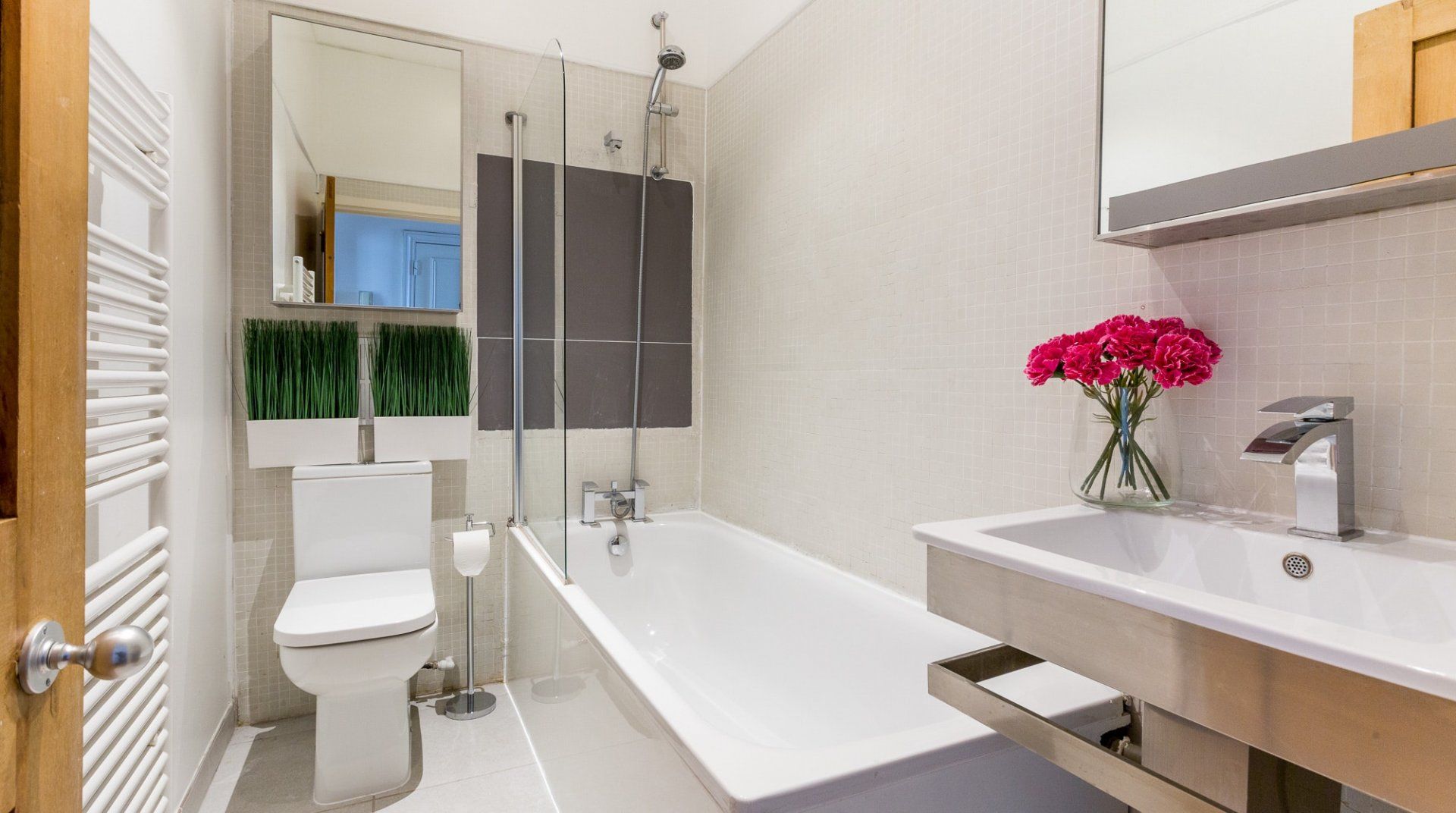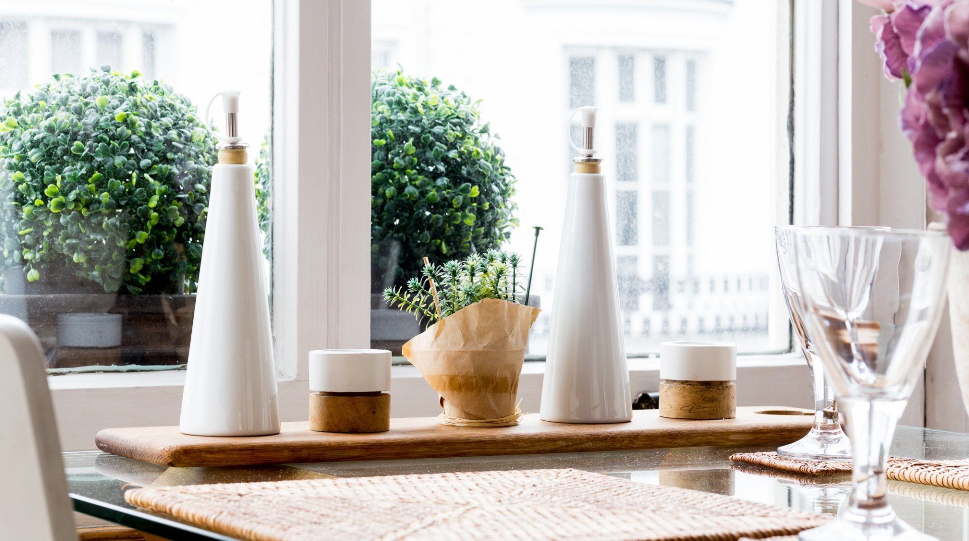Positioned in an enviable location, a 2-minute stroll from Hyde Park, this lovely white stucco-fronted apartment has easy access to Little Venice canals and Paddington Station. A leisurely walk across the expansive greenery of Hyde Park takes you to the myriad museums of South Kensington – the V&A, Natural History, and Science Museum. There are plenty of chic eateries, bars and cafés on your doorstep, but the natural minimalism and calming interior of this apartment might invite you to spend an evening in. Raw wood accents and houseplants brighten up the pristine white walls. The dining table sits in a sunny bay window, offering the perfect spot for breakfast before a big day out. Just off the master bedroom, French doors open up to a tiny, flower-filled balcony with a couple of bistro chairs to take in the sun and a twisting spiral staircase that leads to a shared roof terrace – a rarity in central London.