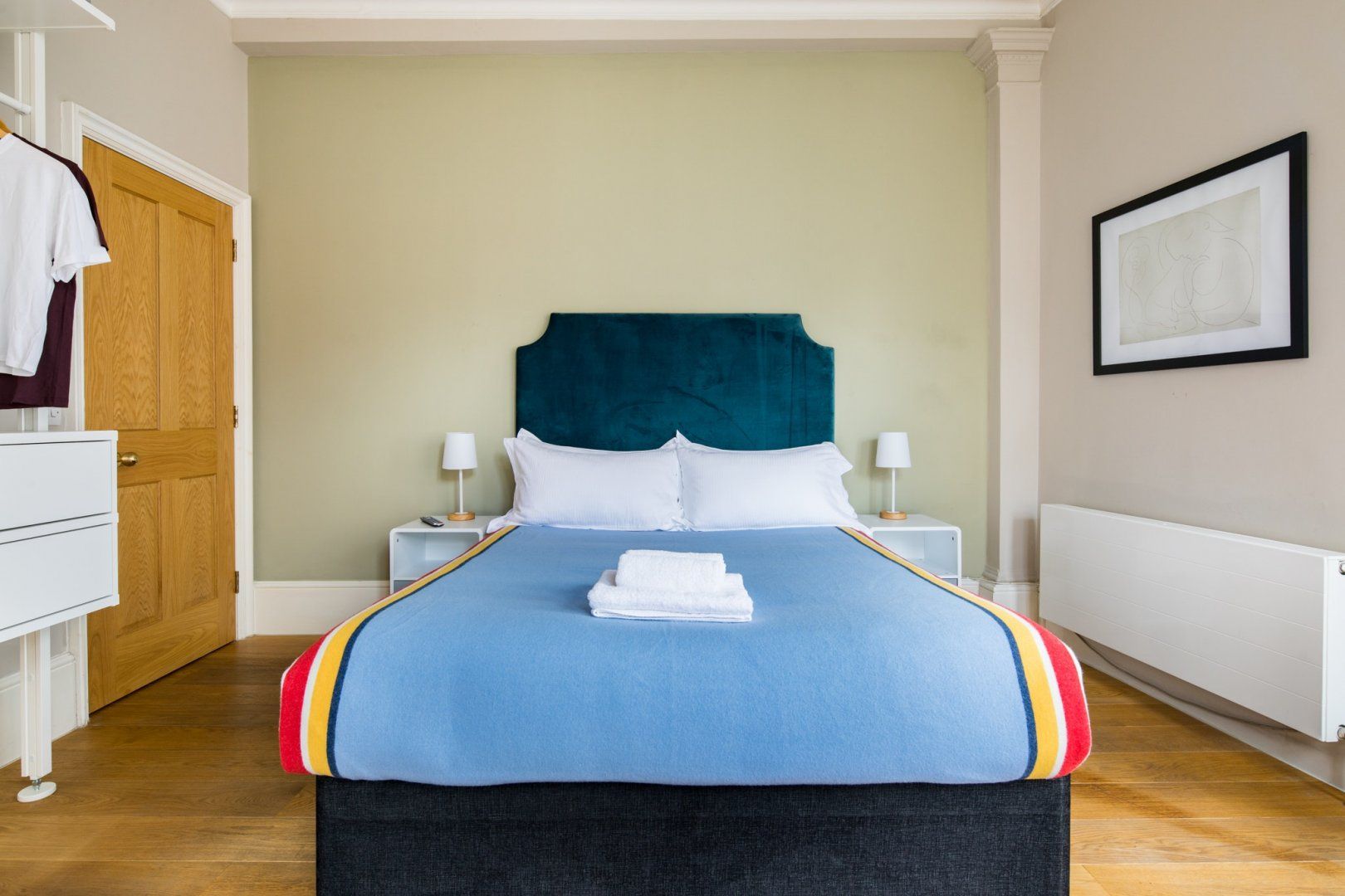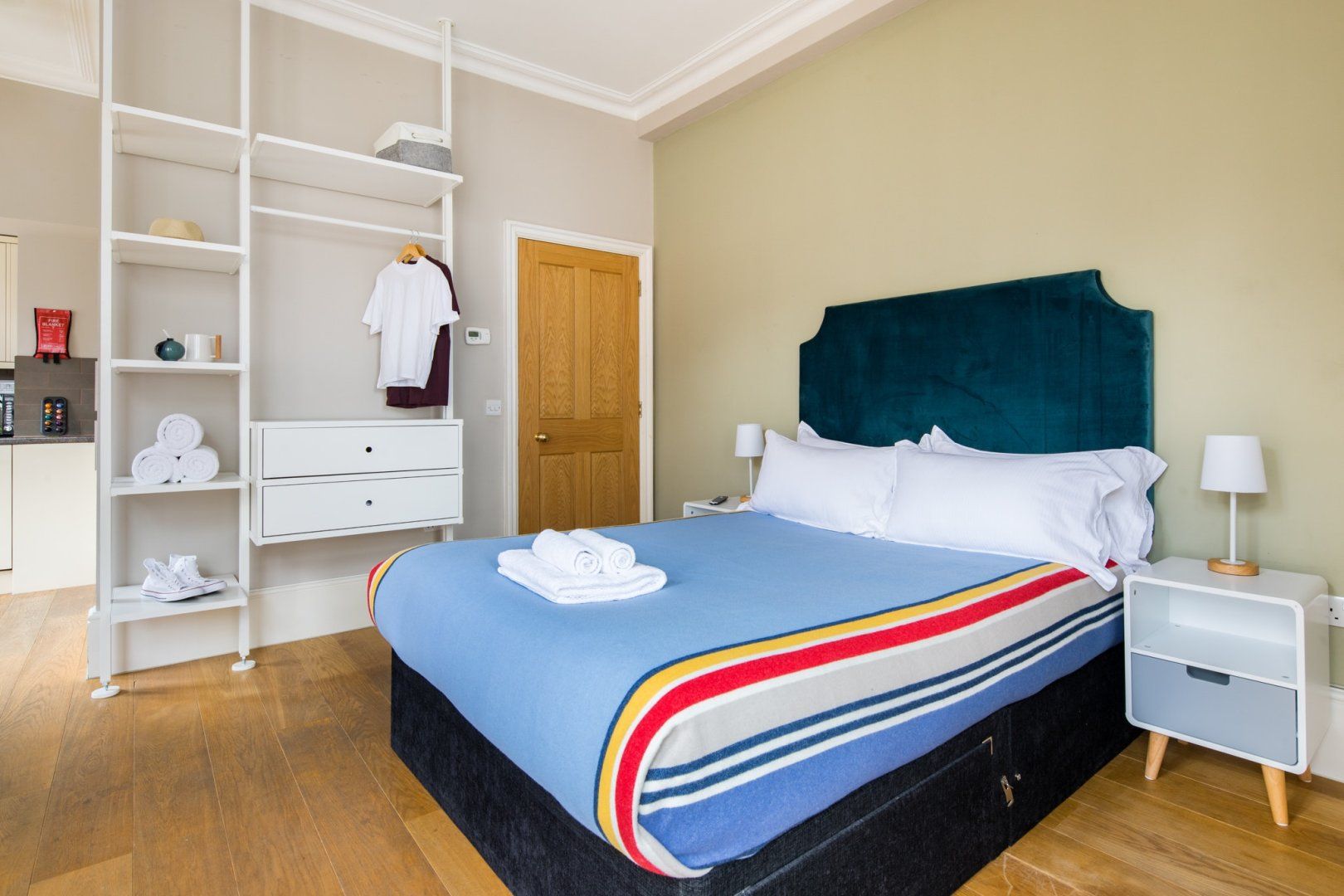 Bathed in light thanks to its large bay window casting its sunny glow across the whole space, the open-plan main room blends elegant minimalism with Scandi cool to create a striking first impression. We love the bold pops of colour in the bedding and leafy houseplant, while the tall ceilings and wood floors add a note of classic, historic charm to the proceedings.