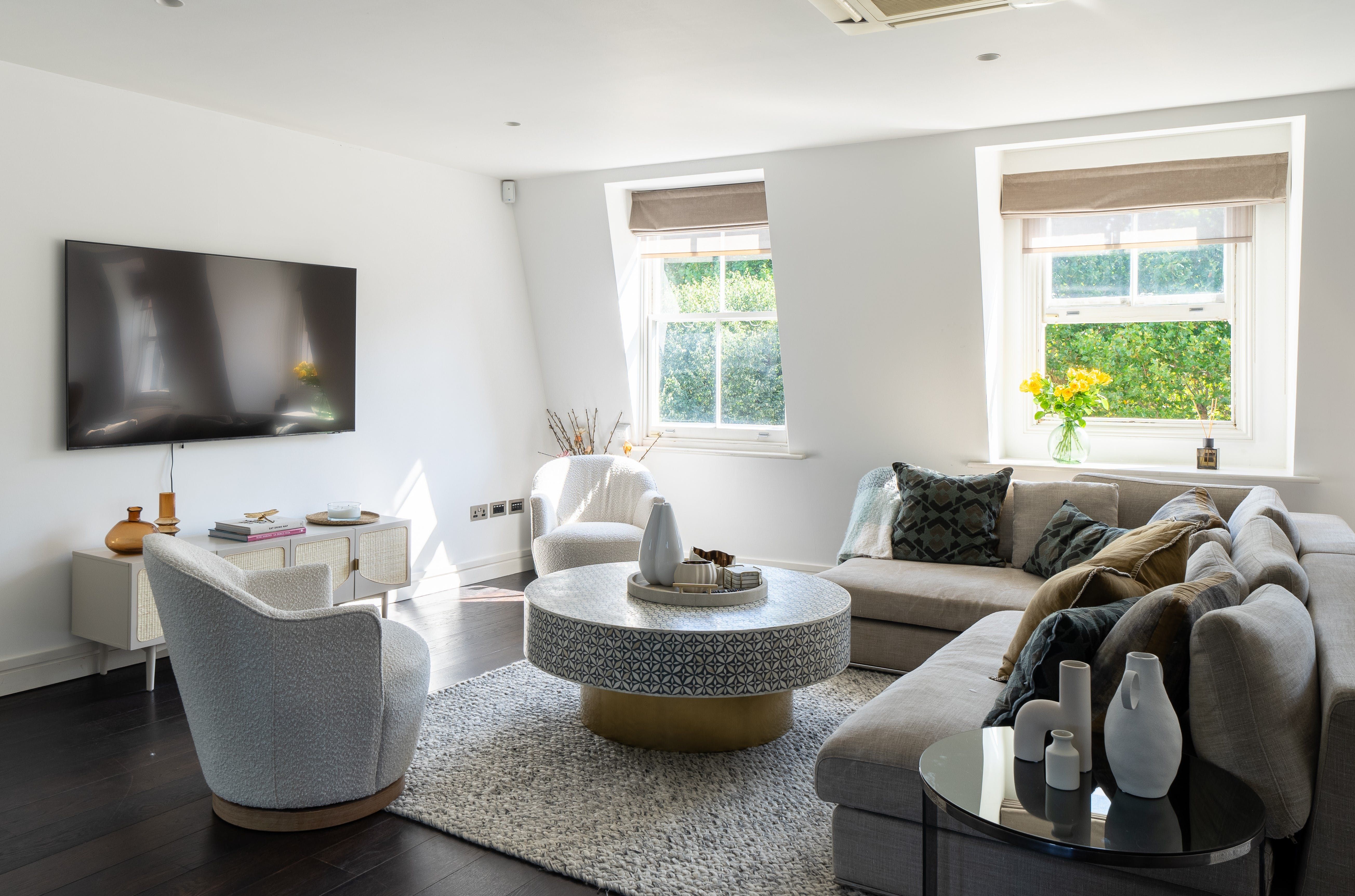 You’ll love waking up in your super king-size bed and indulging in a rain shower or long, hot soak in the tub before taking your morning coffee on the chaise longue in the living room. Prepare family favourites on the white countertops in the kitchen and dine altogether on the linen tablecloth topped table before cosying up on the lounge-worthy L-shaped sofa.
