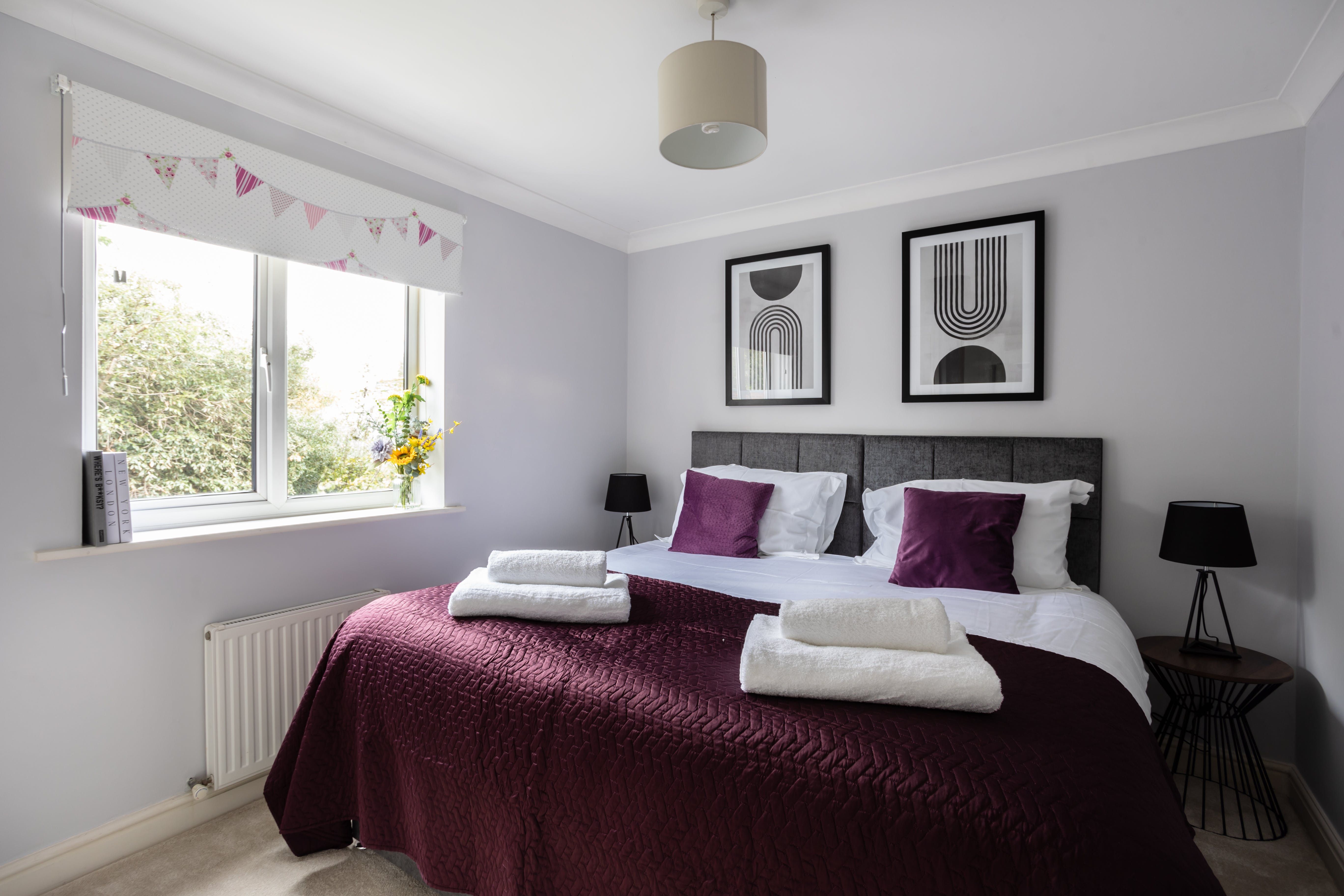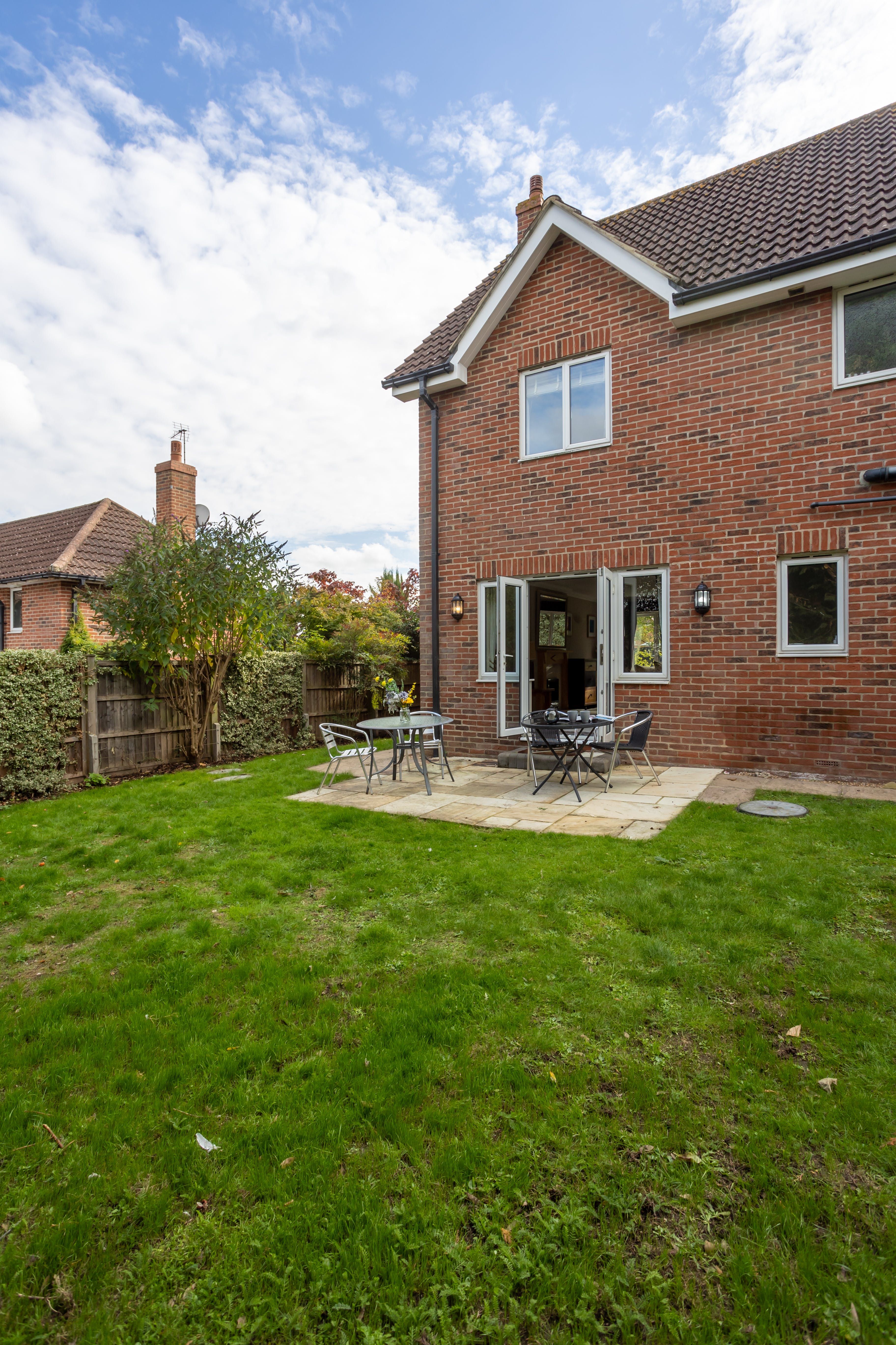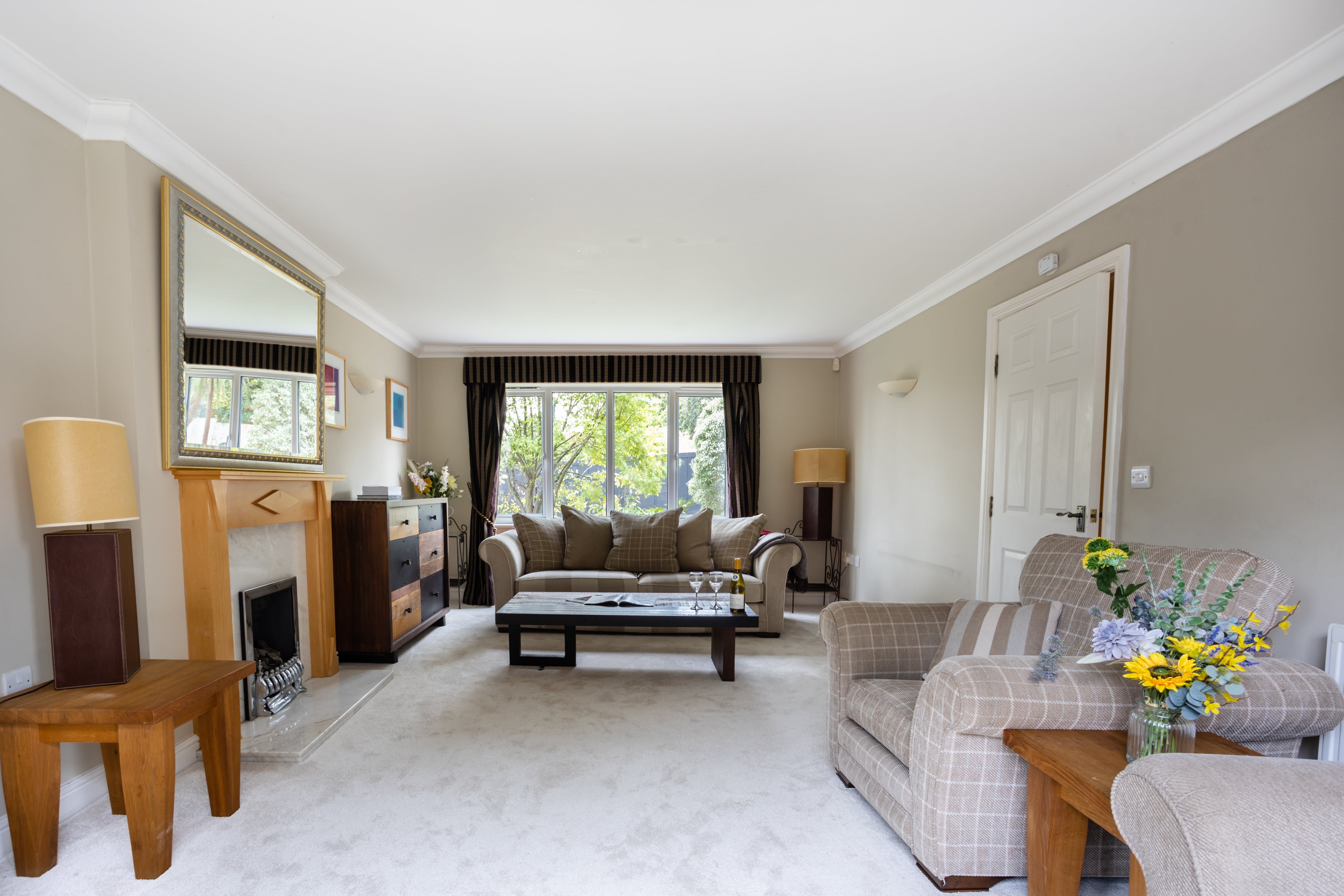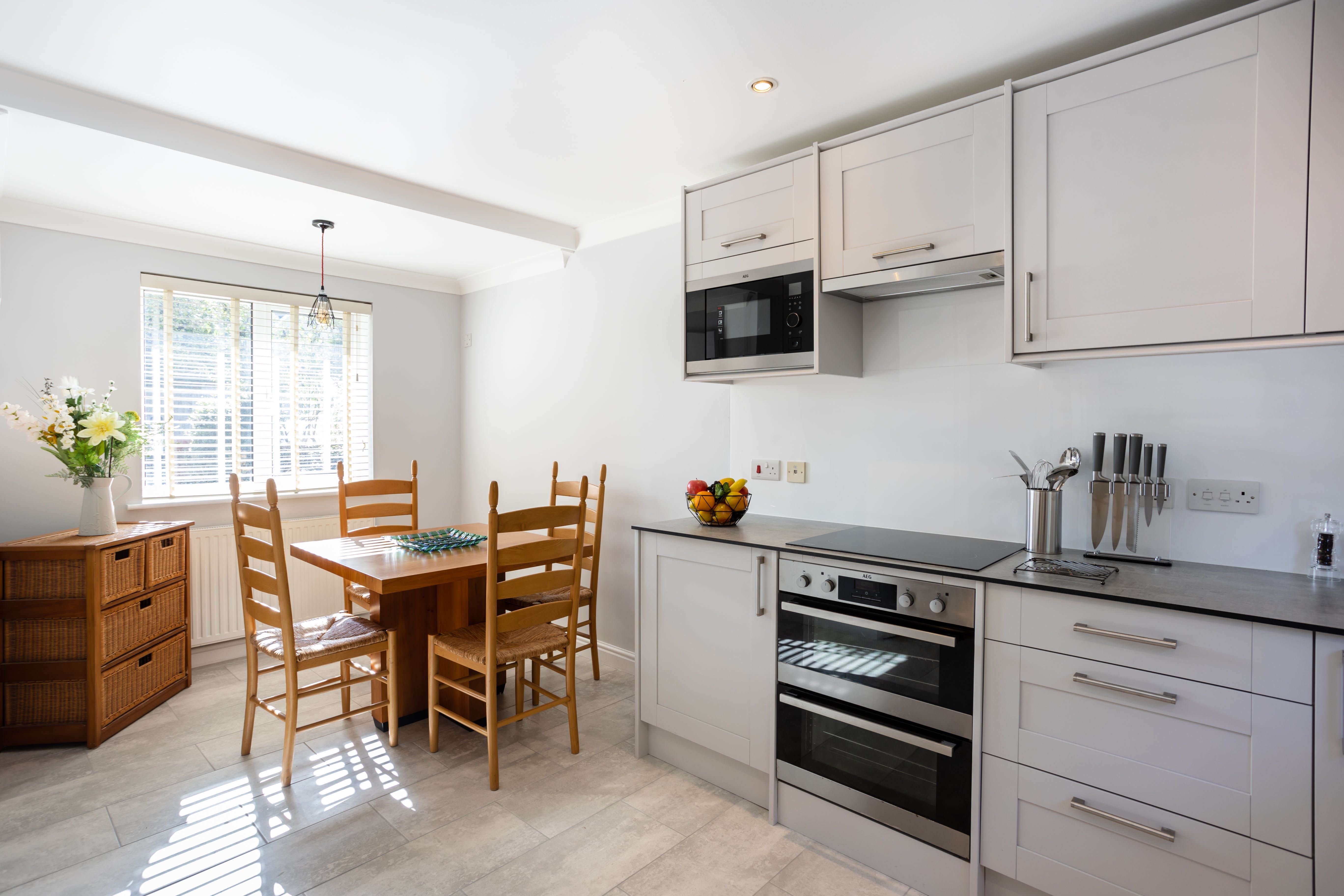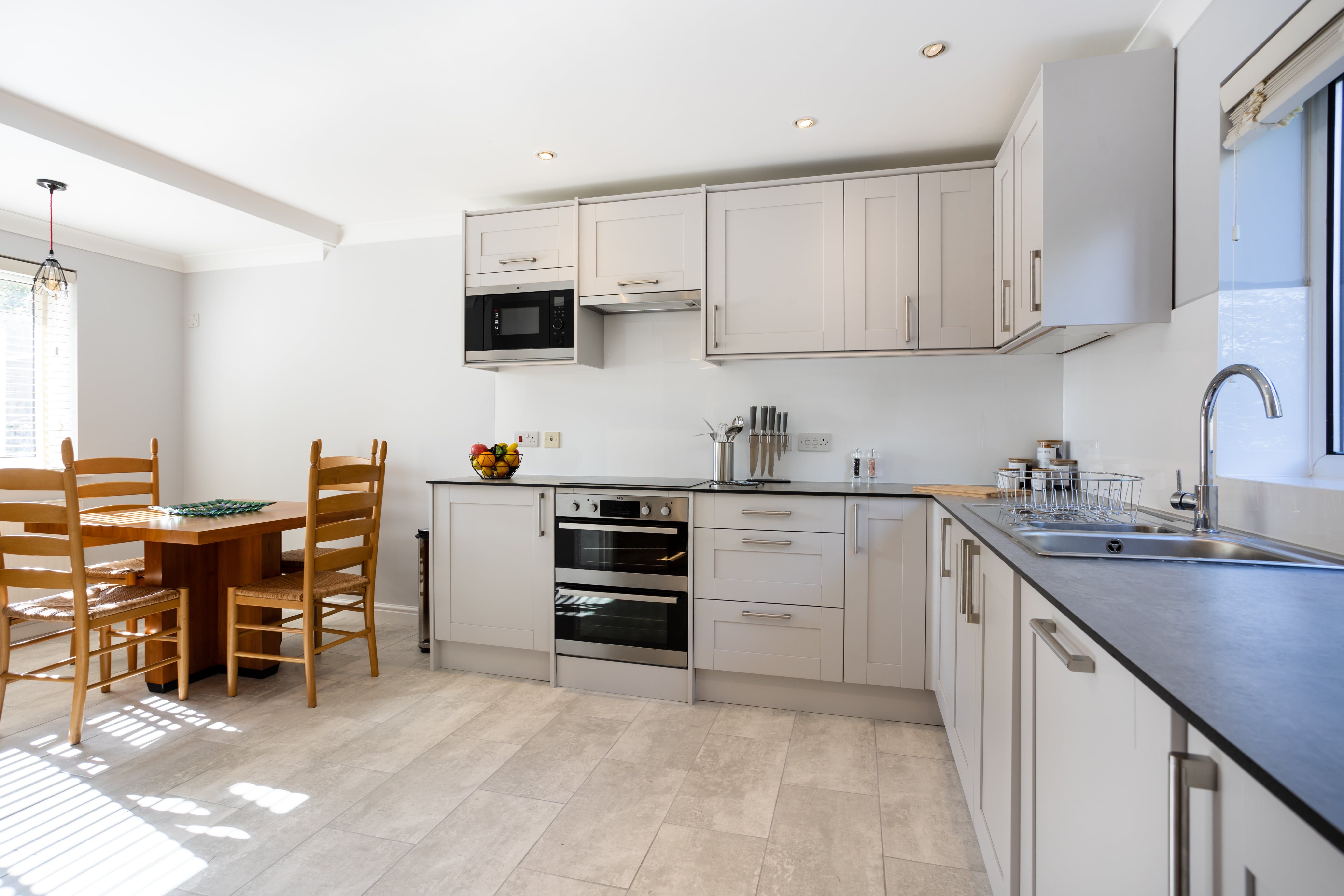Stepping inside, you'll be greeted with the warmth of a reassuringly rustic countryside home, with plump tartan sofas, carpeted floors, and an original fireplace. With the patio doors flung open, the living space is wonderfully bright and open, so you can gather together to discuss daily plans or play light-hearted games over a glass of wine. From the sumptuous bedrooms, fully-equipped kitchen and dining area, as well as a dedicated home office space, you'll have everything you need for an endlessly relaxing stay.