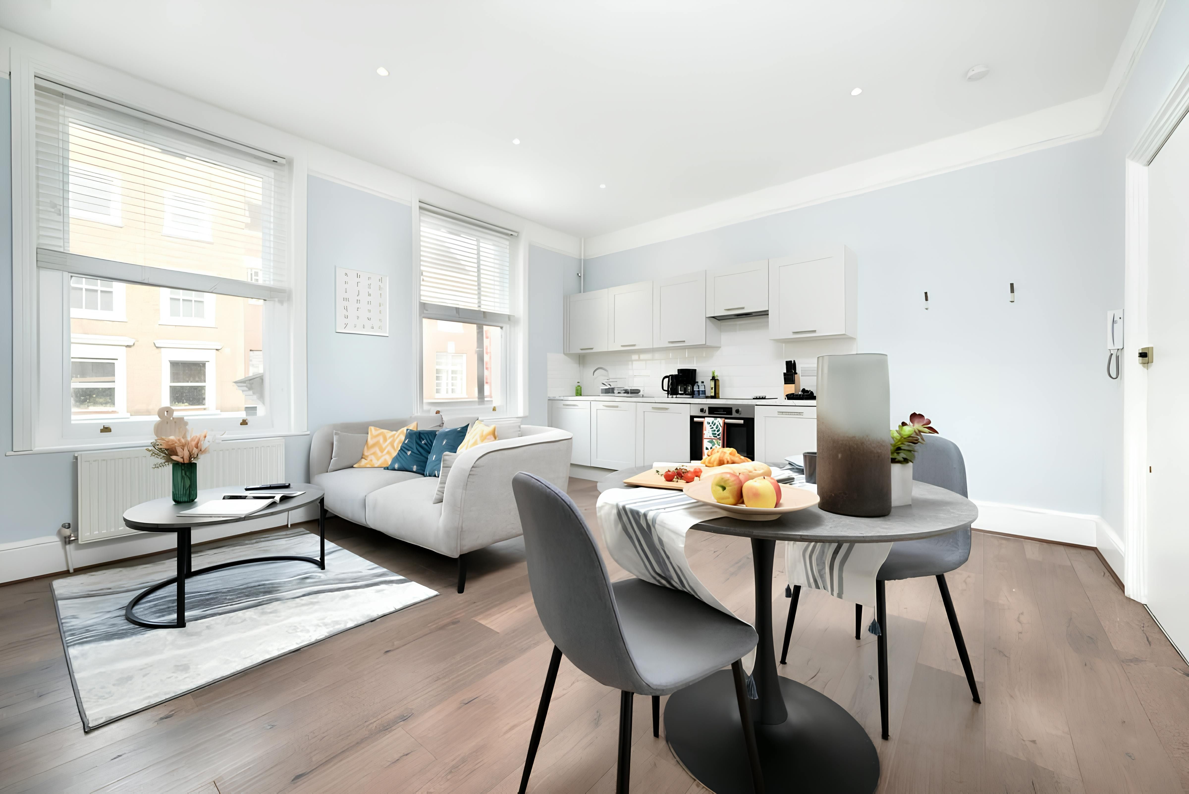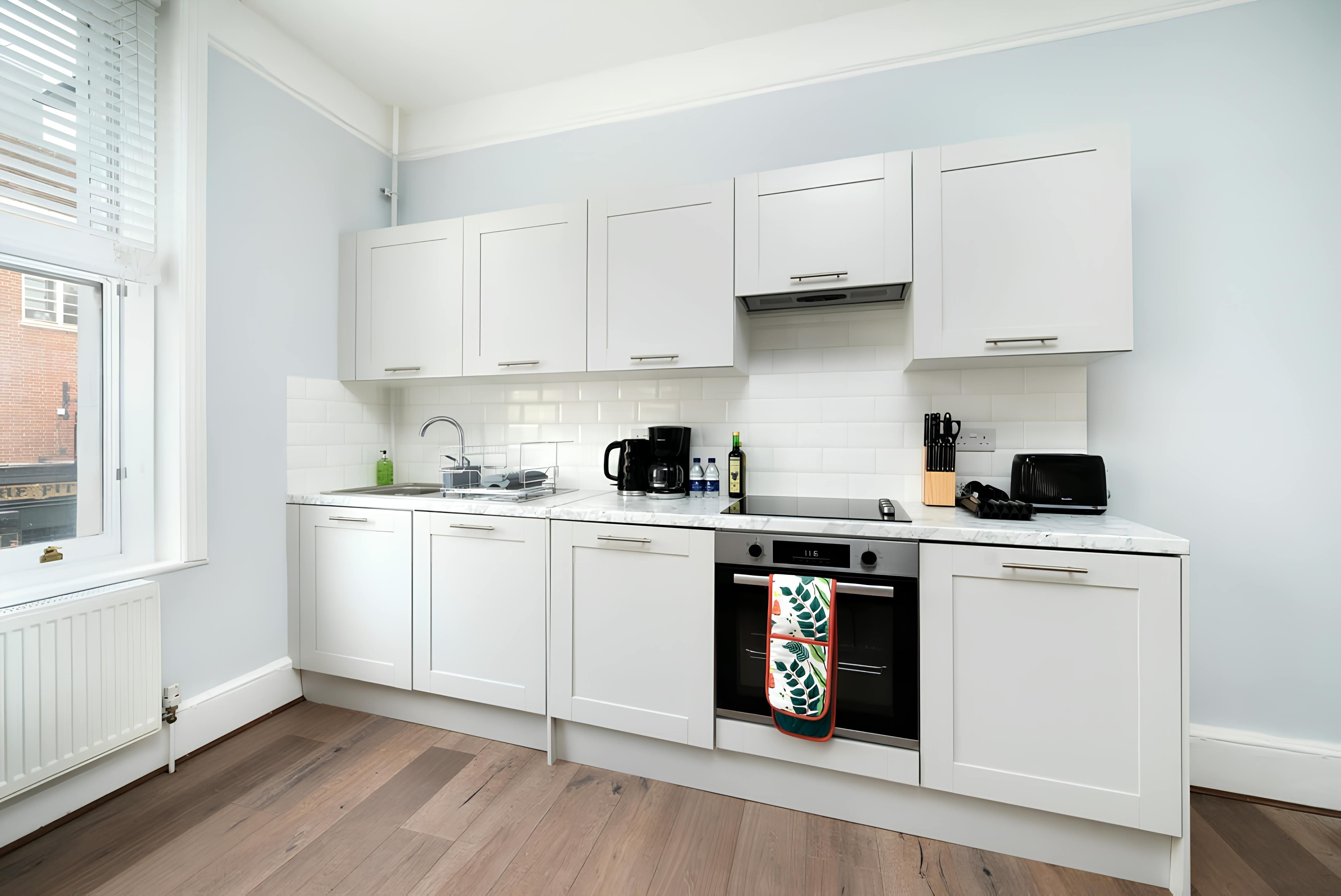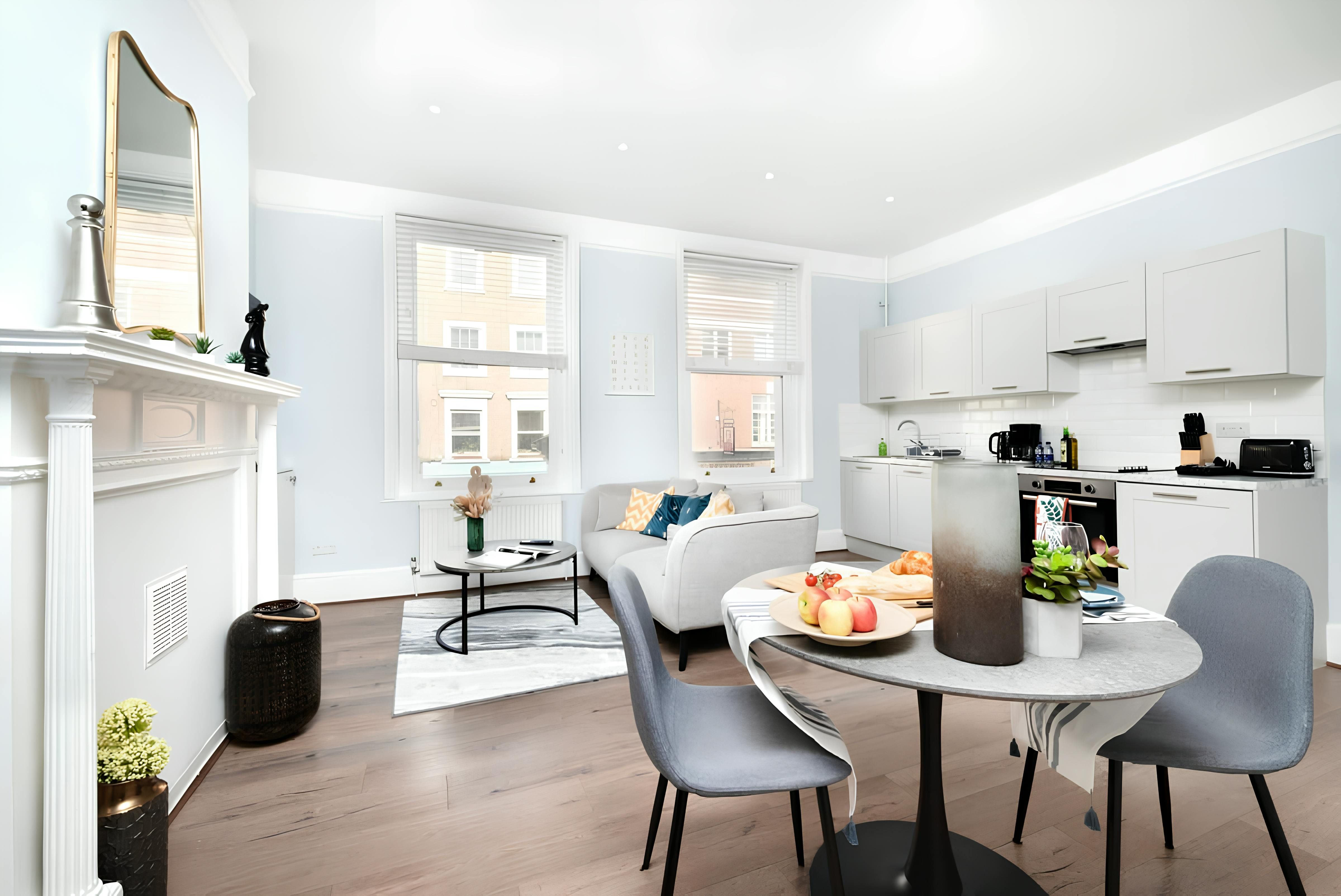 Tucked away in the heart of Fitzrovia, this cosy apartment offers a tranquil escape for solo travellers and couples. The elegant sitting area, with a comfy sofa and a TV, leads to the open-plan kitchen. It’s contemporary and sleek, convenient for whipping up snacks and breakfasts. You’ll just be a short stroll from the restaurants of Charlotte Street, if you fancy dining out. The British Museum is only a few minutes away, too – this is an excellent choice of base for a central London stay.