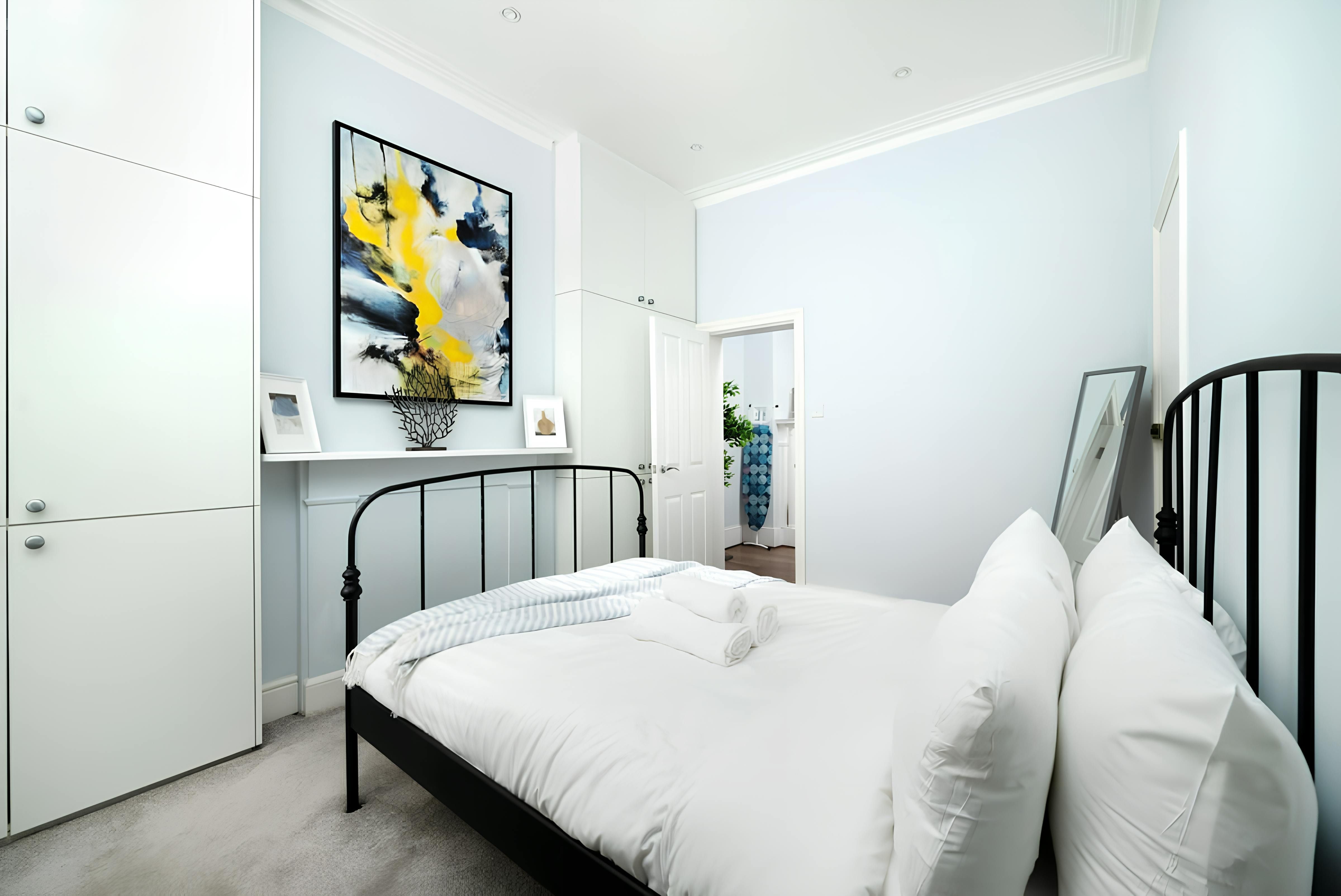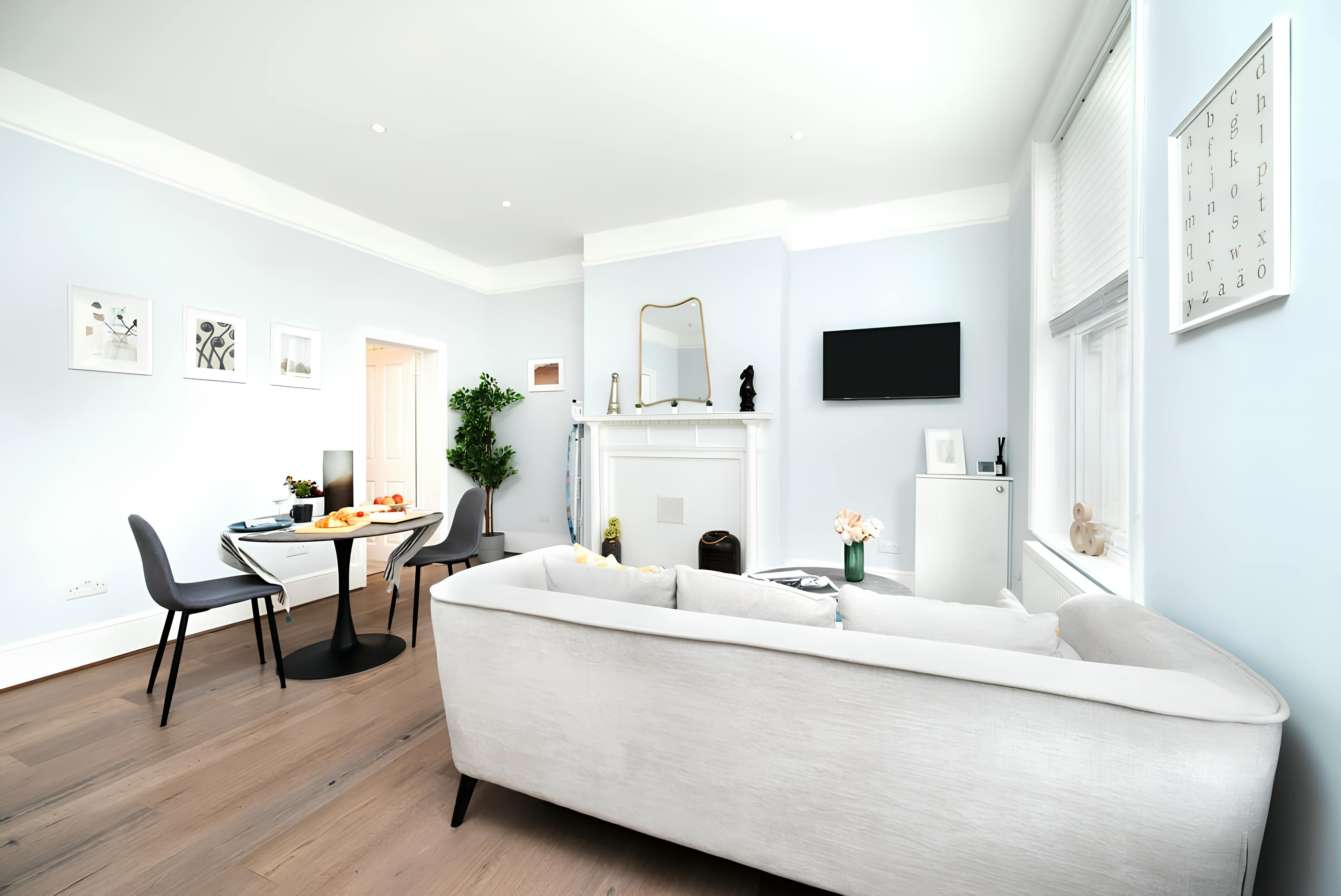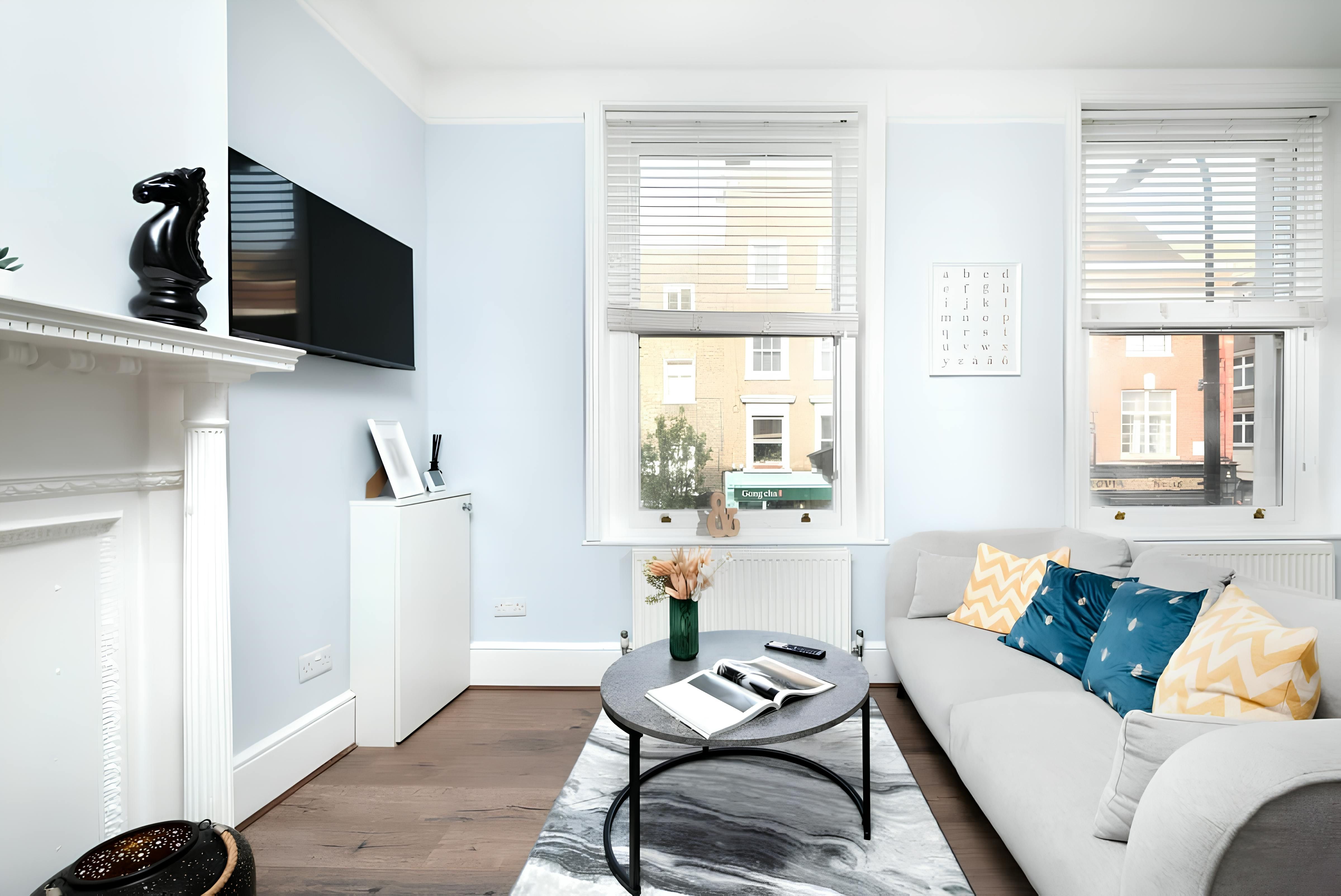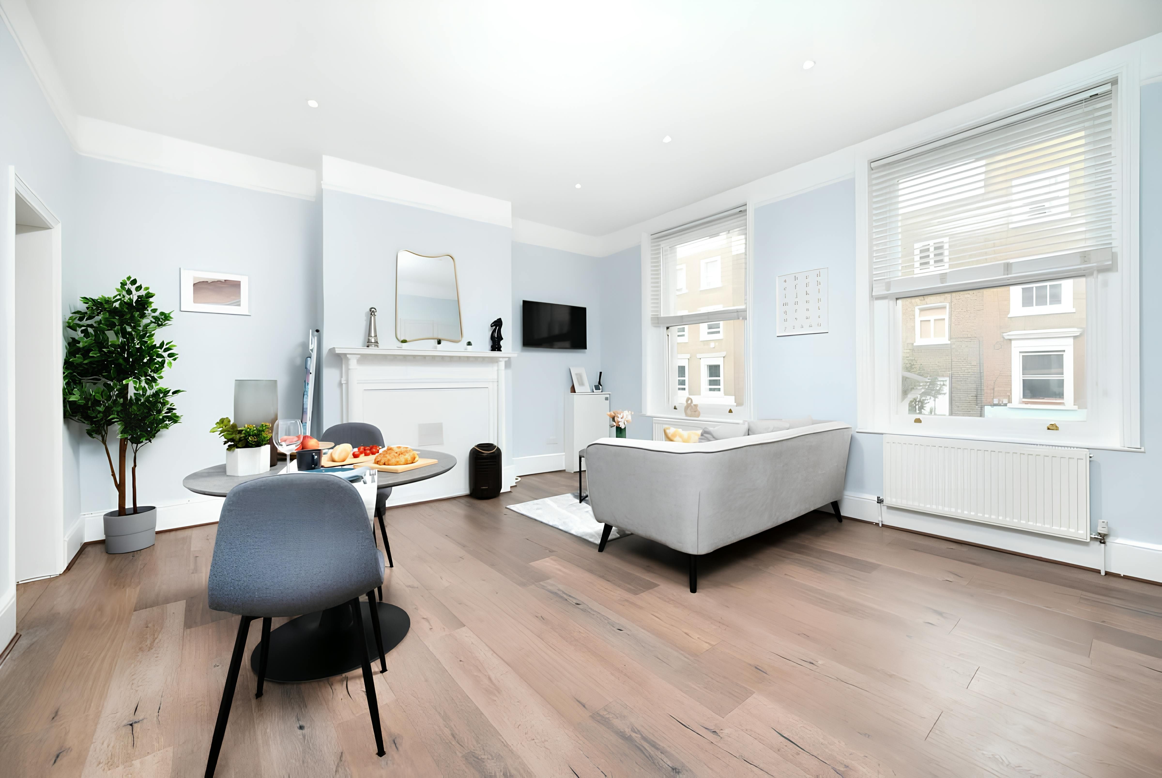 Tucked away in the heart of Fitzrovia, this cosy apartment offers a tranquil escape for solo travellers and couples. The elegant sitting area, with a comfy sofa and a TV, leads to the open-plan kitchen. It’s contemporary and sleek, convenient for whipping up snacks and breakfasts. You’ll just be a short stroll from the restaurants of Charlotte Street, if you fancy dining out. The British Museum is only a few minutes away, too – this is an excellent choice of base for a central London stay.