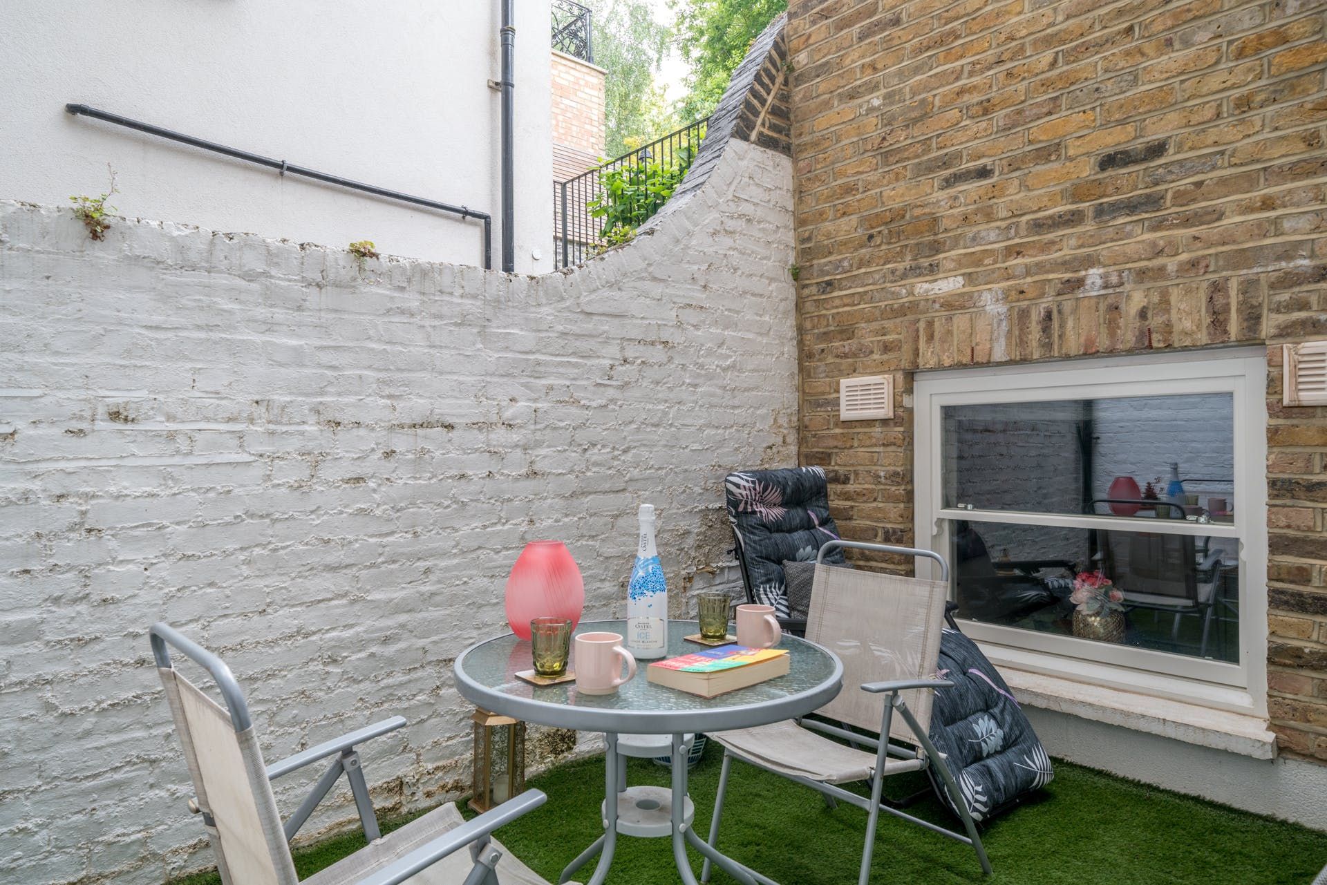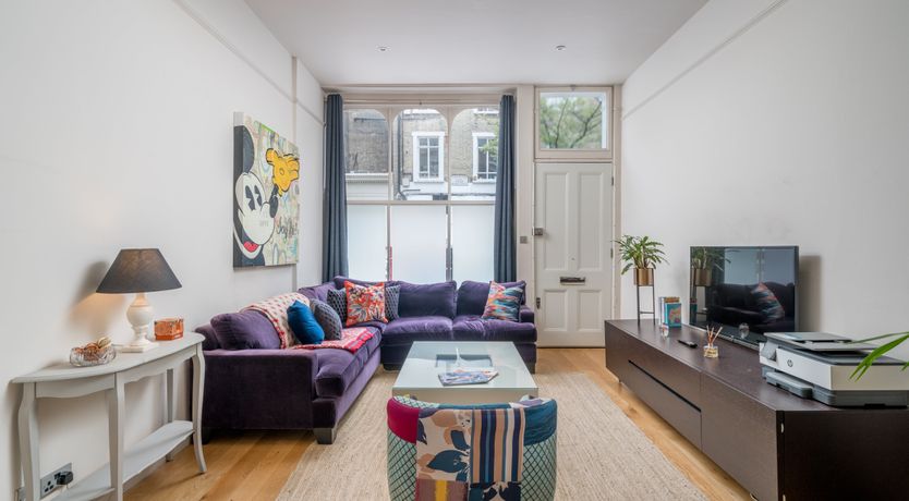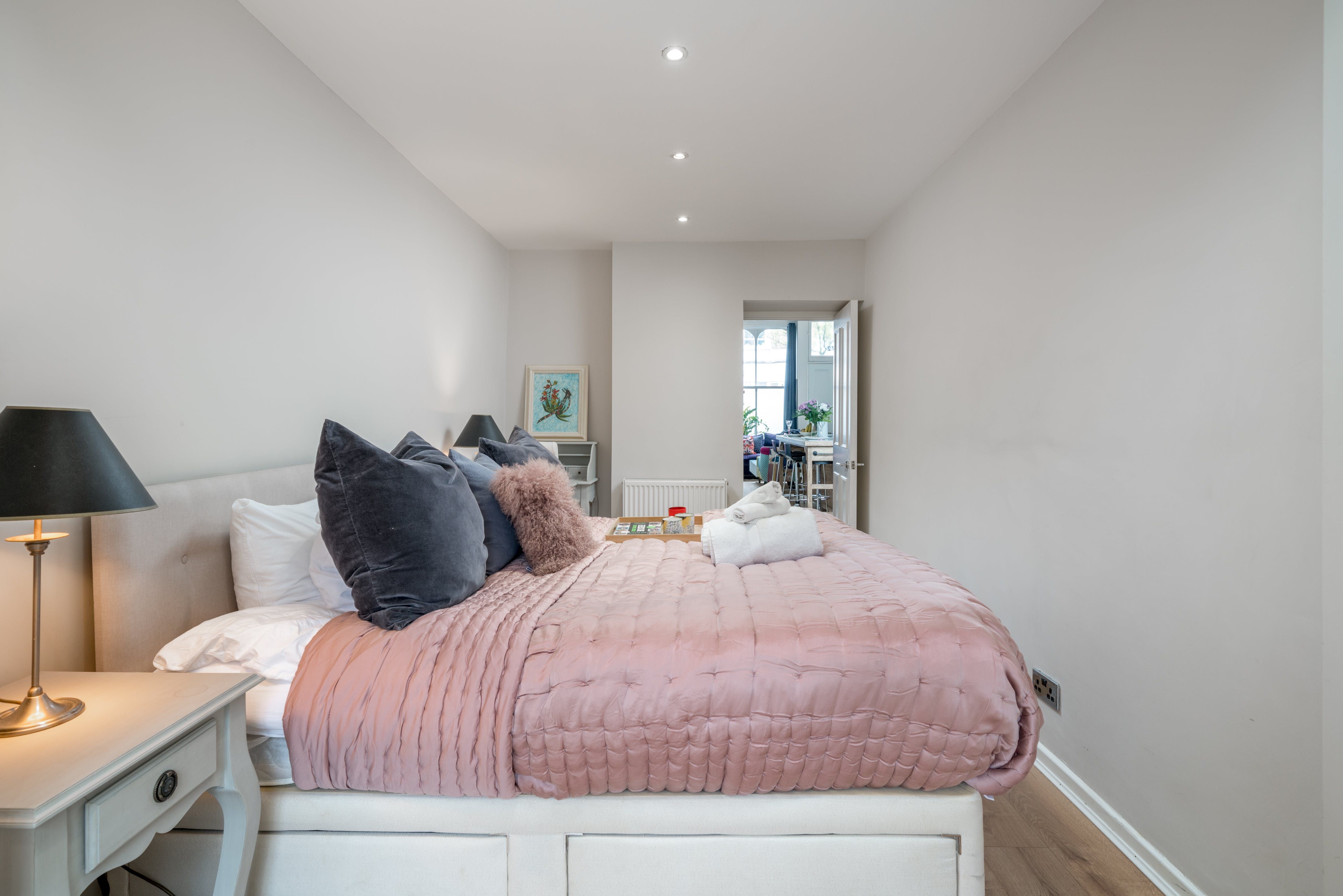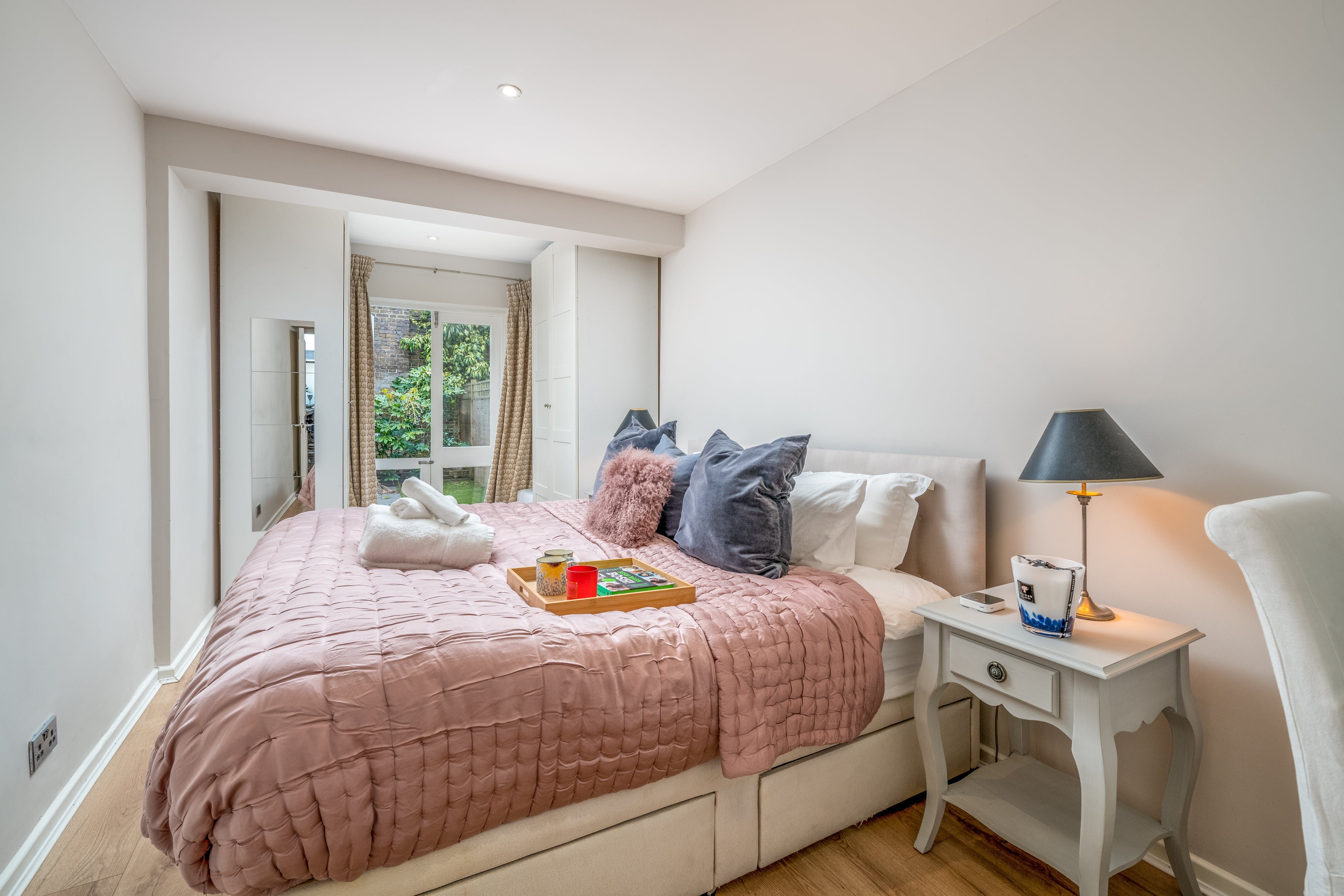 This home, fantastic for groups wanting privacy and space, is made up of two apartments and situated in one of Kensington and Chelsea's most lively areas. You'll walk in from the street level into a light and airy living space, sumptuous violet sofa and an open-plan kitchen space fitted with a breakfast bar for sociable cooking. This top apartment has a double bedroom on the same level, and a west-facing lawned terrace at the back. You'll have tranquil summer evenings out here thanks to there being no opposite neighbours - a rare feat in the city - just Brompton Cemetery behind the garden wall and perhaps the distant rattle of the train line beyond. Into the lower-ground floor level apartment is a spacious living-dining room, another kitchen, two more double bedrooms and a second little terrace for a morning coffee. We think it's a great choice whether you're travelling with family or as a large friend group. The location is great, placing you within walking distance of nearby shops and restaurants. You're an eight-minute walk to both West Brompton and Earls Court stations for connections in and out of the city.