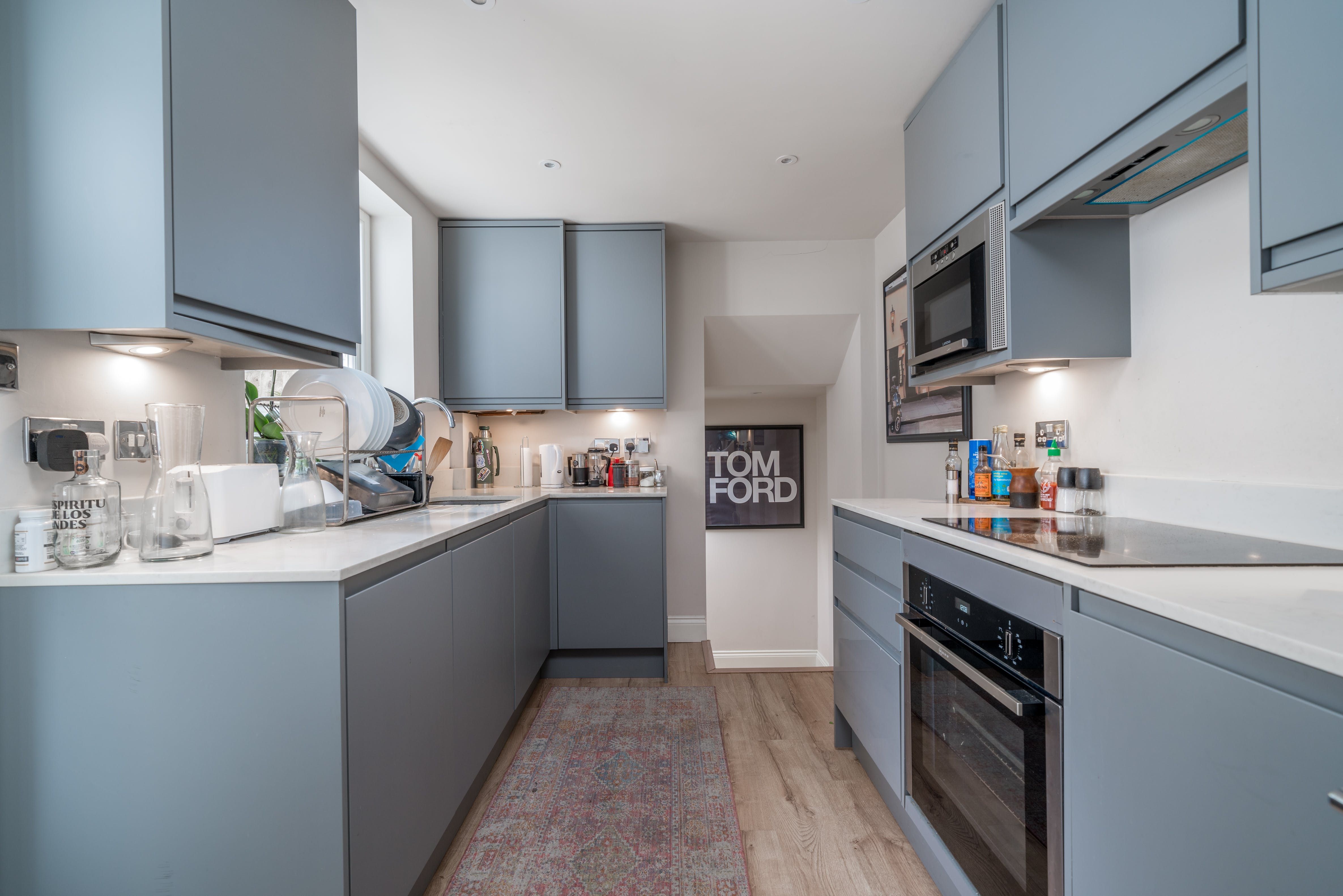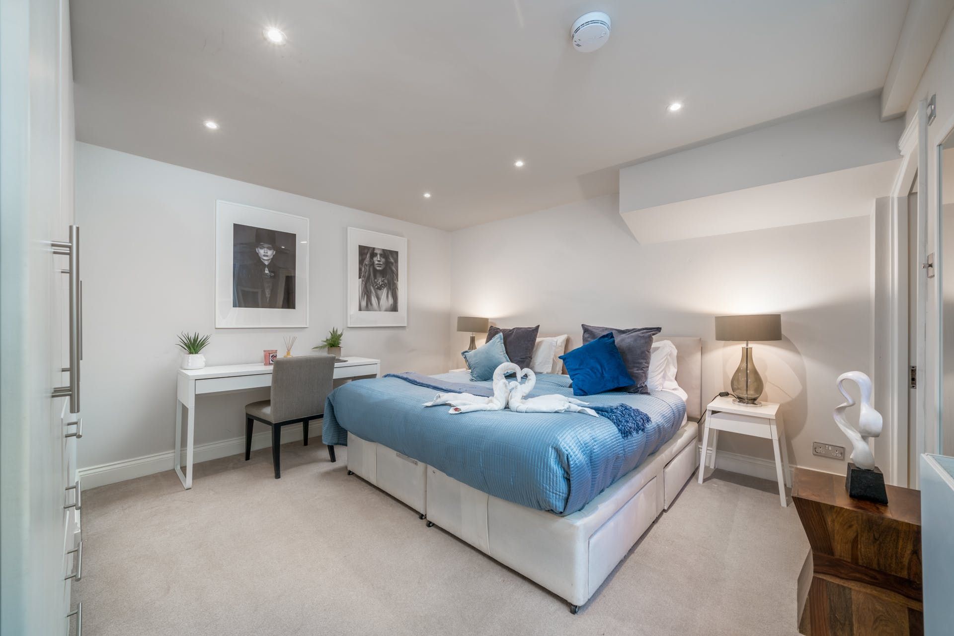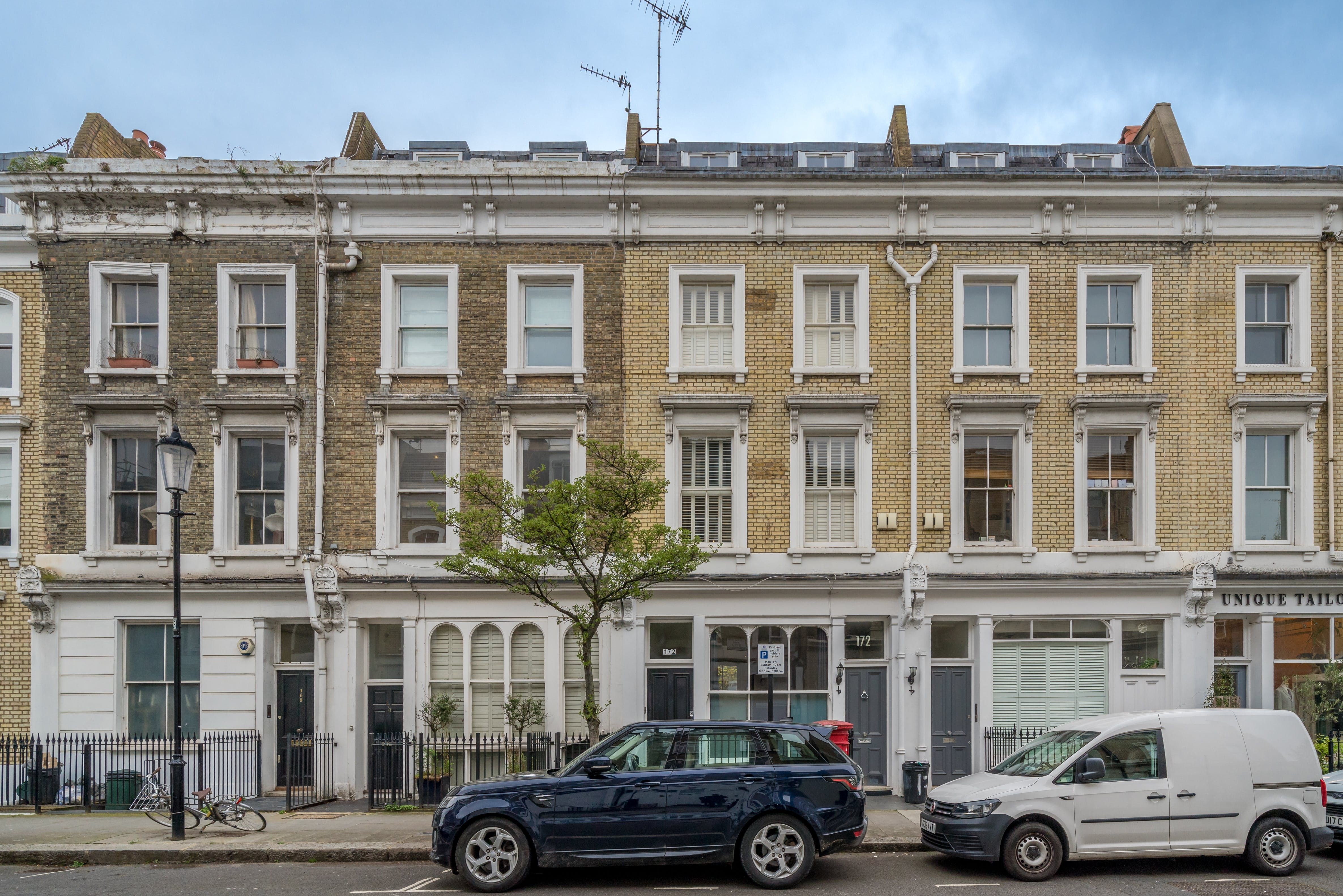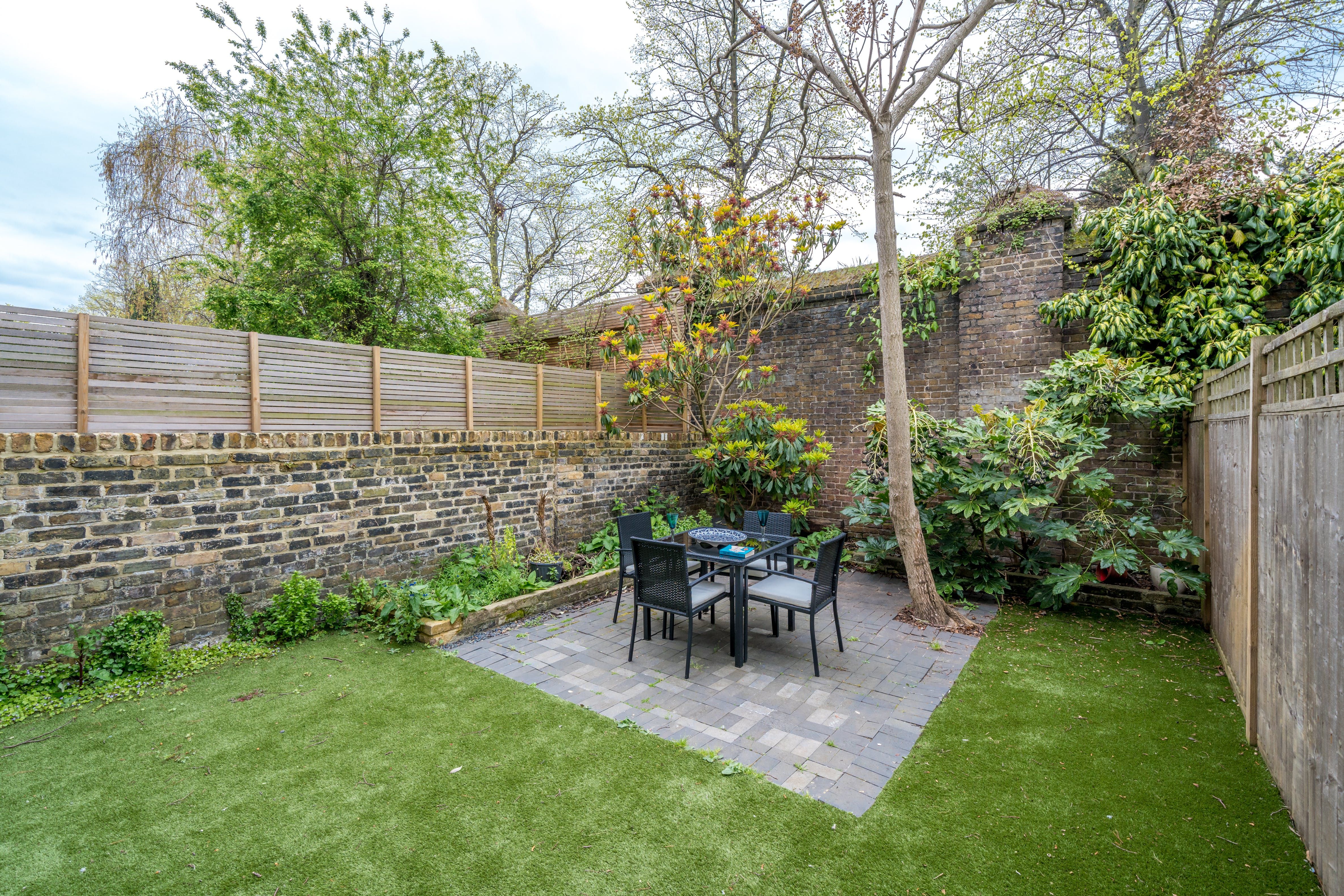 This home, fantastic for groups wanting privacy and space, is made up of two apartments and situated in one of Kensington and Chelsea's most lively areas. You'll walk in from the street level into a light and airy living space, sumptuous violet sofa and an open-plan kitchen space fitted with a breakfast bar for sociable cooking. This top apartment has a double bedroom on the same level, and a west-facing lawned terrace at the back. You'll have tranquil summer evenings out here thanks to there being no opposite neighbours - a rare feat in the city - just Brompton Cemetery behind the garden wall and perhaps the distant rattle of the train line beyond. Into the lower-ground floor level apartment is a spacious living-dining room, another kitchen, two more double bedrooms and a second little terrace for a morning coffee. We think it's a great choice whether you're travelling with family or as a large friend group. The location is great, placing you within walking distance of nearby shops and restaurants. You're an eight-minute walk to both West Brompton and Earls Court stations for connections in and out of the city.