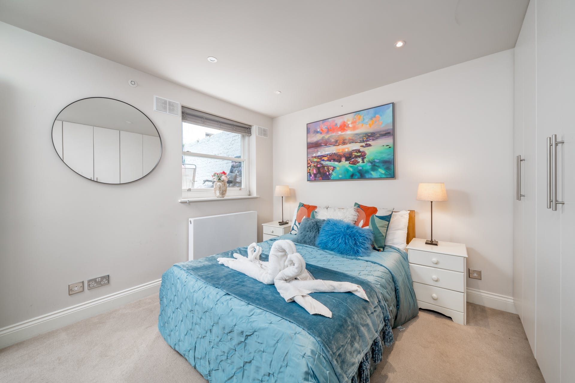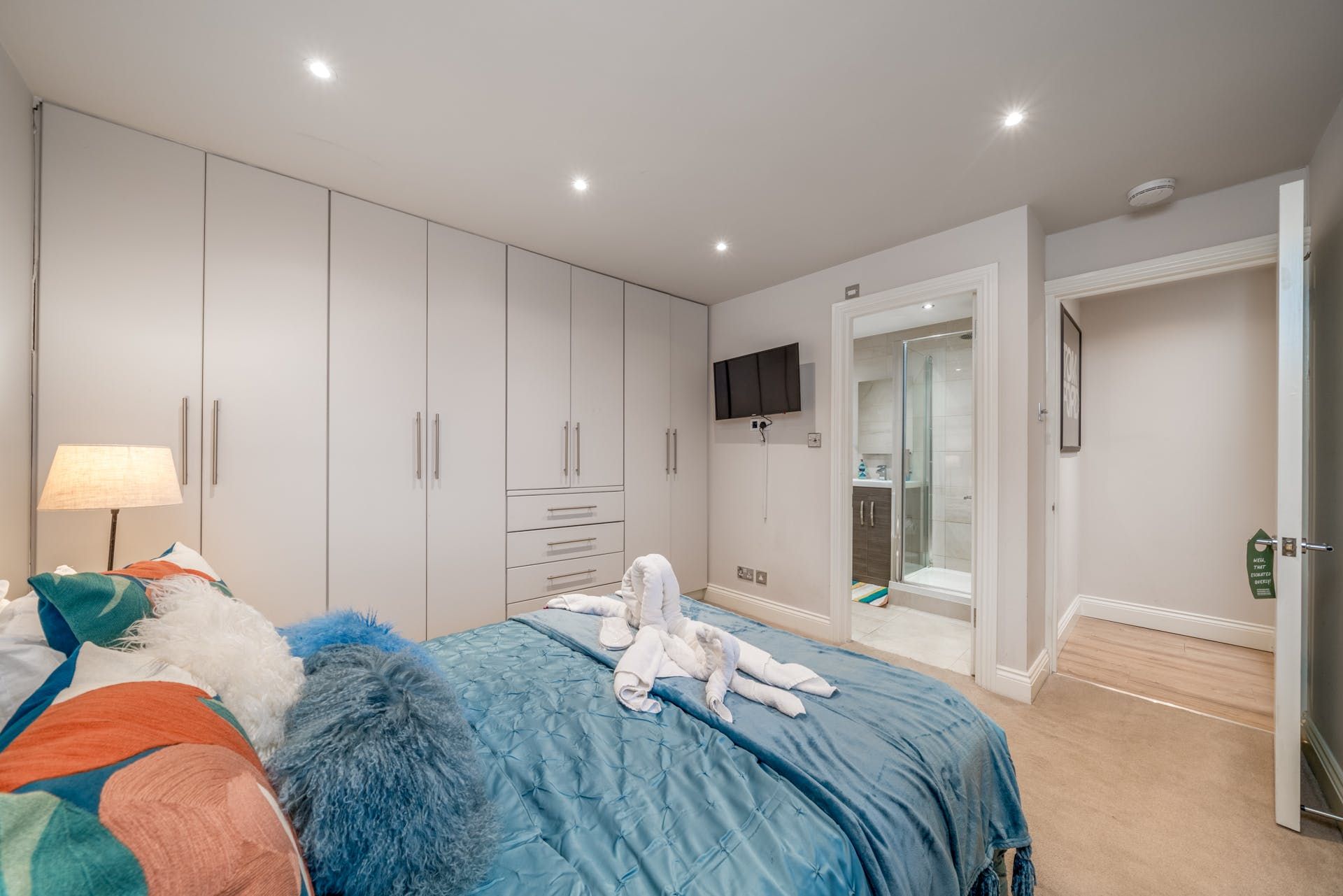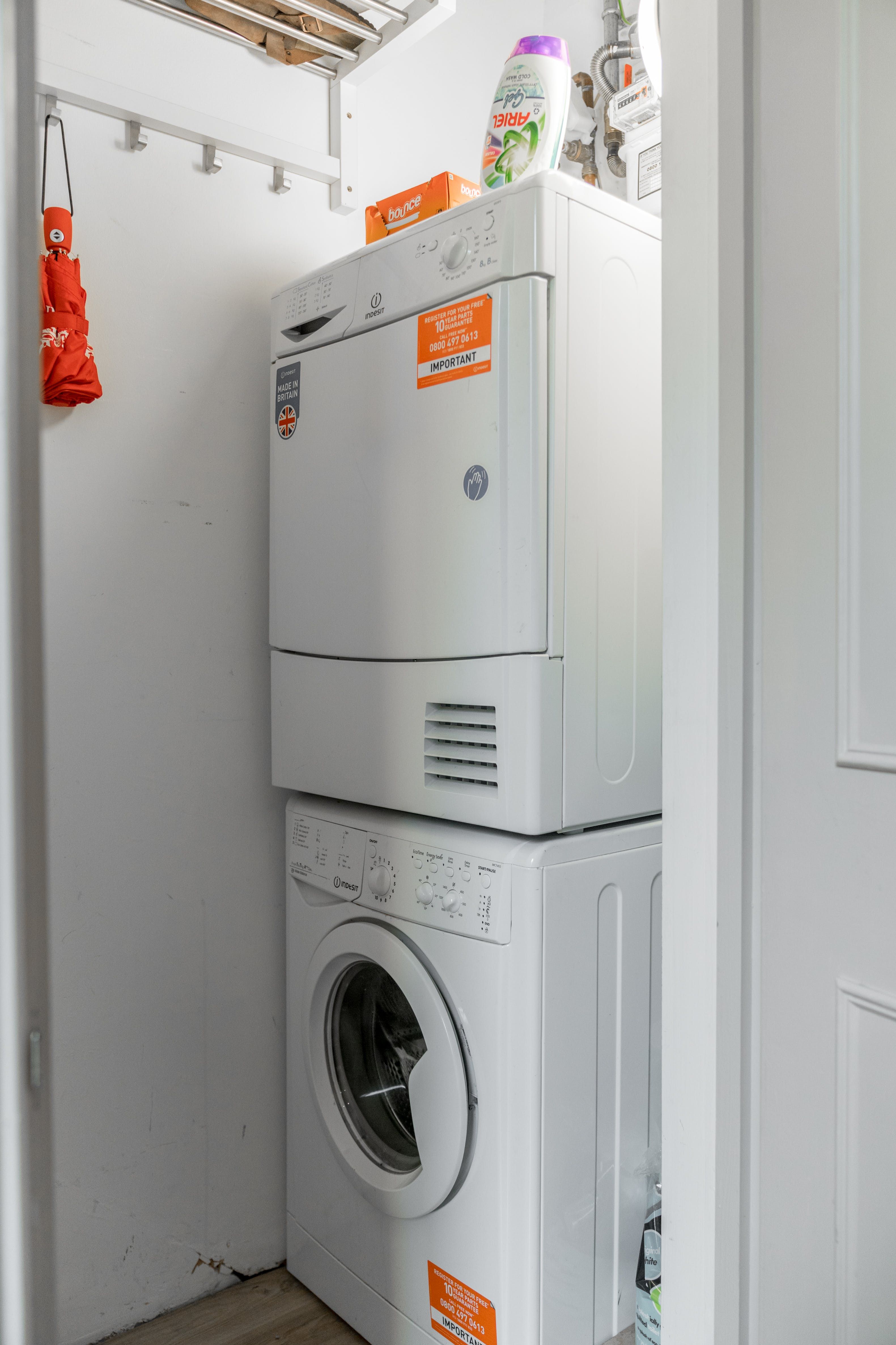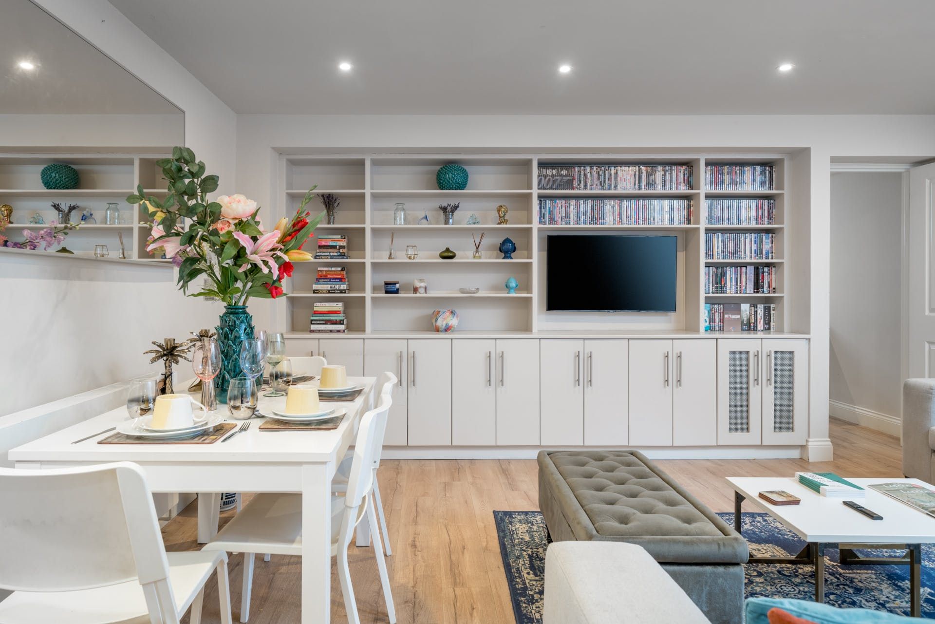 This home, fantastic for groups wanting privacy and space, is made up of two apartments and situated in one of Kensington and Chelsea's most lively areas. You'll walk in from the street level into a light and airy living space, sumptuous violet sofa and an open-plan kitchen space fitted with a breakfast bar for sociable cooking. This top apartment has a double bedroom on the same level, and a west-facing lawned terrace at the back. You'll have tranquil summer evenings out here thanks to there being no opposite neighbours - a rare feat in the city - just Brompton Cemetery behind the garden wall and perhaps the distant rattle of the train line beyond. Into the lower-ground floor level apartment is a spacious living-dining room, another kitchen, two more double bedrooms and a second little terrace for a morning coffee. We think it's a great choice whether you're travelling with family or as a large friend group. The location is great, placing you within walking distance of nearby shops and restaurants. You're an eight-minute walk to both West Brompton and Earls Court stations for connections in and out of the city.