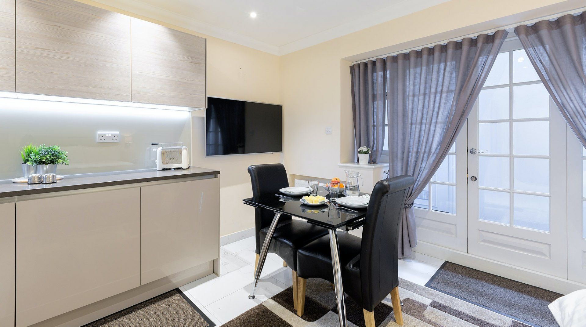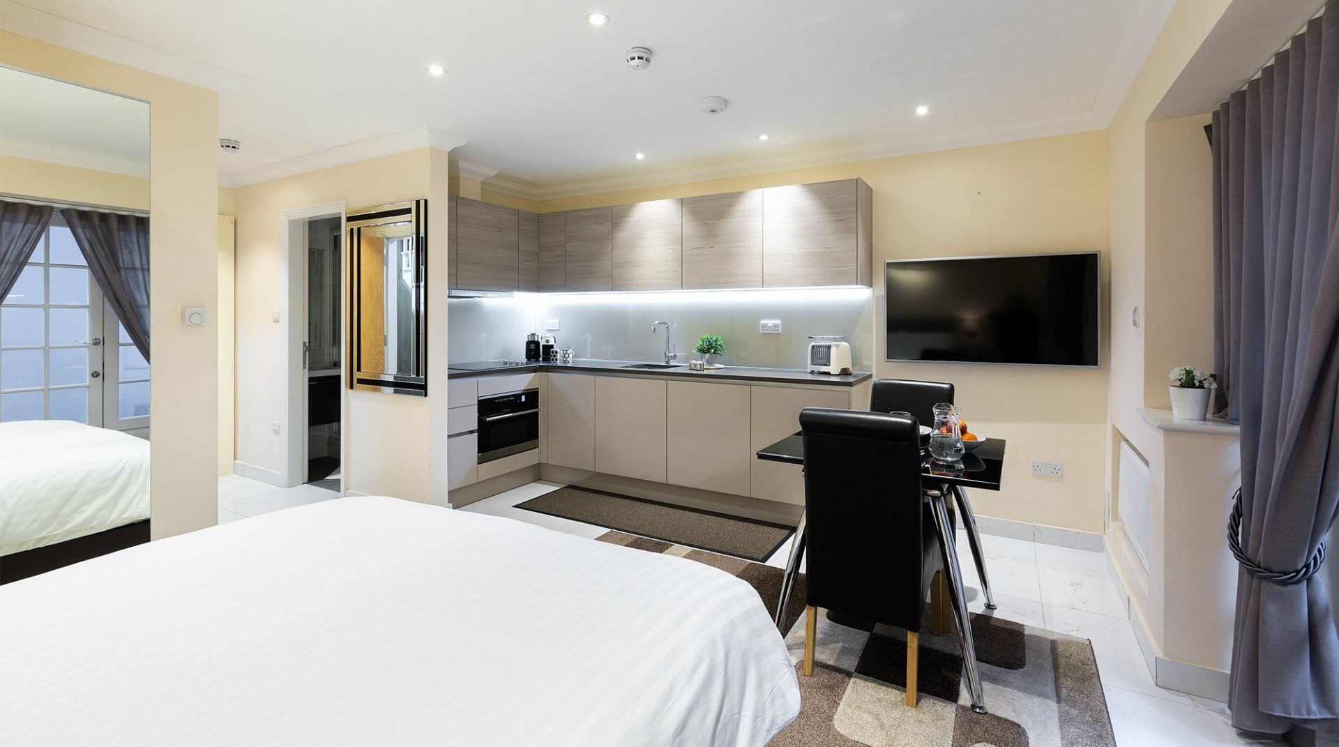 If you're looking for an enviable location in the heart of affluent Central London, then this swanky apartment is the perfect spot for you. Nestled in the middle of Marylebone, take the ten-minute walk to beautiful Regent's Park – from here, you're only a further fifteen minutes from upscale shopping at Regent's and Oxford St. For a fun trip out, stroll down to Madame Tussauds in eleven minutes, or simply go for a wander around the immediate neighbourhood, browsing luxury apartments, highbrow avenues and flashy foreign cars. Designed for comfortable short stays, the interior is modern and minimalist – there's an elegant dining area to enjoy breakfast before setting off, complete with a sleek kitchen and smart monochromatic tones. But make no mistake, the unbeatable location and great value makes this home a Plum-worthy bolthole.