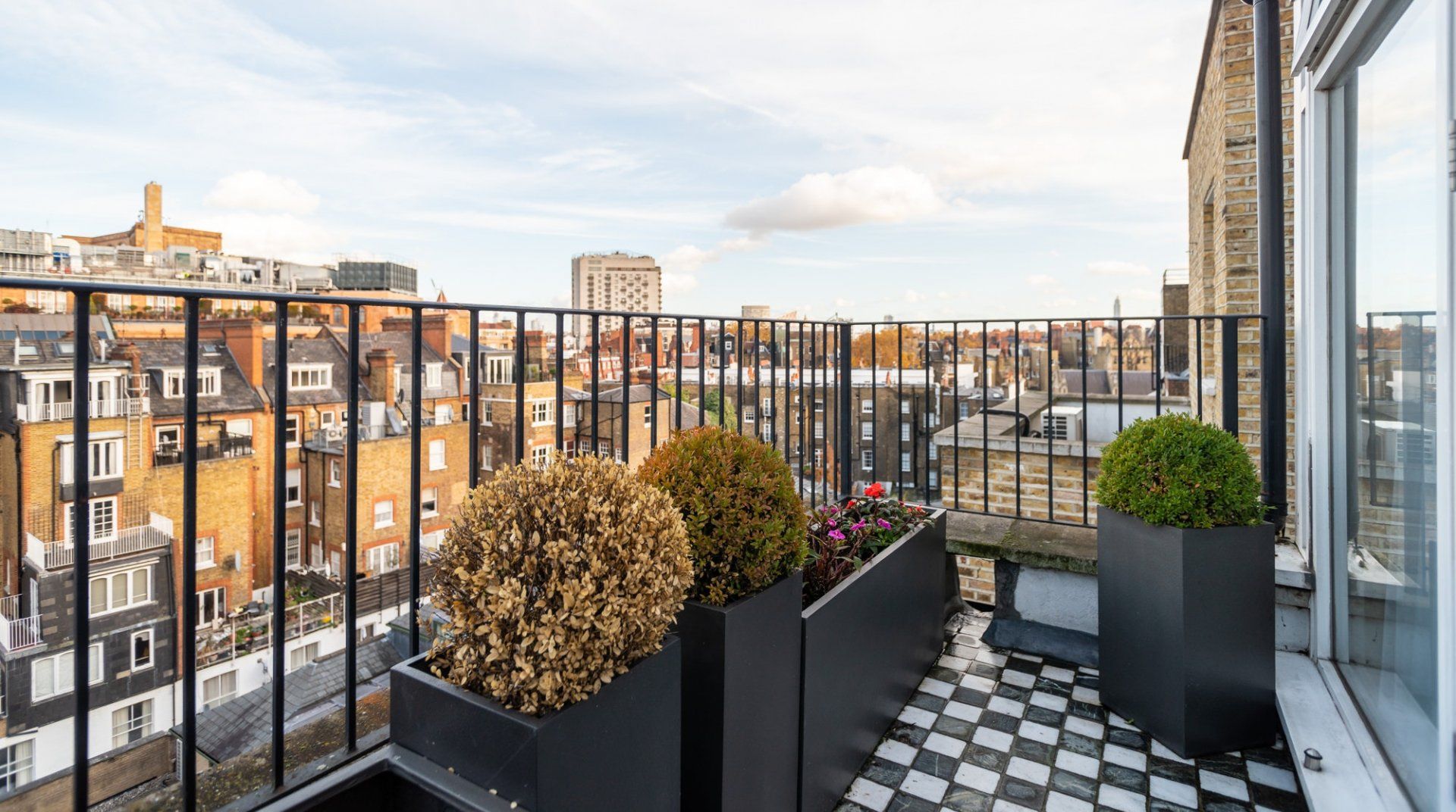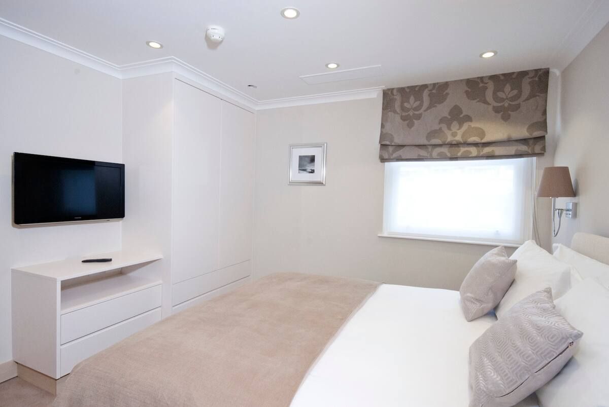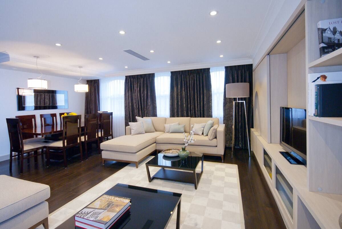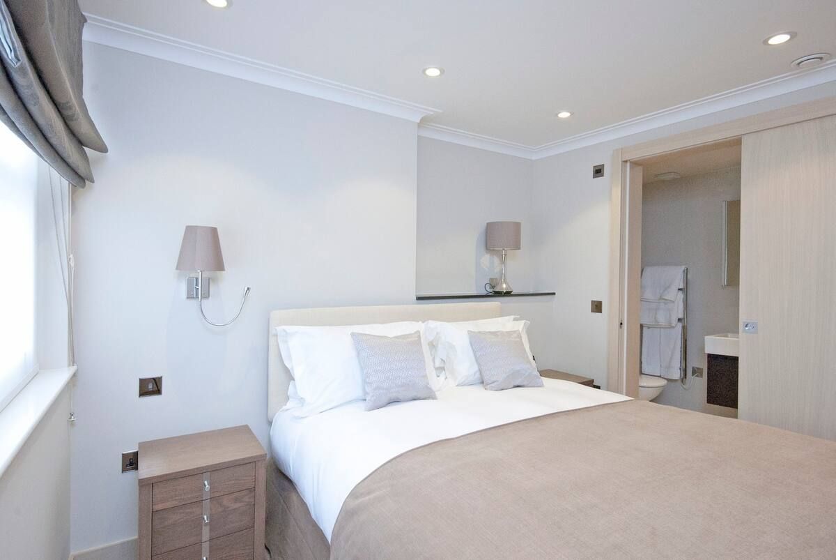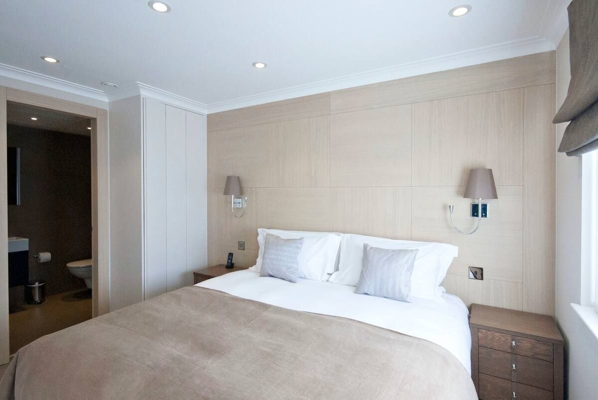 Based in the heart of sought-after Knightsbridge, this apartment's interiors emanate the affluent surroundings. From glass pendant chandeliers in the living room to the marble, walnut flooring – you'll be met by an air of refinement and sophistication upon arrival. Sprawl out in the large, light-filled lounge with soft furnishings and neutral tones that make for a relaxing spot to unwind after a day roaming the leafy garden squares and grand Victorian houses below. But the star of the show has to be the private balcony, overlooking beautiful views over London. We can think of nowhere better to wake up to the day sipping your morning coffee. Stepping back in through the elegant patio doors, sit down for breakfast in the tranquil conservatory, before setting off. This home will suit anyone wanting to be within walking distance of Harrods (five minutes) and Sloane Square (sixteen minutes). Take a wander through vast Hyde Park, just a ten-minute stroll away, before immersing yourself in the well-to-do community, discovering high-end restaurants, classy cafés and swanky bars.