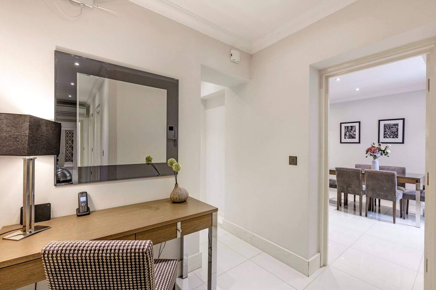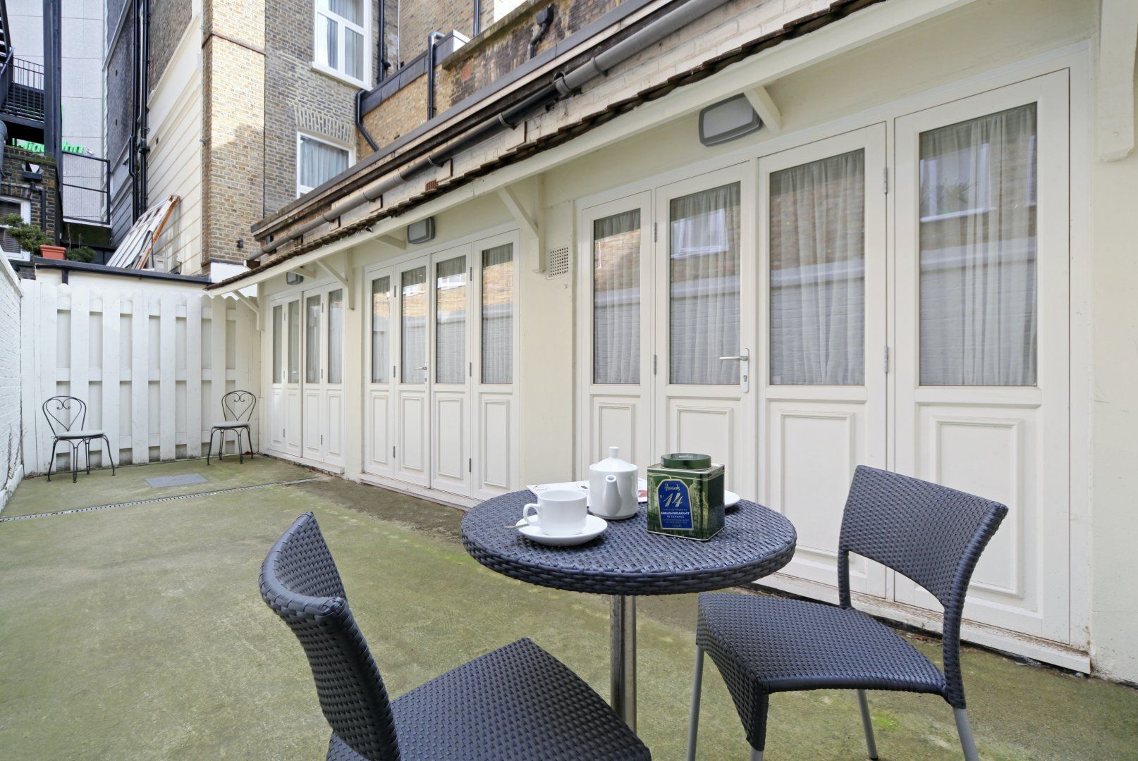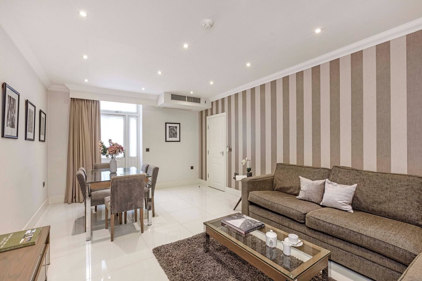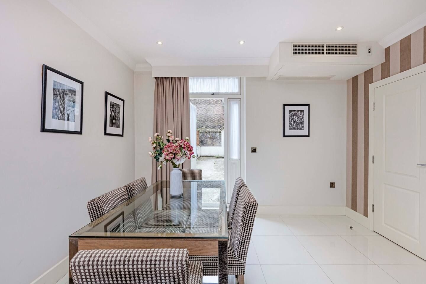 Among the unmistakable Georgian facades of one of London’s most desirable boroughs, this Kensington apartment is a plush home from home for a family or small group of friends looking to tick off the city’s most iconic sights. The interiors are understated and comfortable with a touch of drama courtesy of the eye-catching feature walls. The cream and mocha colour scheme sets the tone for relaxing on the corner sofa with indulgent treats from your neighbourhood’s luxe food halls – Harrods is a fifteen-minute tube ride away. A generous communal outdoor patio area – a welcome rarity for the postcode – is the ideal spot for morning espressos and evening bubbles when the weather is right. Situated a fifteen-minute walk along Cromwell Road to the fascinating Museum District and a twenty-minute trip on the tube to the centre of the capital, your entire itinerary is within touching distance.
