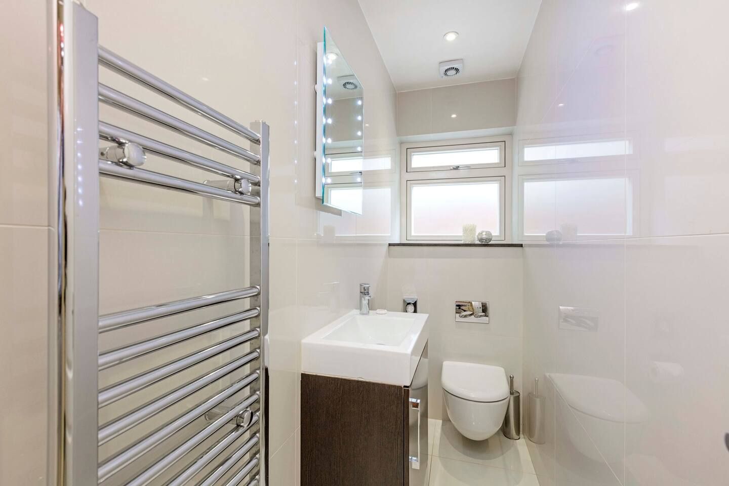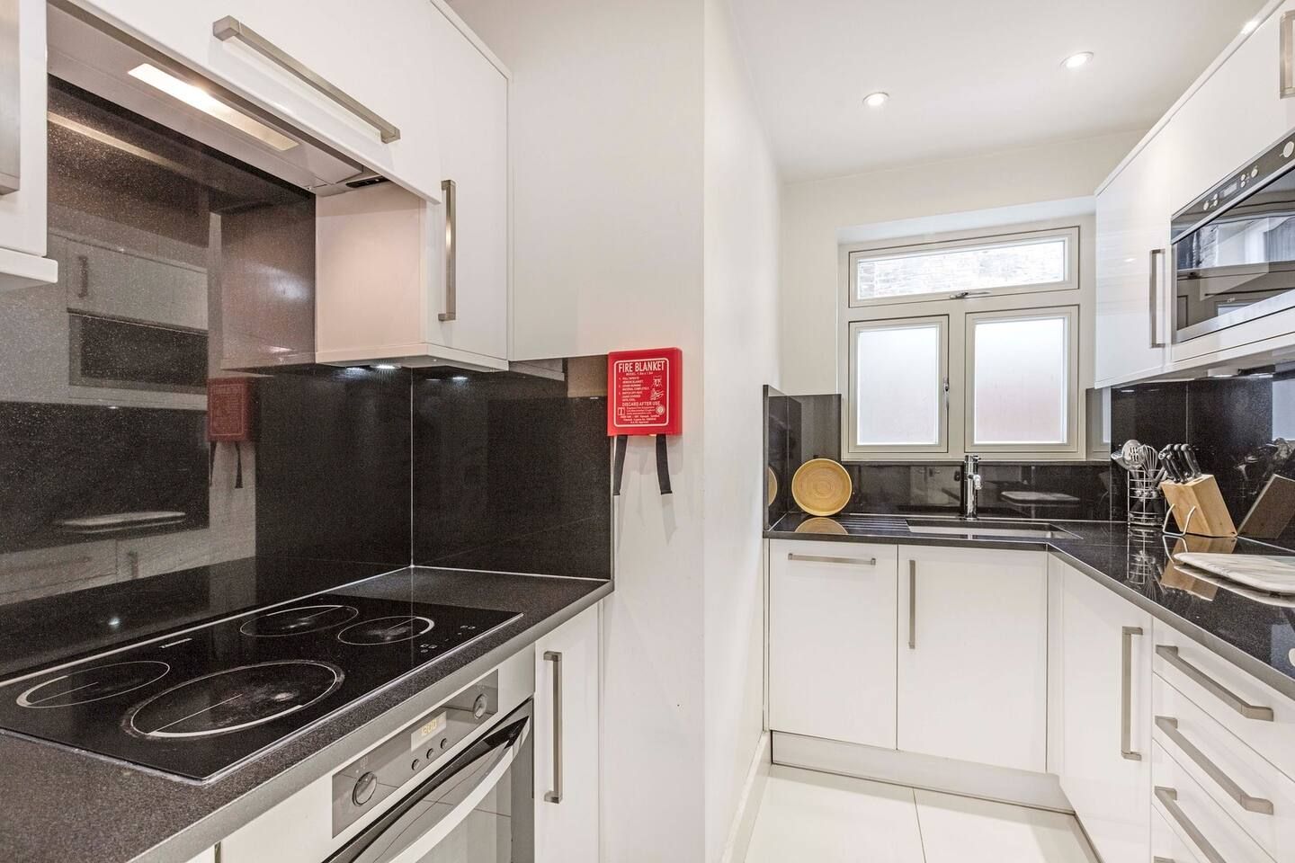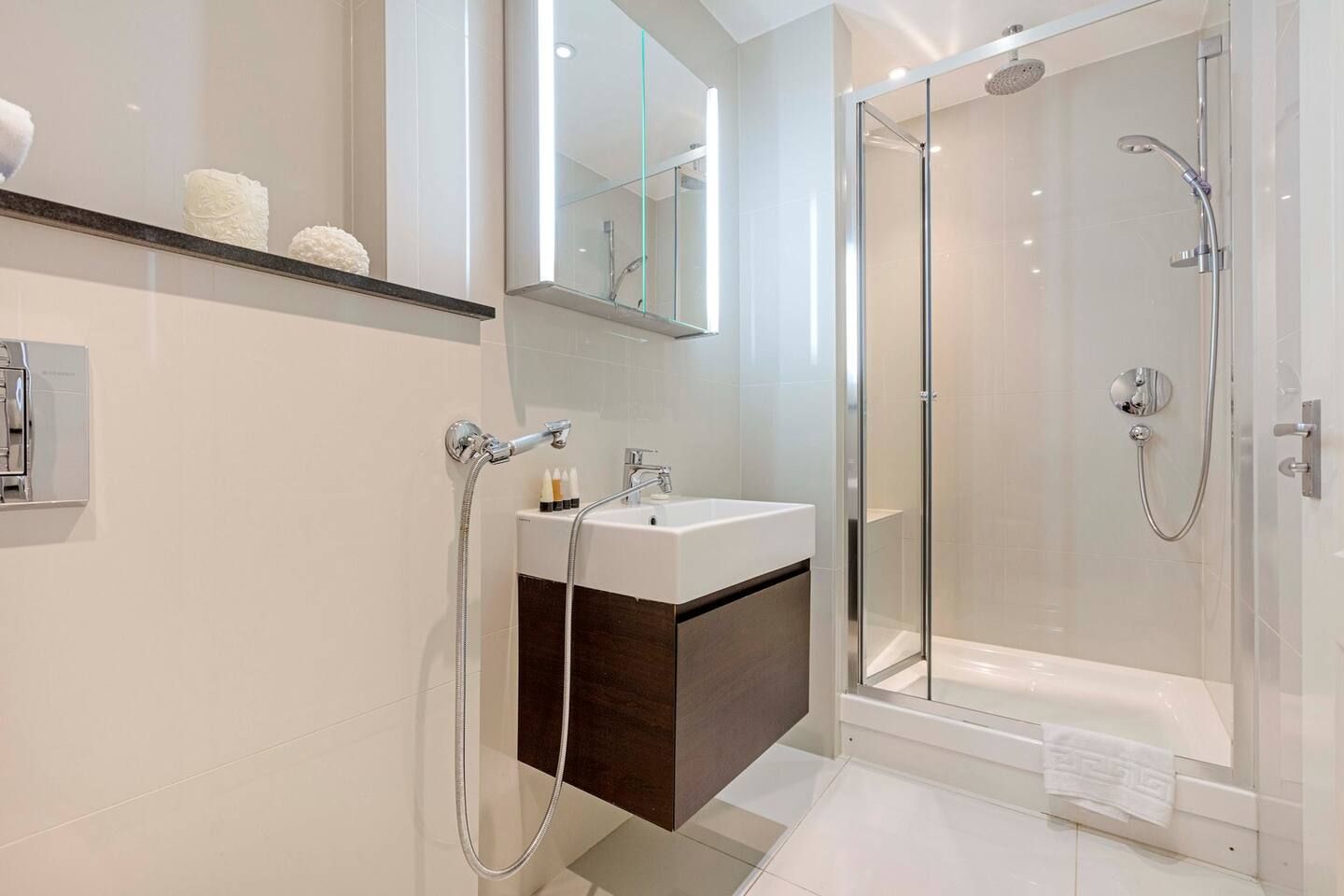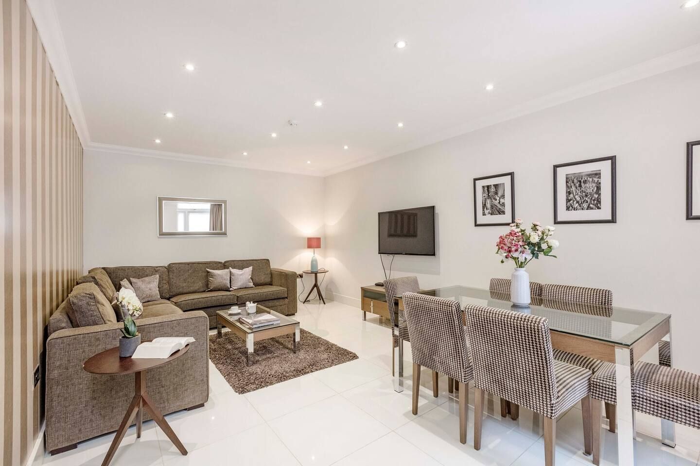 Among the unmistakable Georgian facades of one of London’s most desirable boroughs, this Kensington apartment is a plush home from home for a family or small group of friends looking to tick off the city’s most iconic sights. The interiors are understated and comfortable with a touch of drama courtesy of the eye-catching feature walls. The cream and mocha colour scheme sets the tone for relaxing on the corner sofa with indulgent treats from your neighbourhood’s luxe food halls – Harrods is a fifteen-minute tube ride away. A generous communal outdoor patio area – a welcome rarity for the postcode – is the ideal spot for morning espressos and evening bubbles when the weather is right. Situated a fifteen-minute walk along Cromwell Road to the fascinating Museum District and a twenty-minute trip on the tube to the centre of the capital, your entire itinerary is within touching distance.