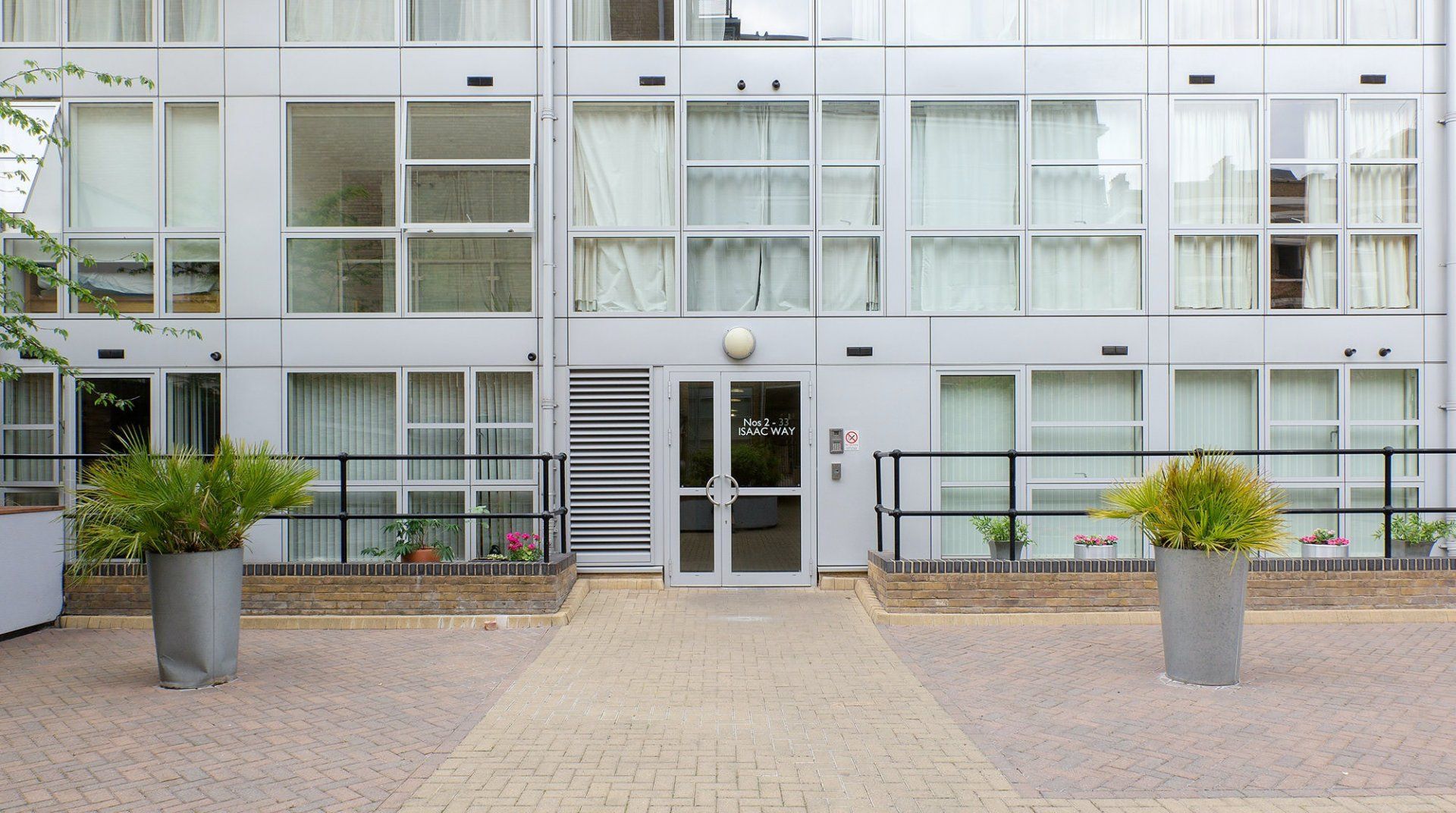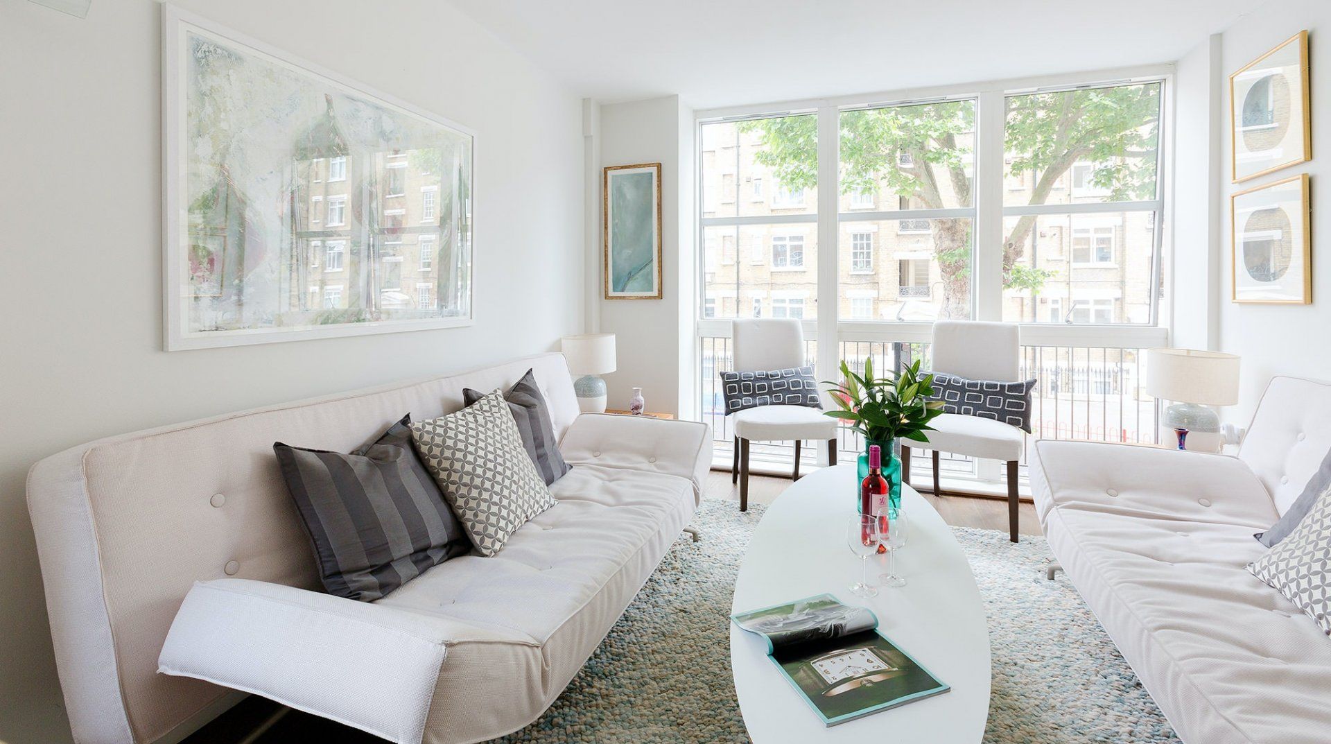 * The living room has a window without blinds which looks onto a courtyard